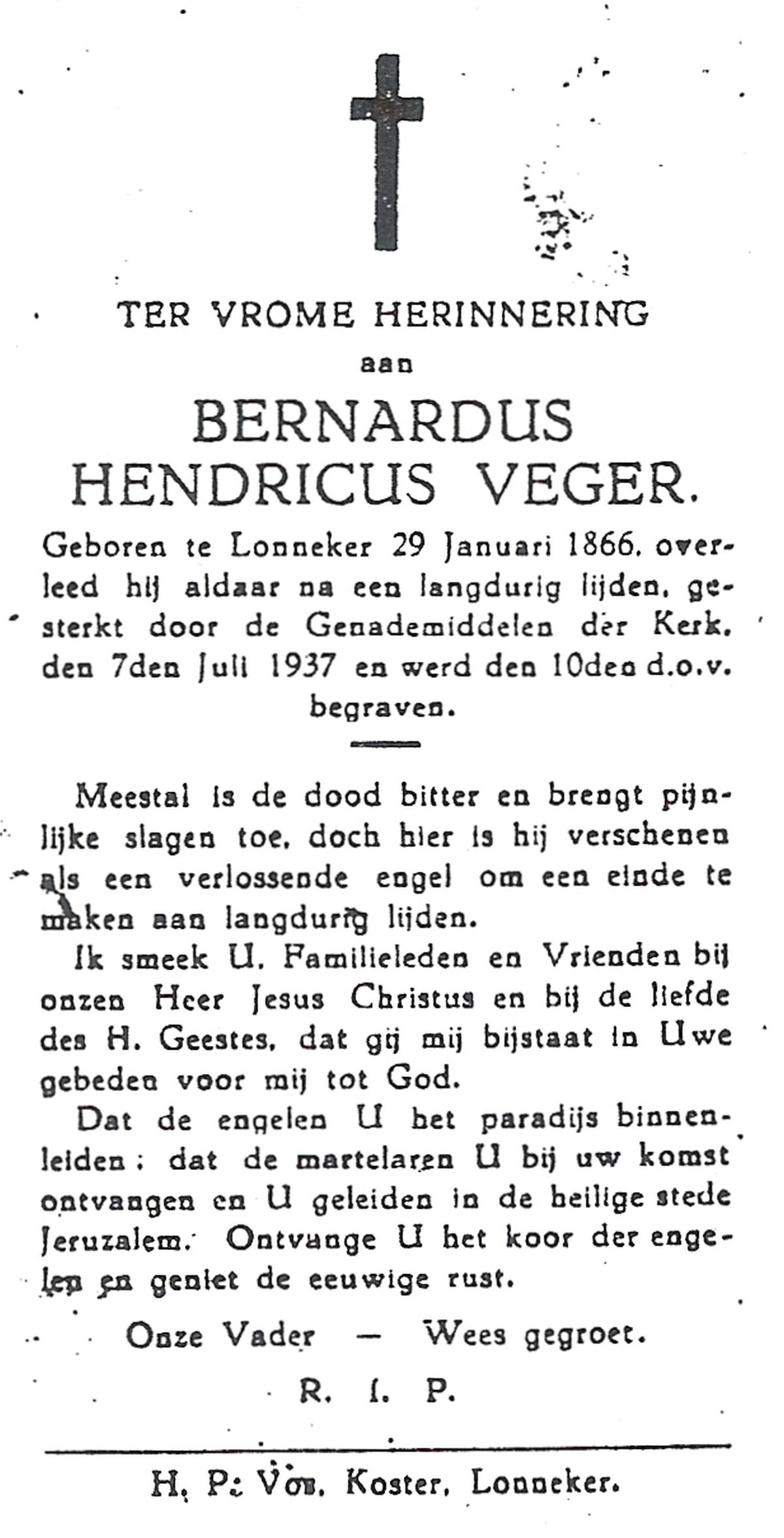 VEGER, Bernardus Hendricus, geboren op 29-01-1866 te Lonneker, overleden op 7-7-1937 te Lonneker op 71-jarige leeftijd, begraven op 10-7-1937 te Lonneker.