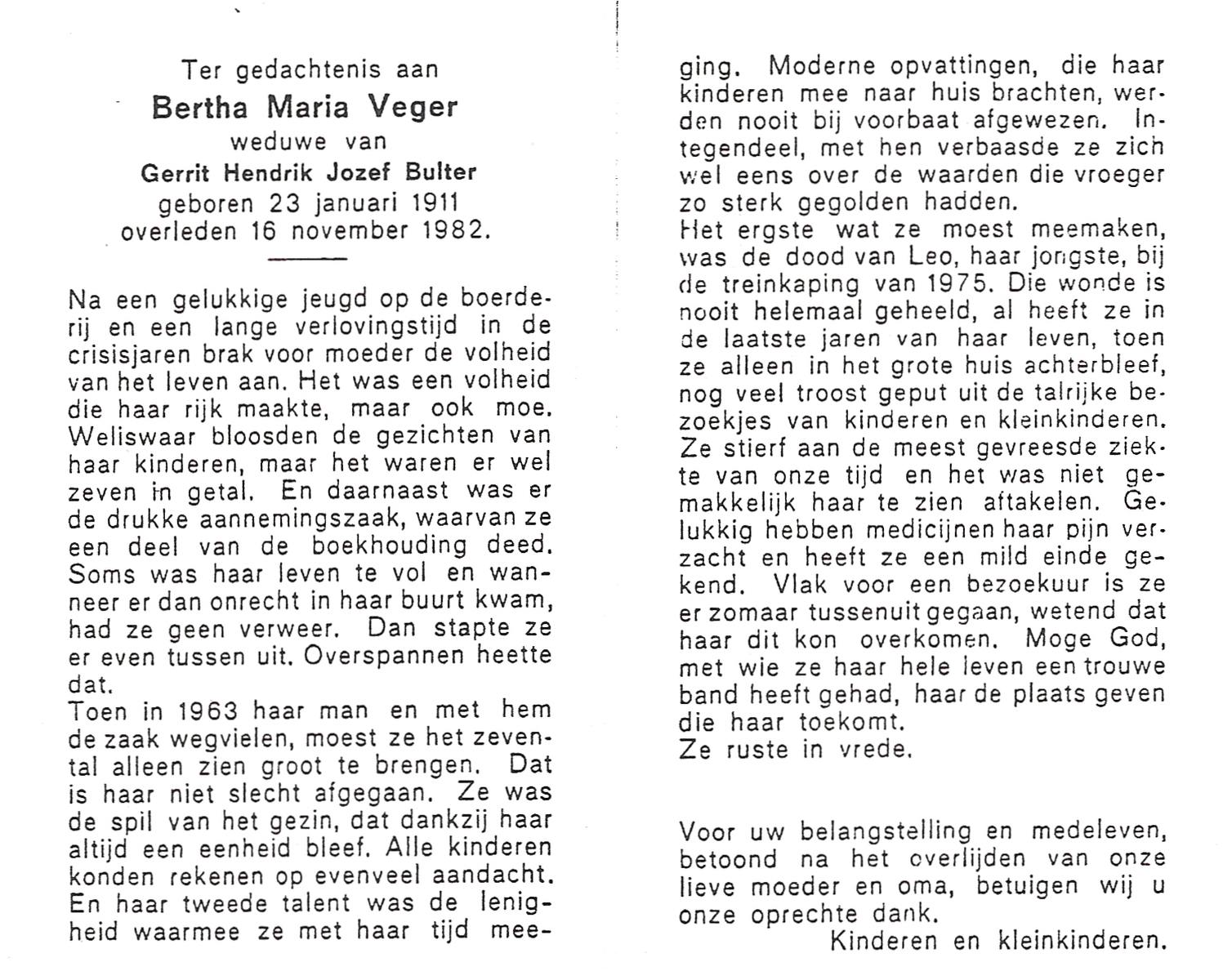 VEGER, Bertha Maria, geboren op 23-1-1911, overleden op 16-11-1982 op 71-jarige leeftijd.