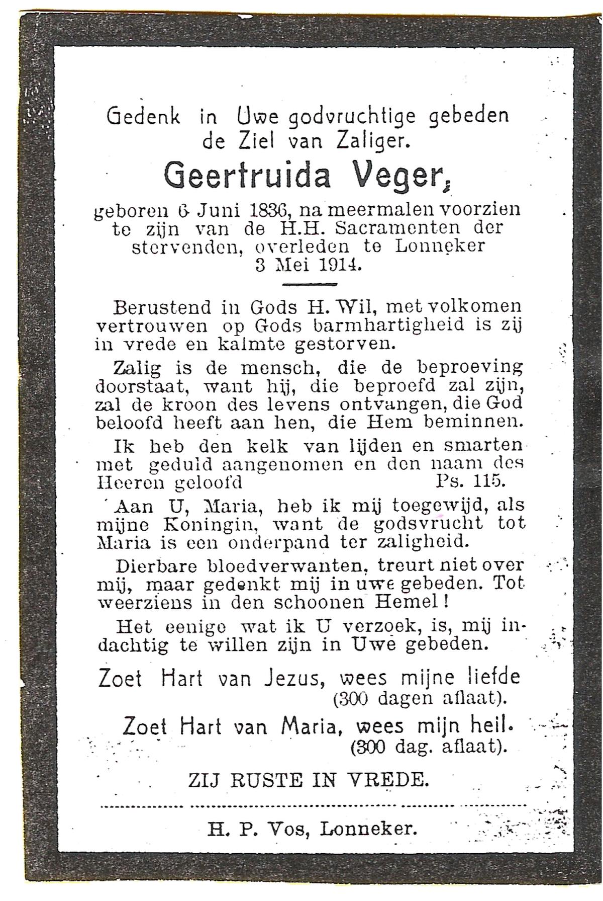 VEGER, Geertruida, geboren op 06-06-1836, overleden op 3-5-1914 te Lonneker op 77-jarige leeftijd.