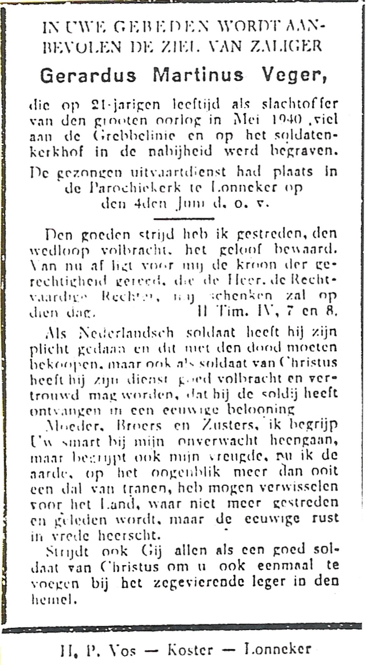 VEGER, Gerardus Martinus, geboren op -, overleden op 00-05-1940 te Grebbelinie op 21-jarige leeftijd, begraven op 4-6-1940 te Lonneker.