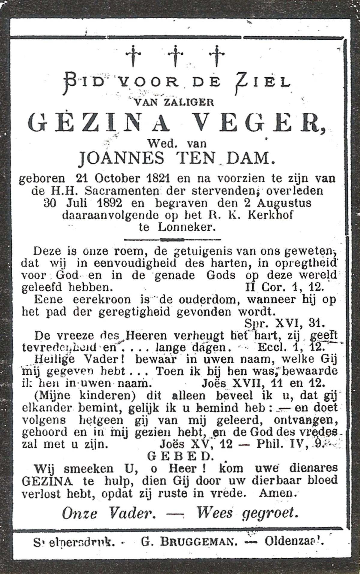 VEGER, Gezina, geboren op 21-10-1821, overleden op 30-07-1892 op 70-jarige leeftijd, begraven op 02-08-1892 te Lonneker R.K.Kerkhof.