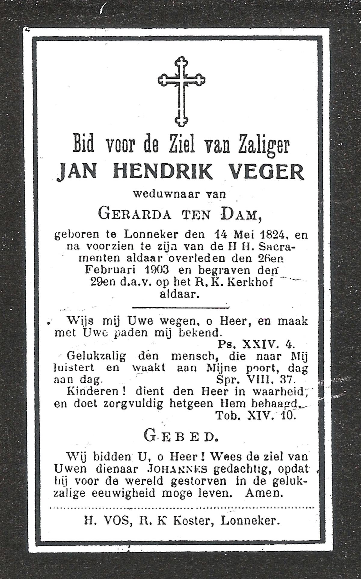 VEGER, Jan Hendrik, geboren op 14-05-1824 te Lonneker, overleden op 26-2-1903 te Lonneker op 78-jarige leeftijd, begraven op 29-02-1903 te Lonneker R.K.Kerkhof.