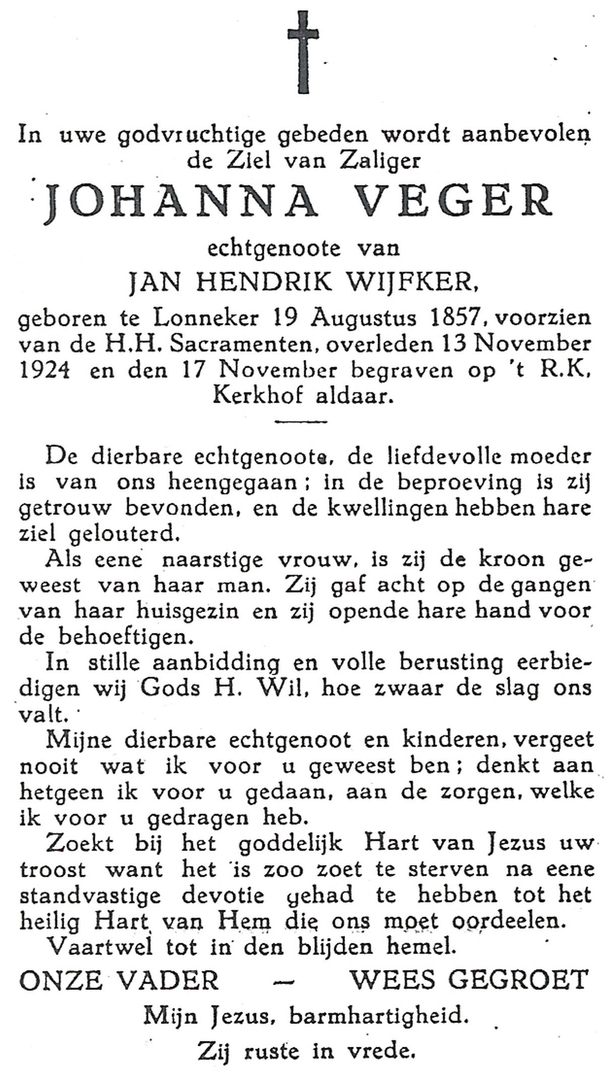 VEGER, Johanna, geboren op 19-08-1857 te Lonneker, overleden op 13-11-1924 te Lonneker op 67-jarige leeftijd, begraven op 17-11-1924 te Lonneker R.K.Kerkhof.