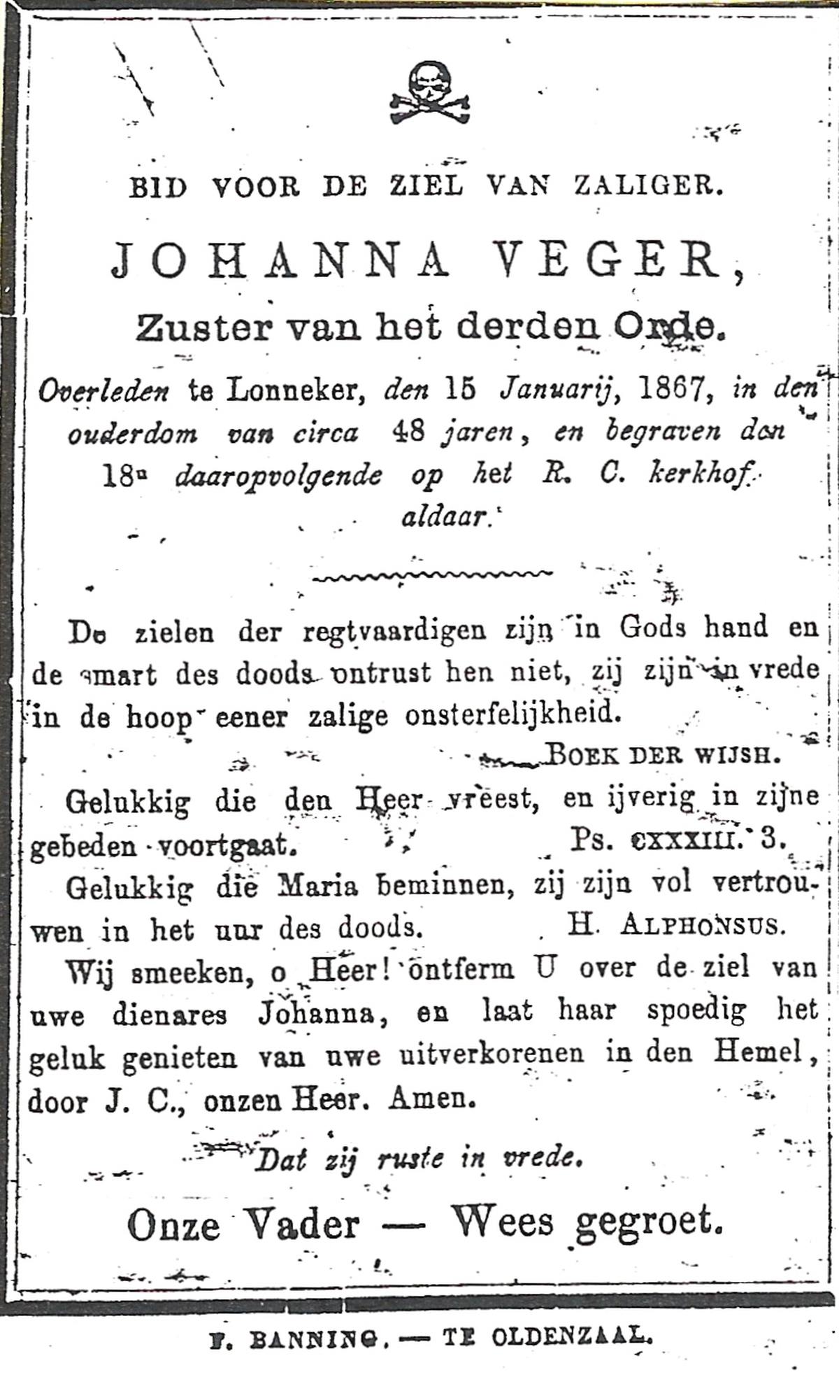 VEGER, Johanna, geboren op -, overleden op 15-01-1867 te Lonneker op 48-jarige leeftijd, begraven op 18-01-1867 te Lonneker R.K.Kerkhof.