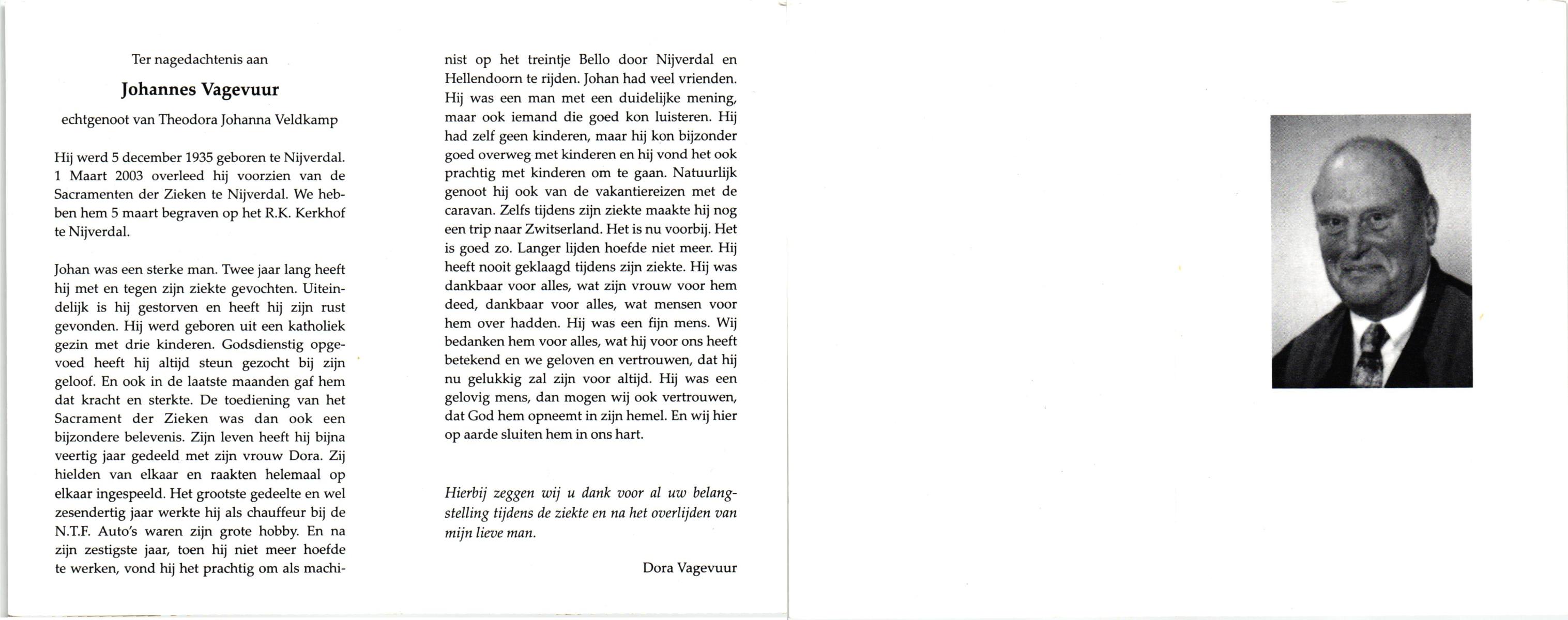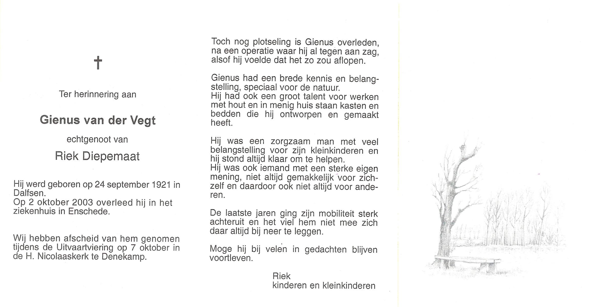 VEGT, van der, Gienus, geboren op 24-9-1921 te Dalfsen, overleden op 2-10-2003 te Enschede op 82-jarige leeftijd, begraven op 7-10-2003 te Denekamp.