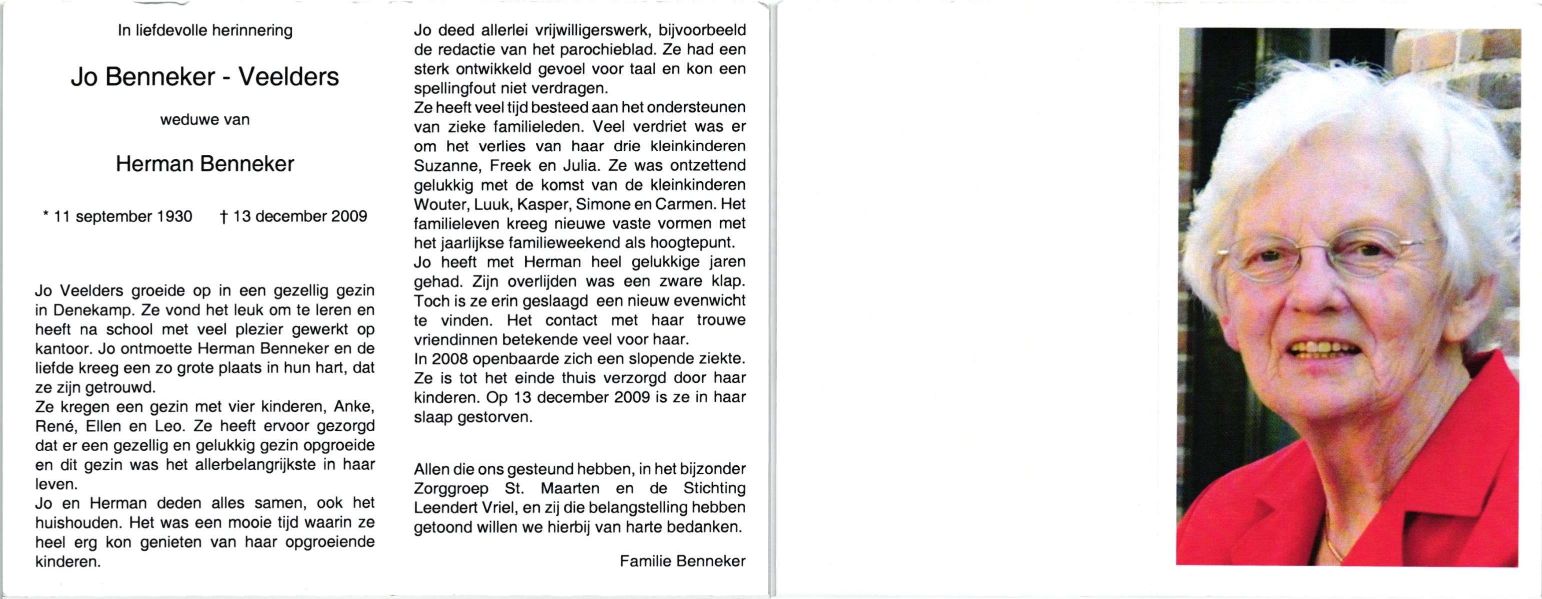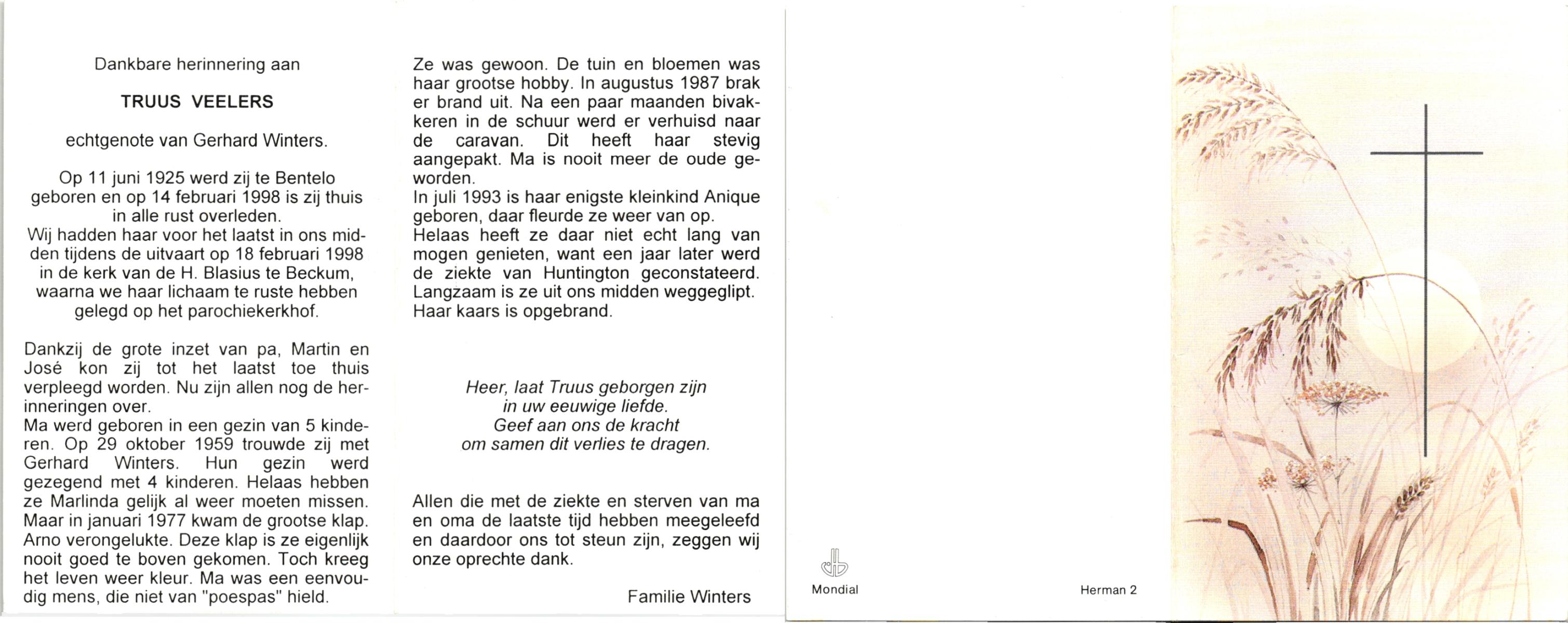 VEELERS, , Truus, geboren op 11-6-1925 te Bentelo, overleden op 14-2-1998 op 72-jarige leeftijd, begraven op 18-2-1998 te Beckum.