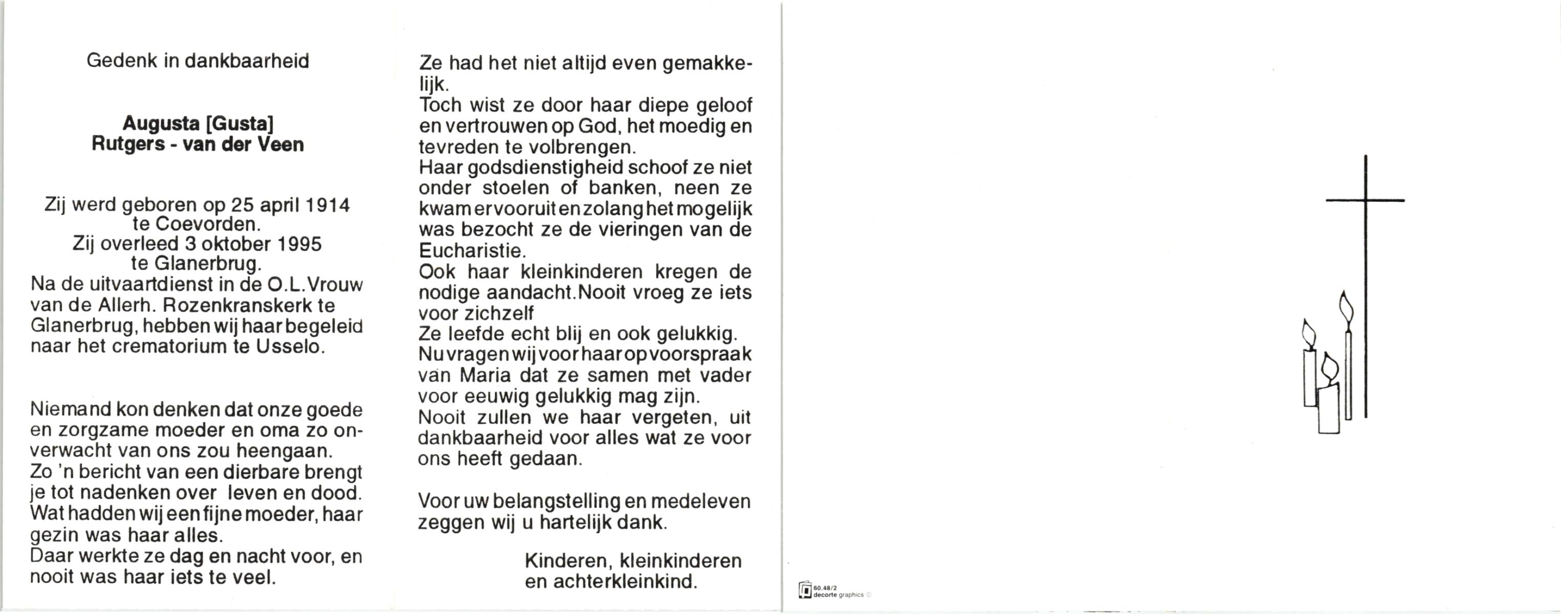 VEEN, van der, Augusta (Gusta), geboren op 25-4-1914 te Coevorden, overleden op 3-10-1995 te Glanerbrug op 81-jarige leeftijd, gecremeerd te Usselo.