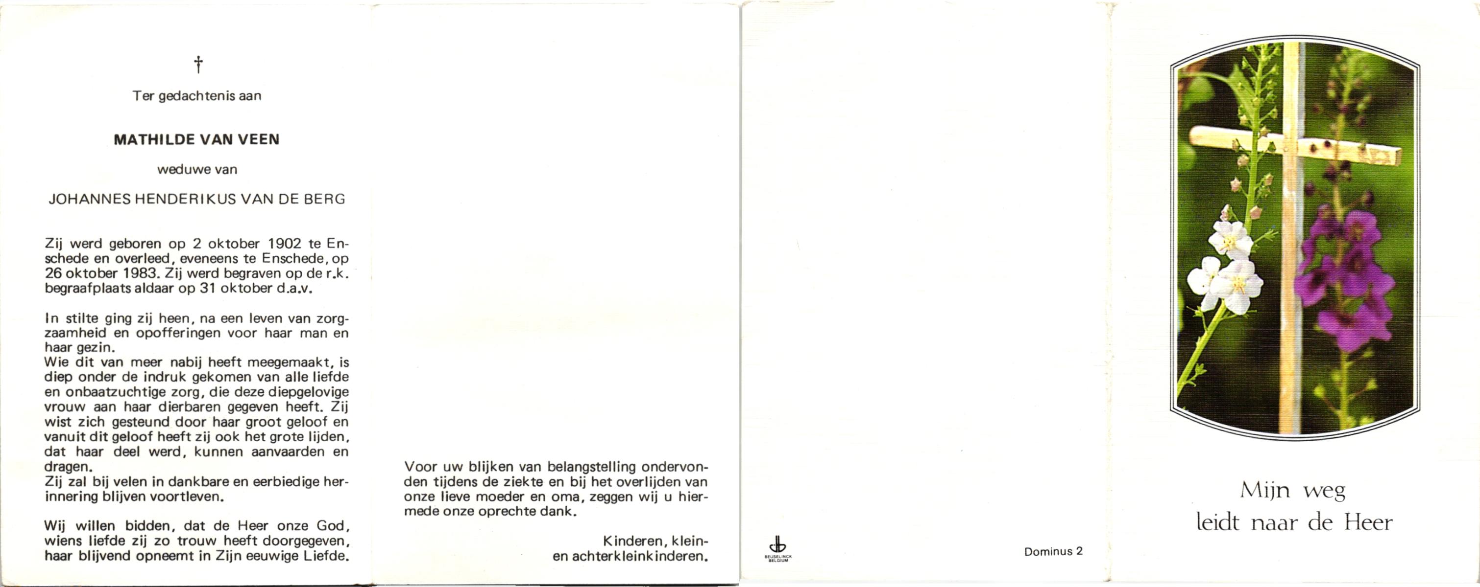 VEEN, van, Mathilde, geboren op 2-10-1902 te Enschede, overleden op 26-10-1983 te Enschede op 81-jarige leeftijd, begraven op 31-10-1983 te Enschede.