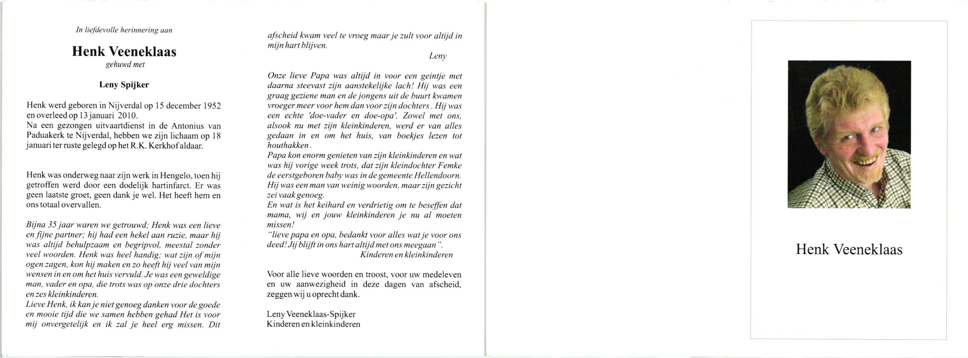 VEENEKLAAS, , Henk, geboren op 15-12-1952 te Hellendoorn, Nijverdal, overleden op 13-1-2010 op 57-jarige leeftijd, begraven op 18-1-2010 te Hellendoorn, Nijverdal, rk.