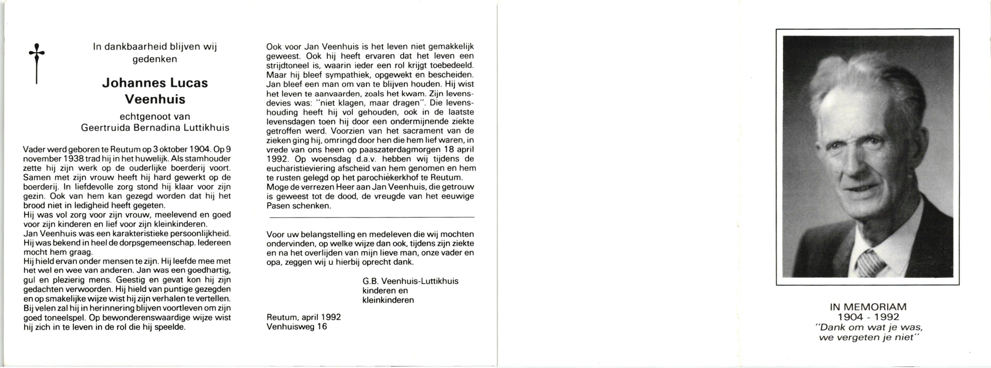 VEENHUIS, , Johannes Lucas, geboren op 3-10-1904 te Reutum, overleden op 18-4-1992 op 87-jarige leeftijd, begraven te Reutum.