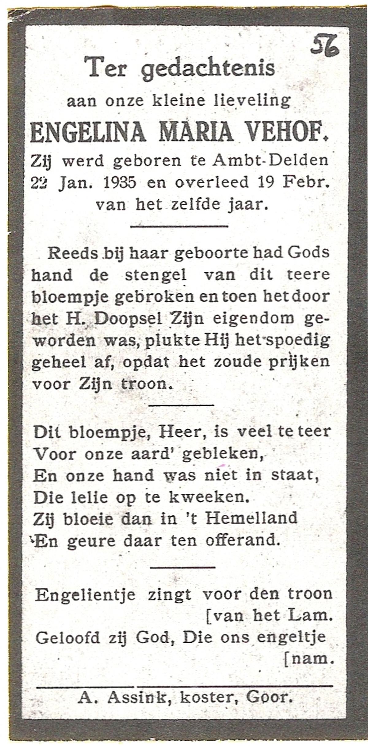 VEHOF, Engelina Maria, geboren op 22-1-1935 te Delden, Ambt, overleden op 19-2-1935 te Delden, Ambt op 0-jarige leeftijd.