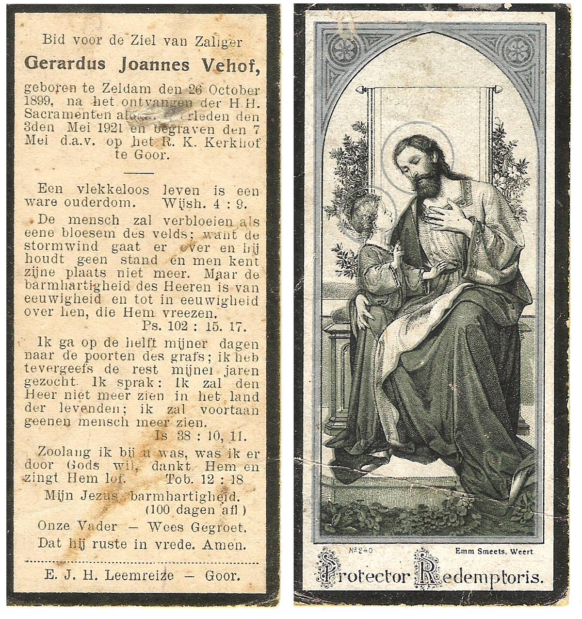 VEHOF, Geradus Joannes, geboren op 26-10-1899 te Zeldam, overleden op 3-5-1921 te Zeldam op 21-jarige leeftijd, begraven op 7-5-1921 te Goor.