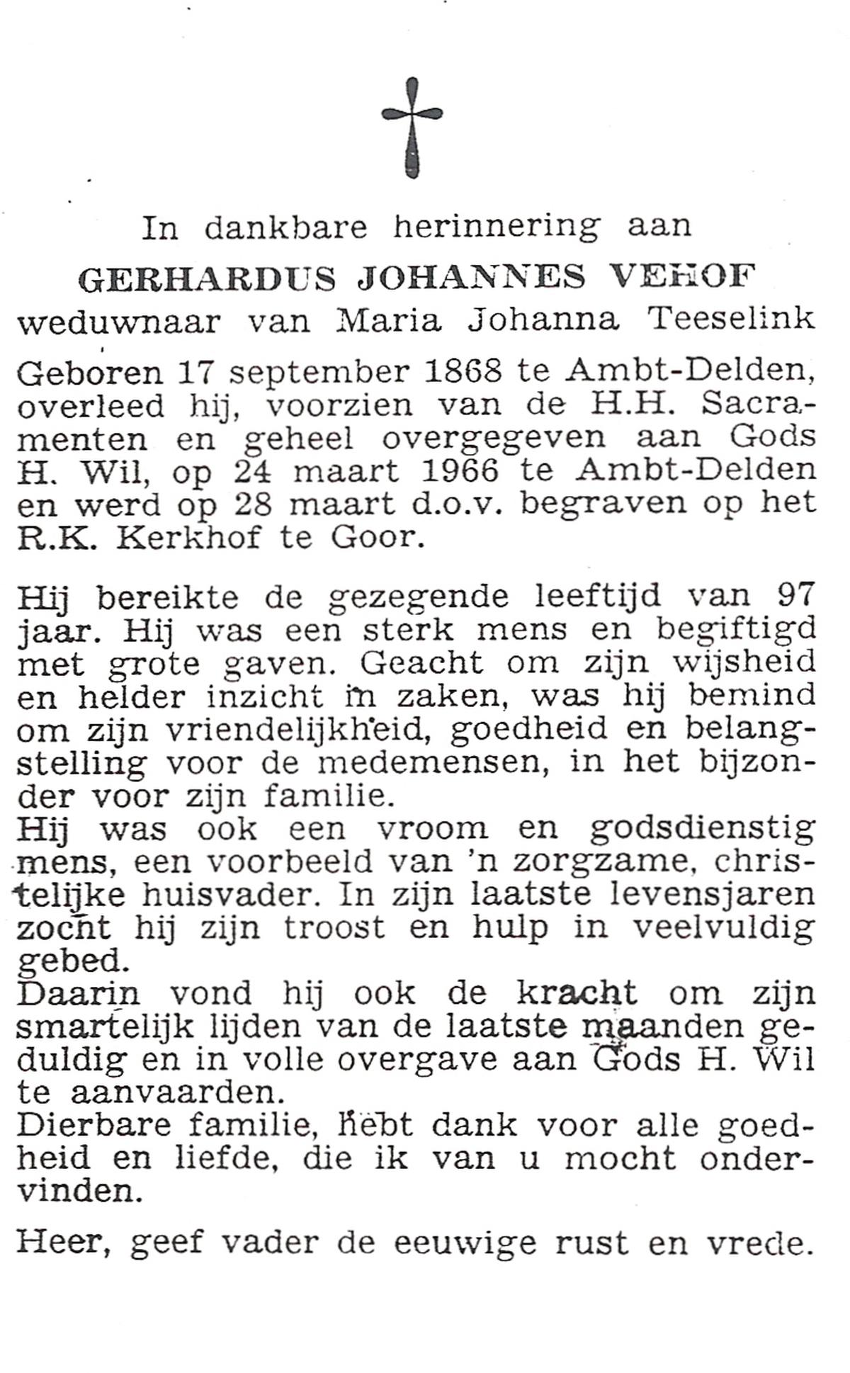 VEHOF, Gerhardus Johannes, geboren op 17-09-1868 te Delden, Ambt, overleden op 24-3-1966 te Delden, Ambt op 97-jarige leeftijd, begraven op 28-3-1966 te Delden, Stad.