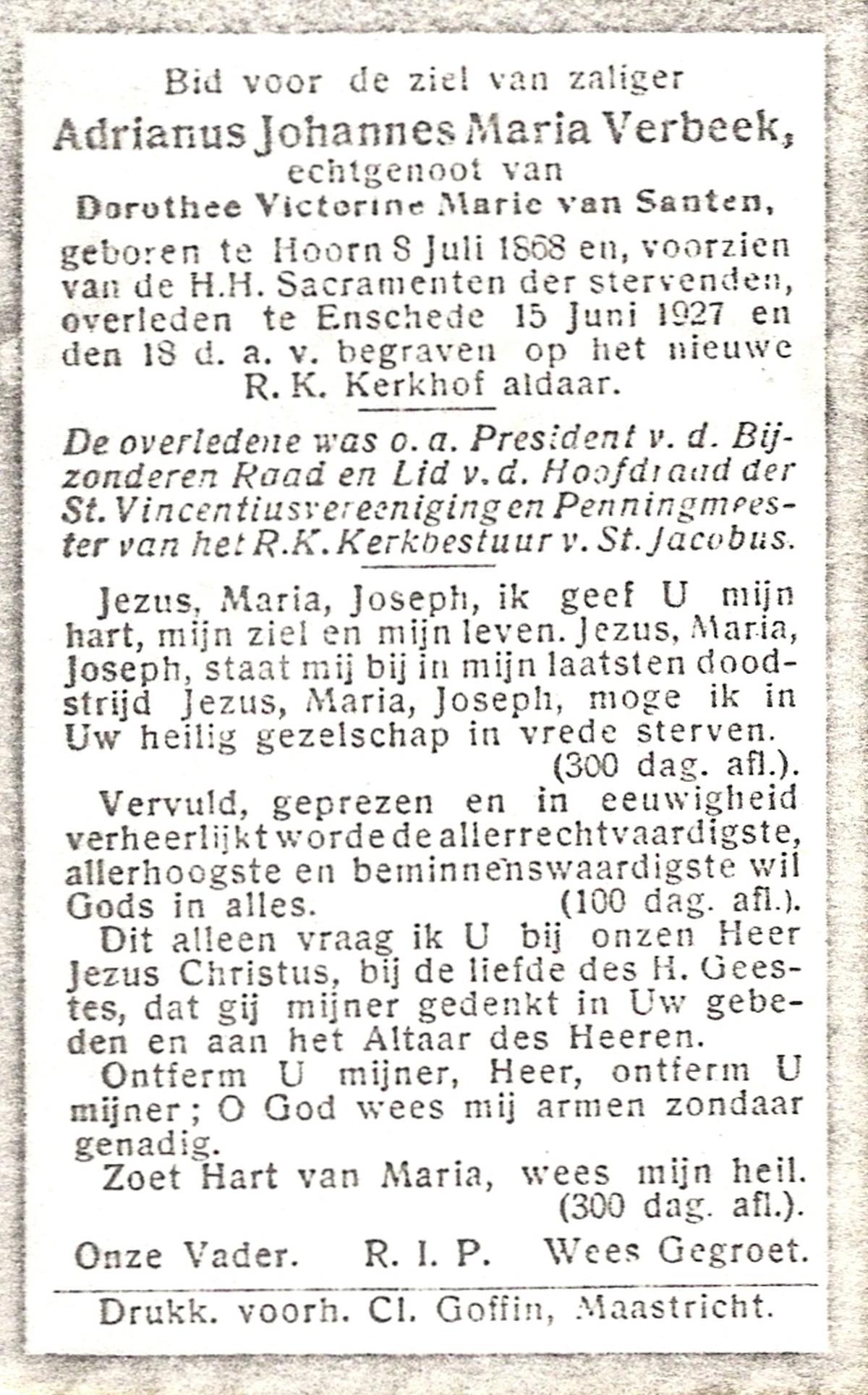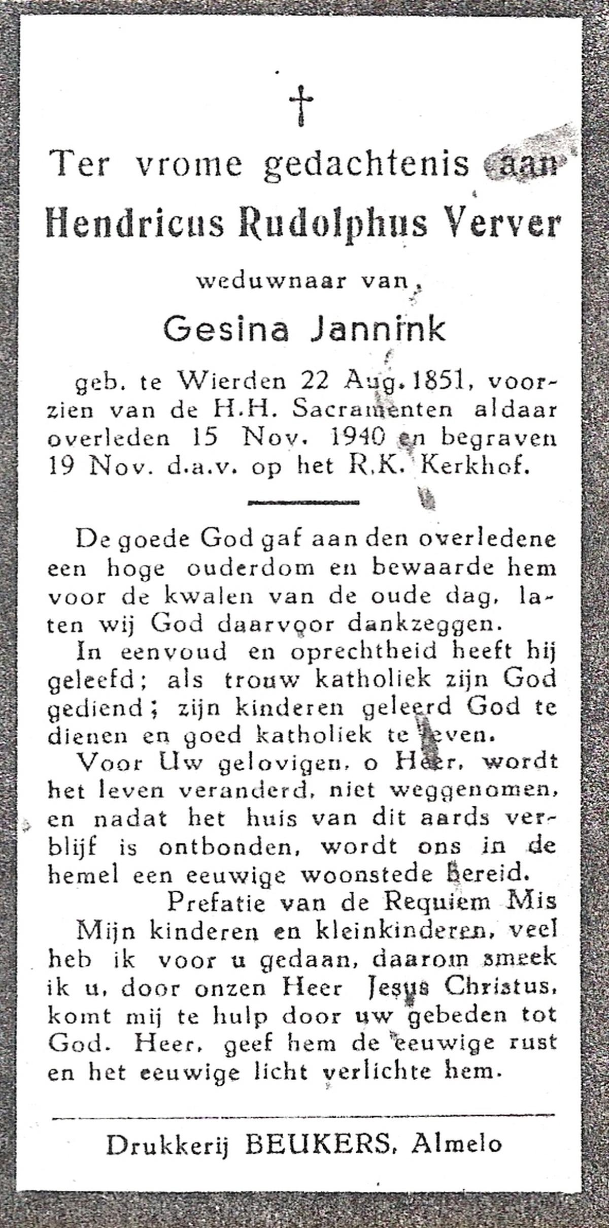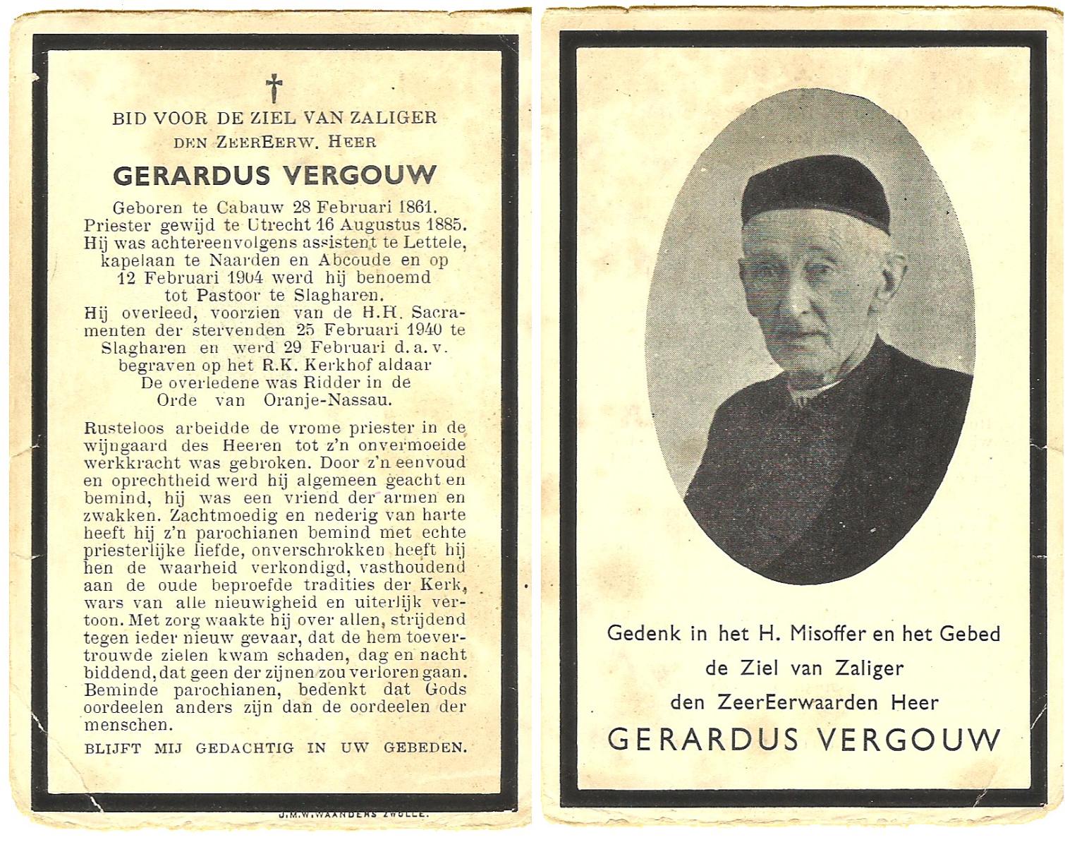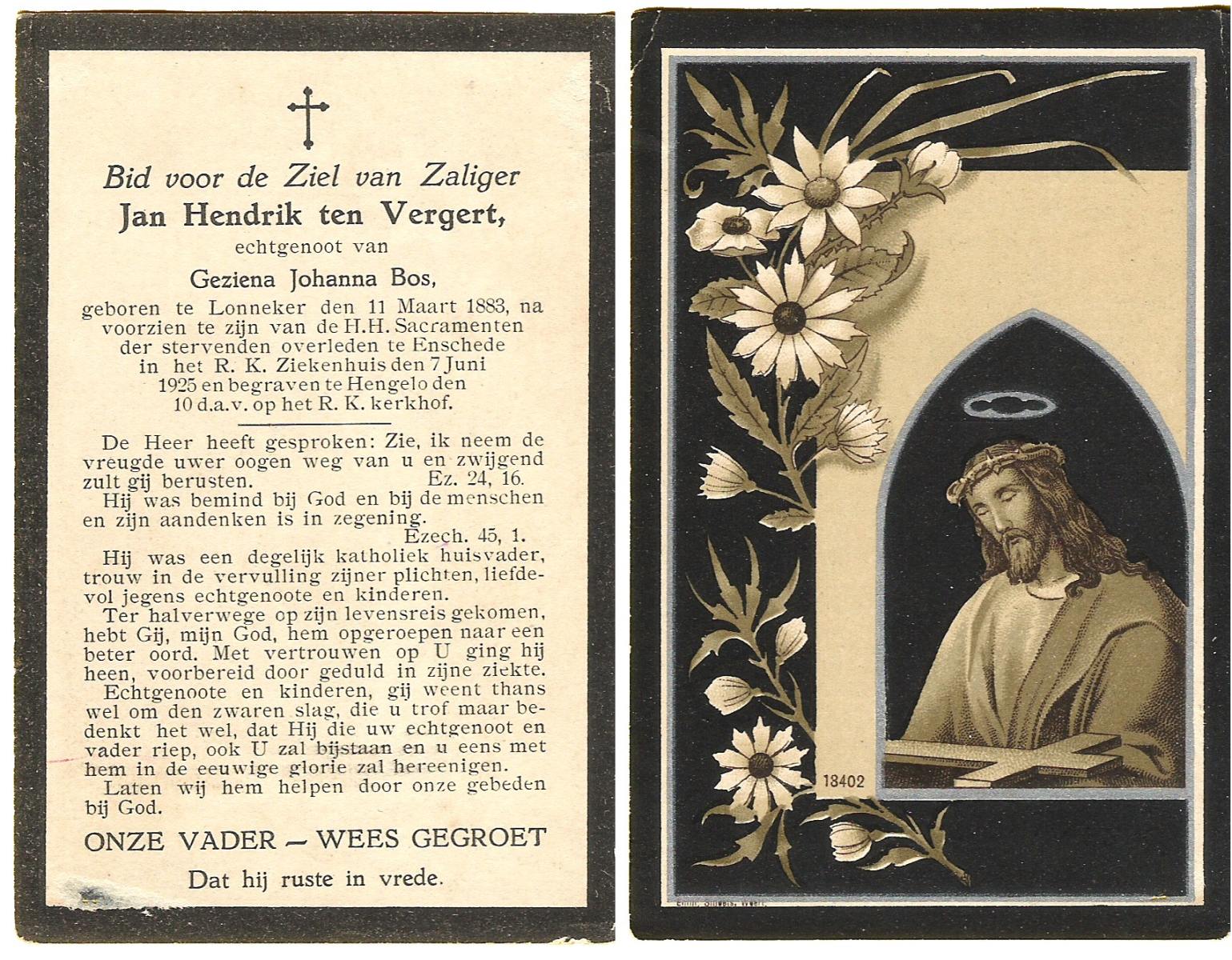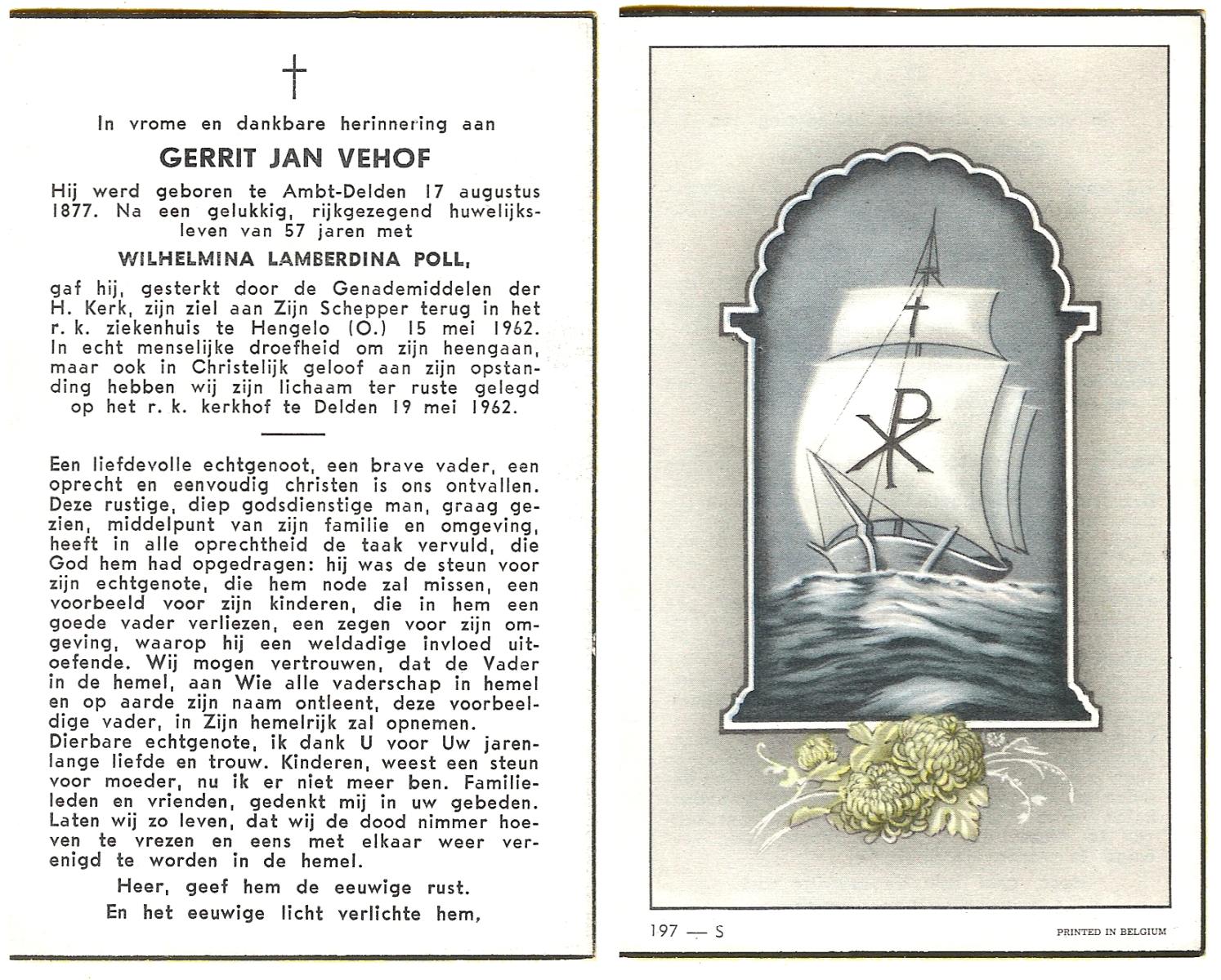 VEHOF, Gerrit Jan, geboren op 17-08-1877 te Delden, Ambt, overleden op 15-5-1962 te Hengelo (Ov.) op 84-jarige leeftijd, begraven op 19-5-1962 te Delden parochie-kerkhof H.Blasius.