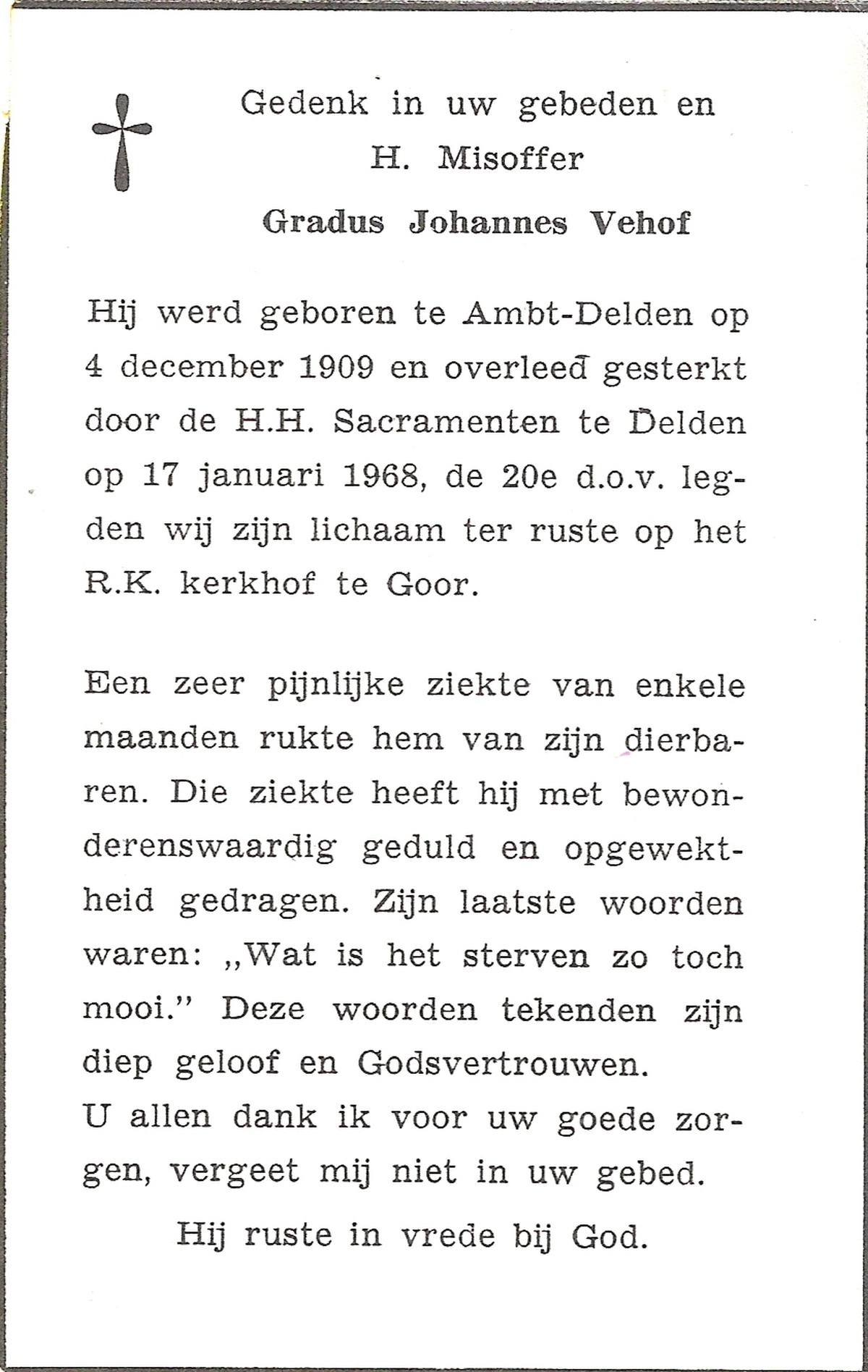 VEHOF, Gradus Johannes, geboren op 4-12-1909 te Delden, Ambt, overleden op 17-1-1968 te Delden op 58-jarige leeftijd, begraven op 20-1-1968 te Goor.