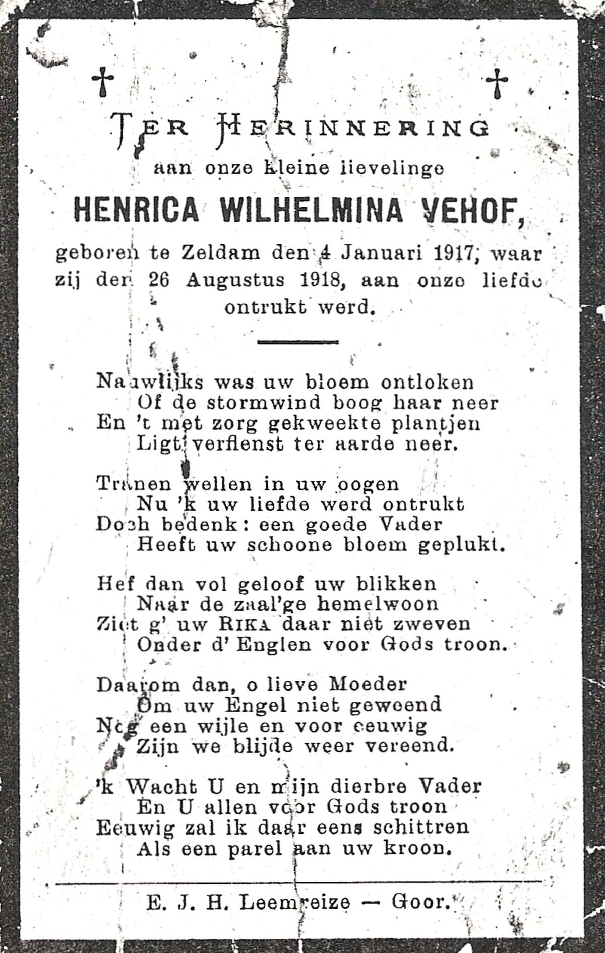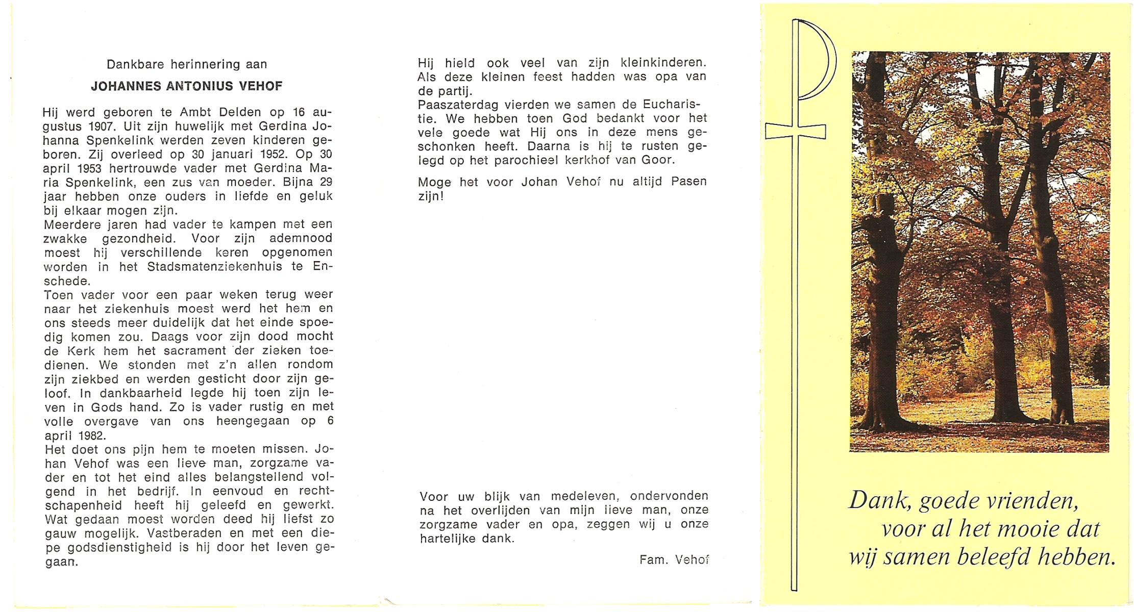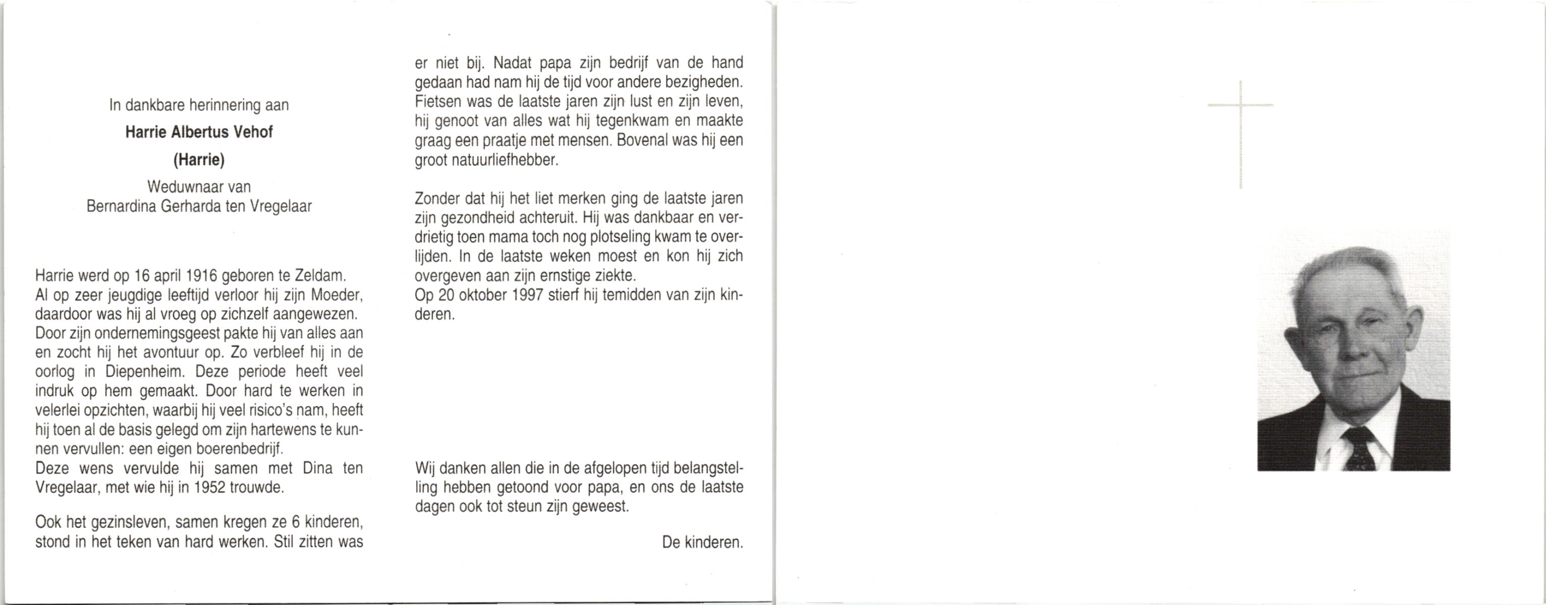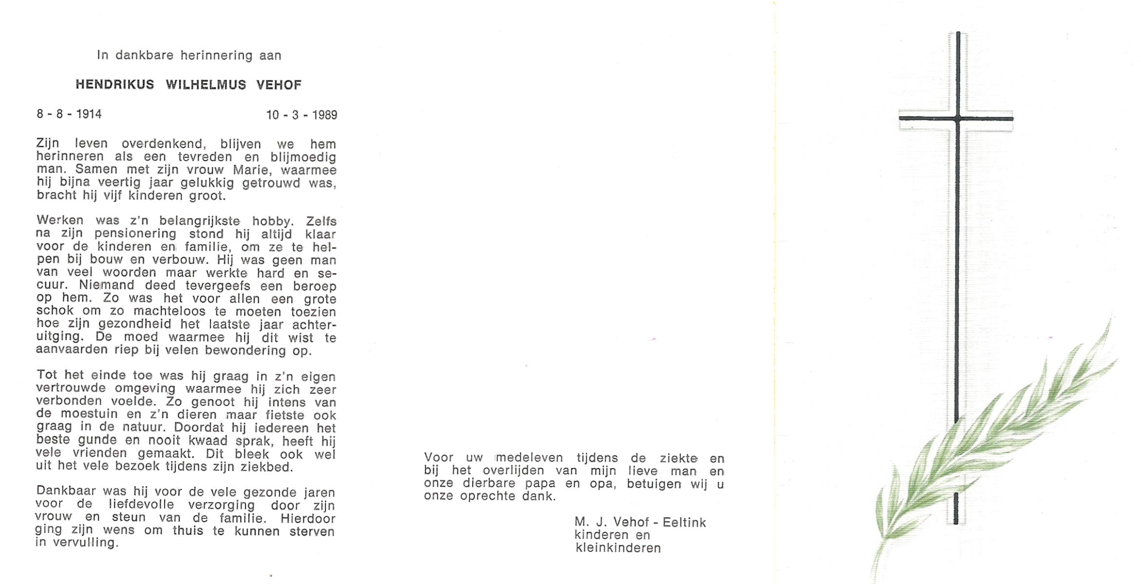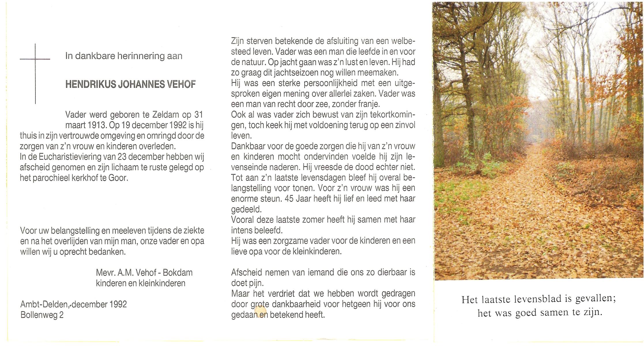 VEHOF, Hendrikus Johannes, geboren op 31-3-1913 te Zeldam, overleden op 19-12-1992 op 79-jarige leeftijd, begraven op 23-12-1992 te Goor.