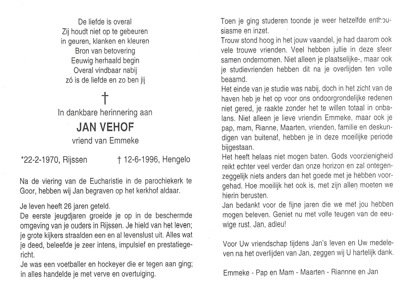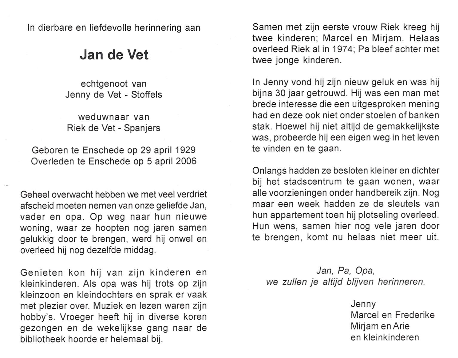VET, de, Jan, geboren op 29-4-1929 te Enschede, overleden op 5-4-2006 te Enschede op 76-jarige leeftijd.