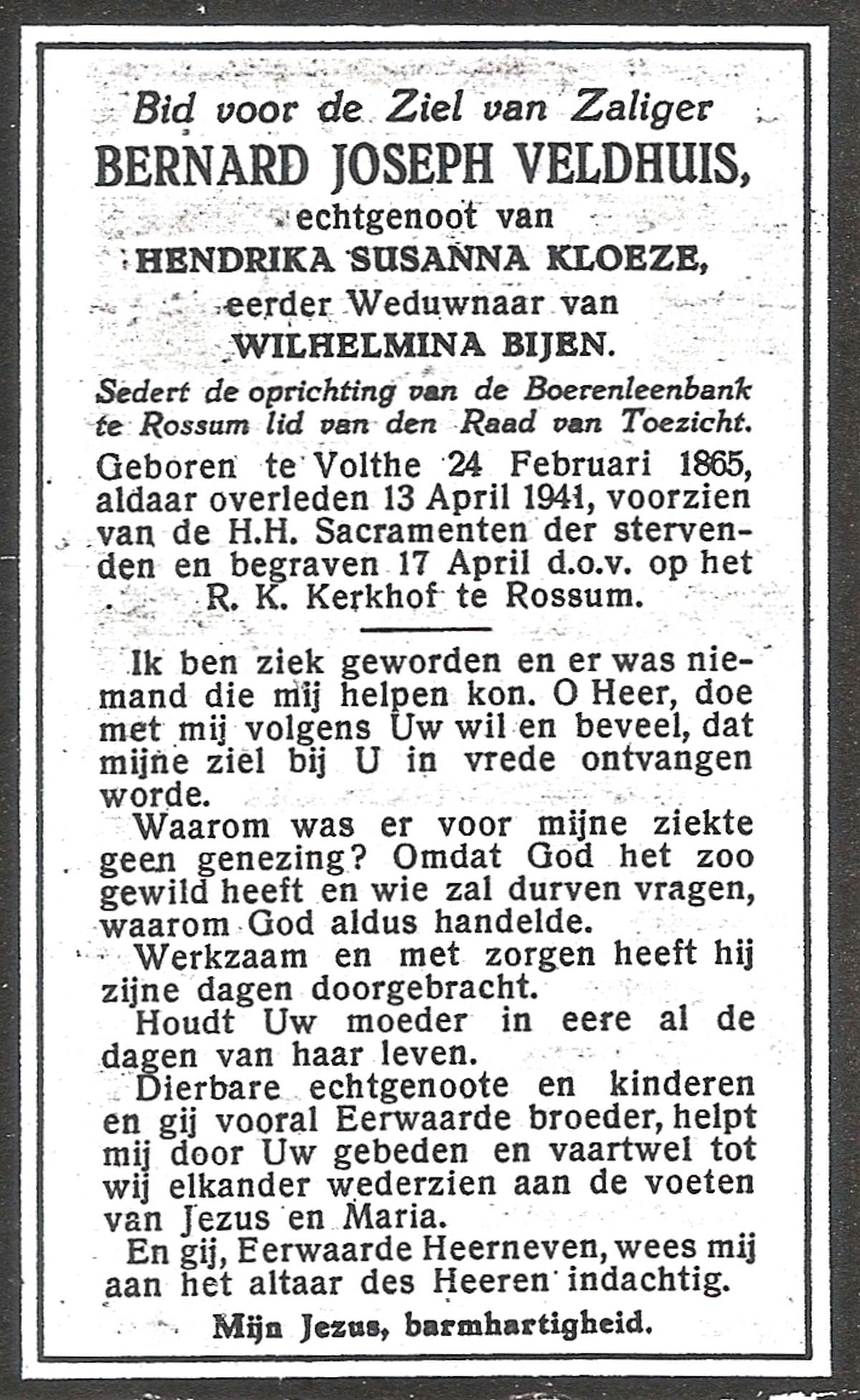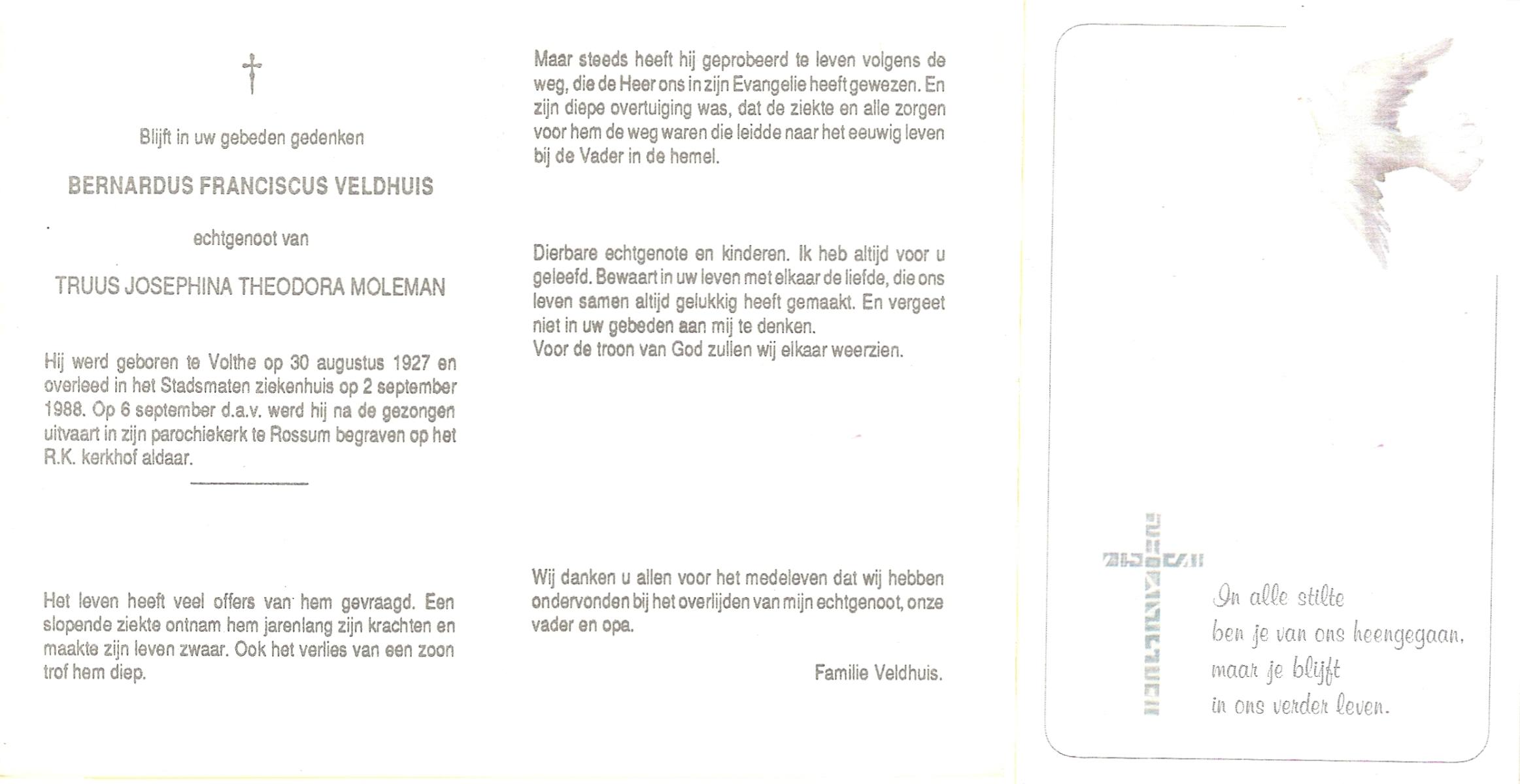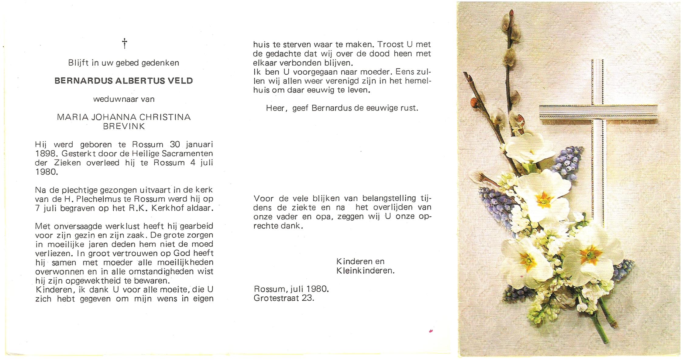 VELD, Bernardus Albertus, geboren op 30-01-1898 te Rossum, overleden op 4-7-1980 te Rossum op 82-jarige leeftijd, begraven op 7-7-1980 te Rossum.