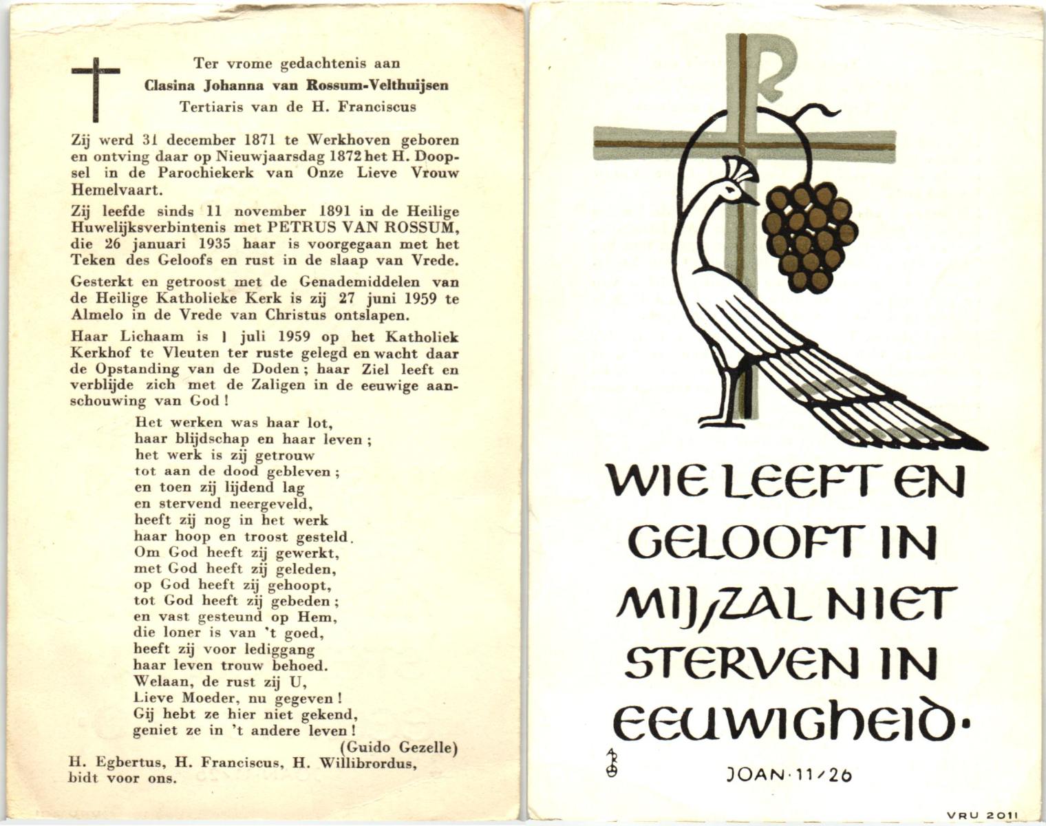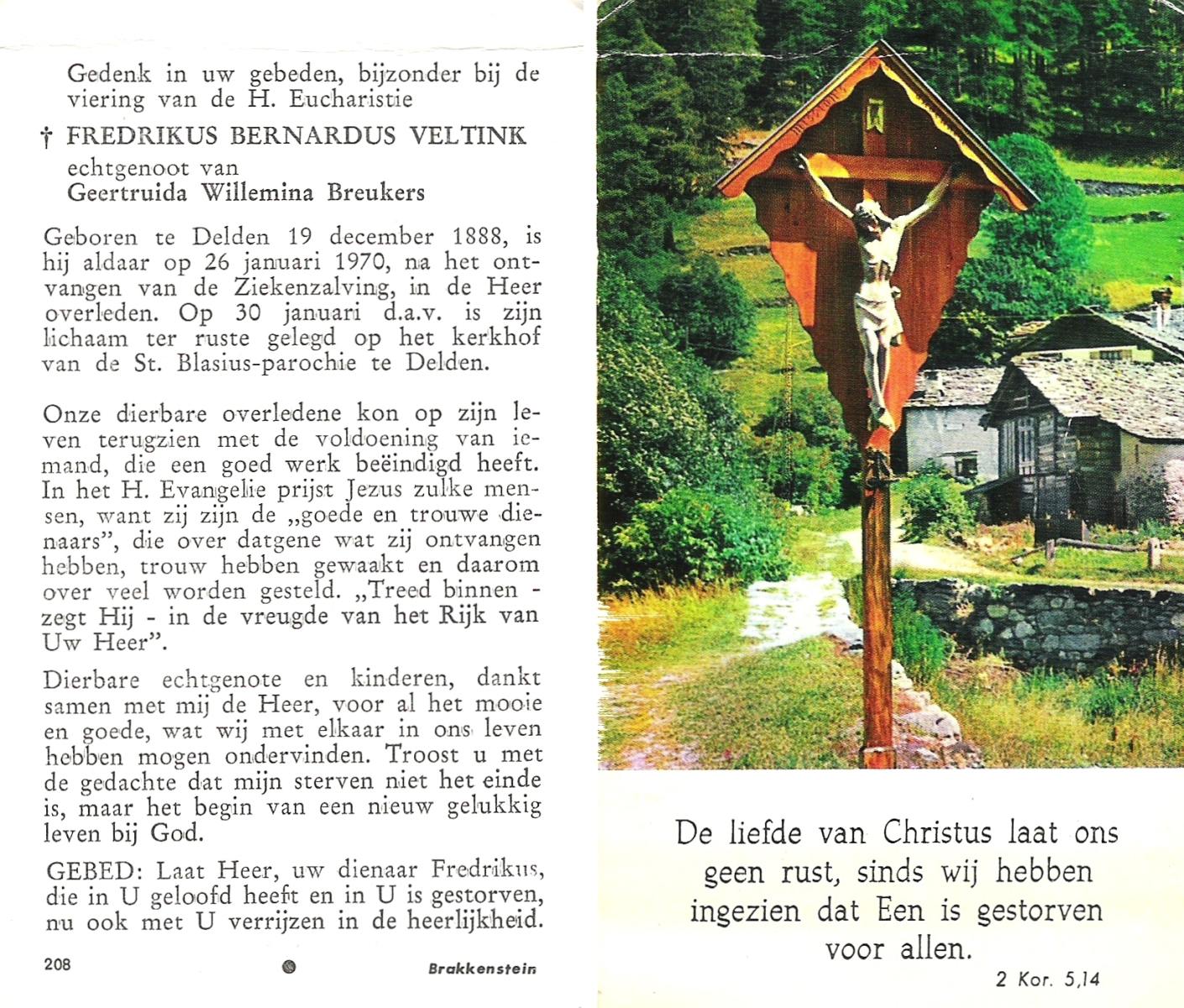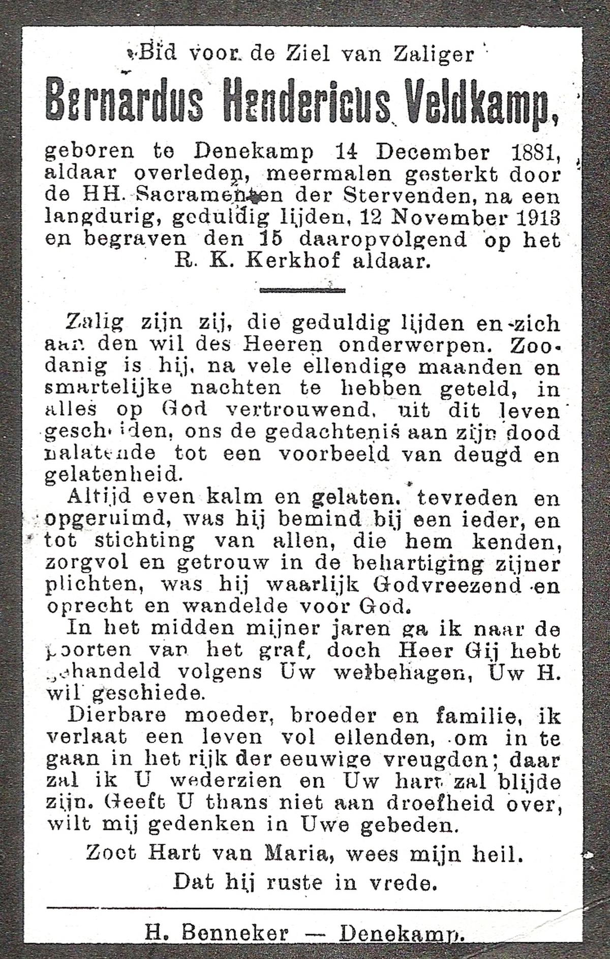 VELD, Bernardus Albertus, geboren op 30-01-1898 te Rossum, overleden op 4-7-1980 te Rossum op 82-jarige leeftijd, begraven op 7-7-1980 te Rossum.