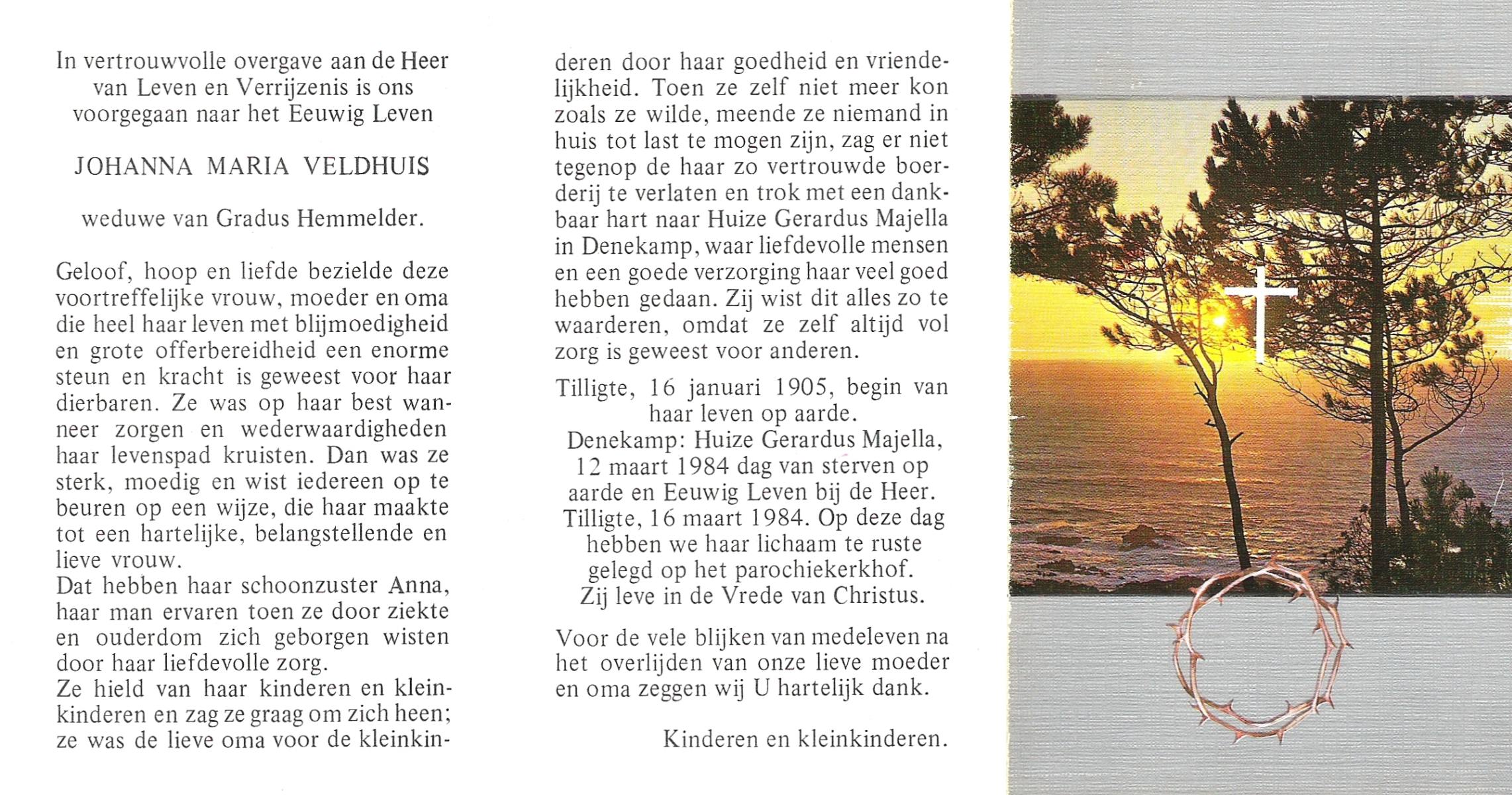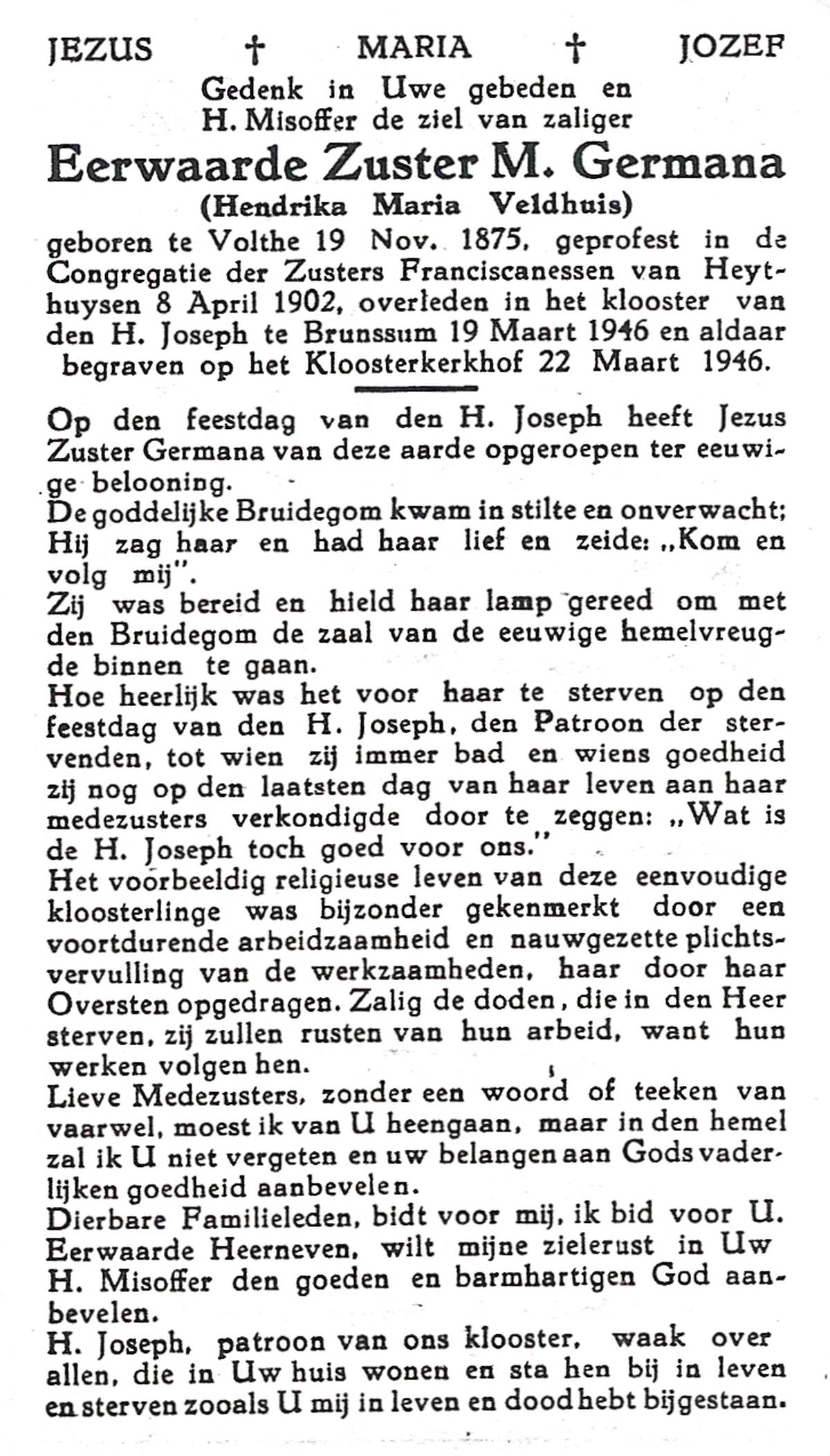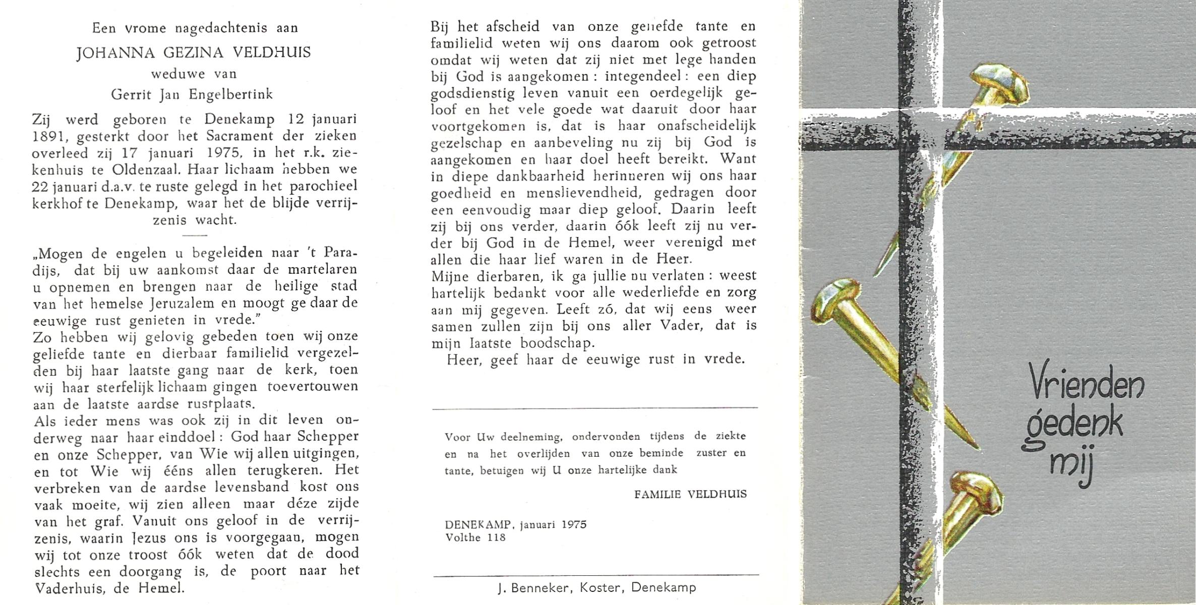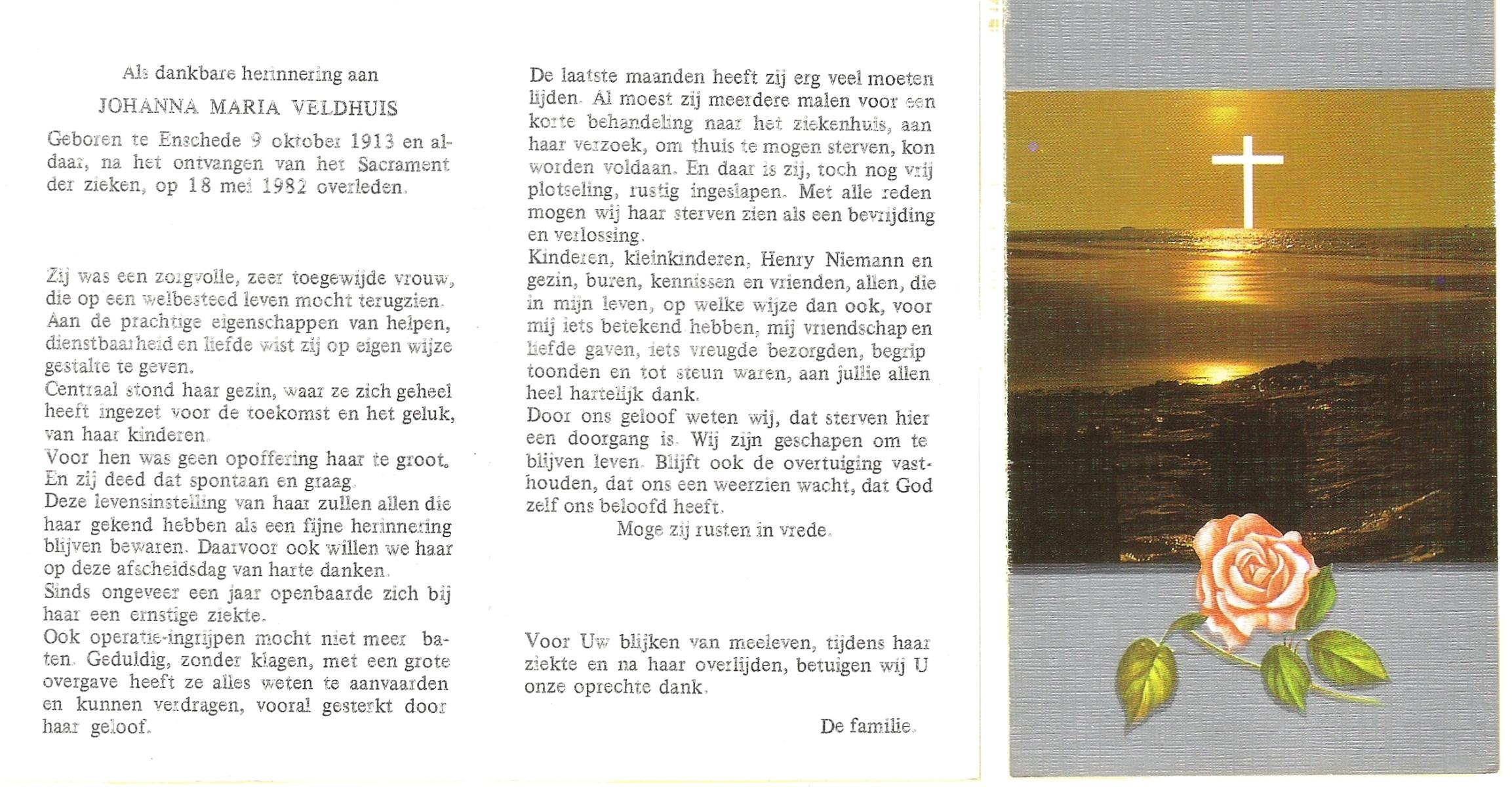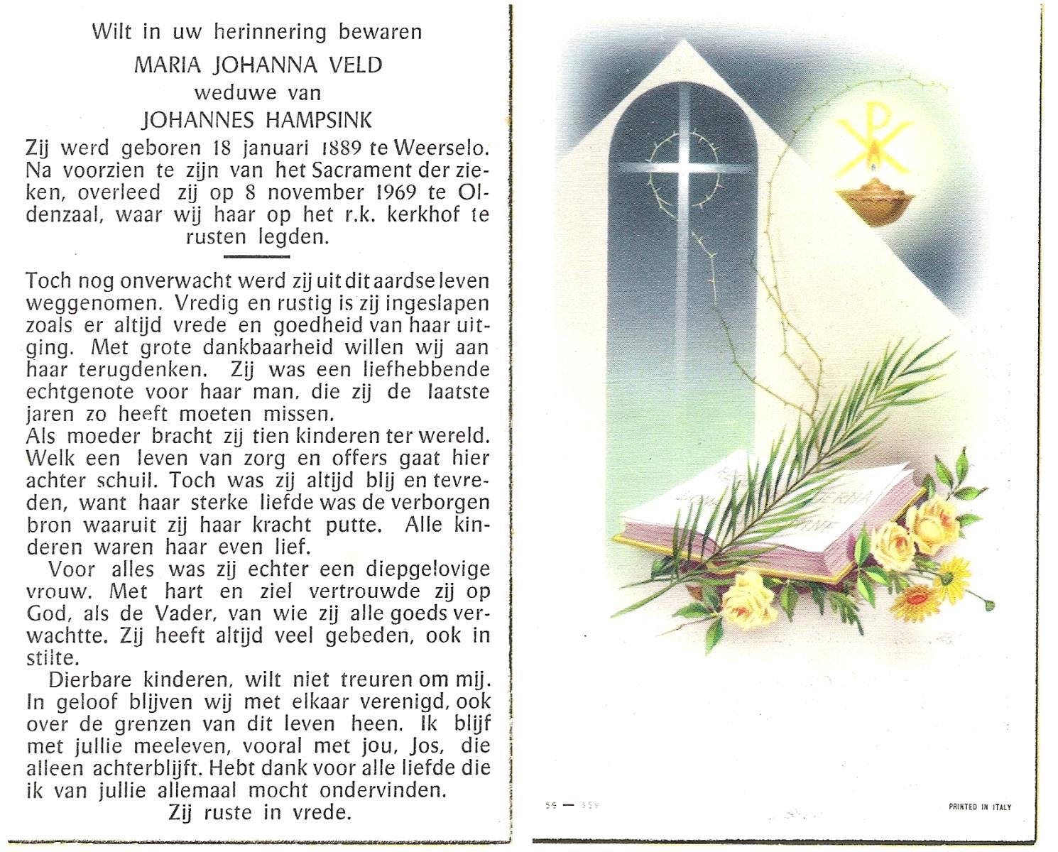 VELD, Maria Johanna, geboren op 18-01-1889 te Weerselo, overleden op 8-11-1969 te Oldenzaal op 80-jarige leeftijd, begraven te Oldenzaal R.K.kekrhof.