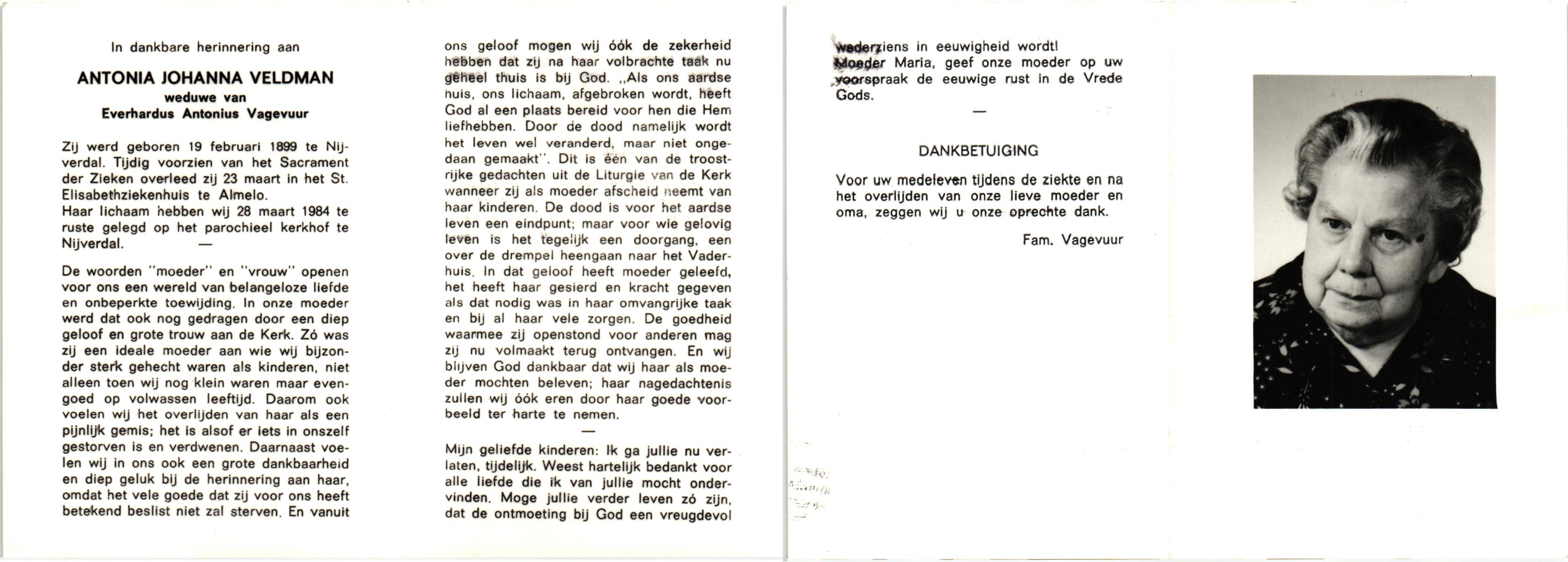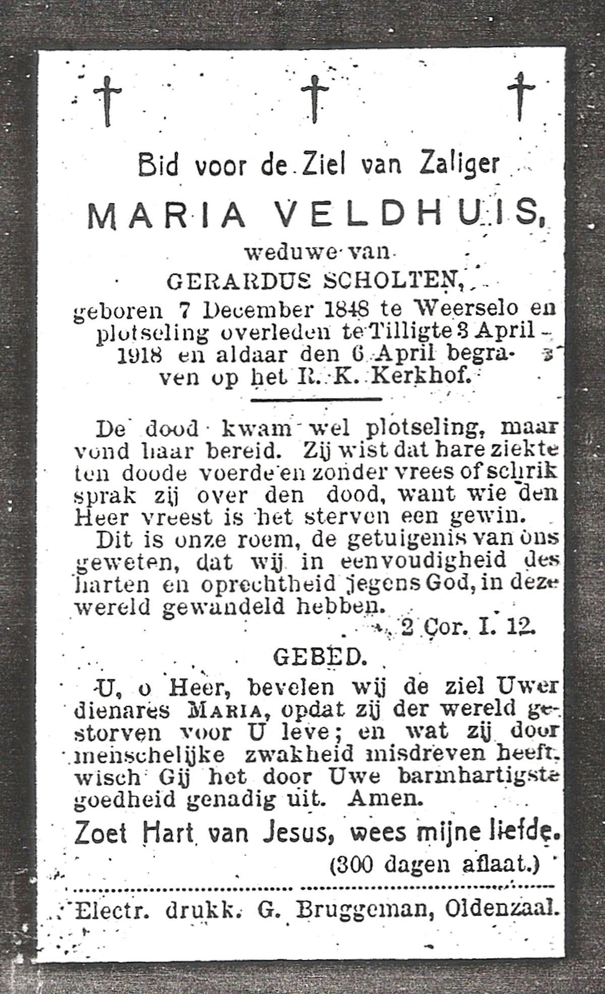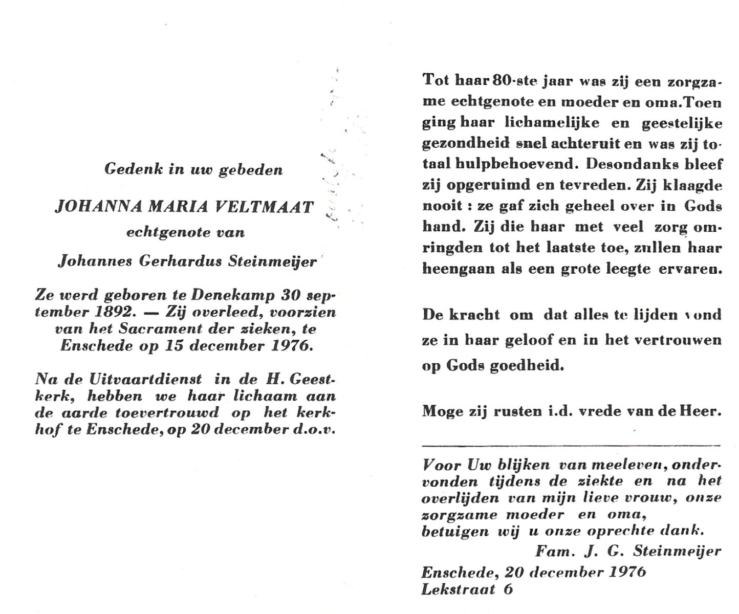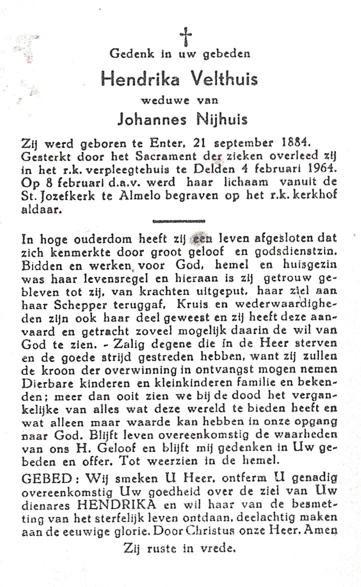 VELD, Maria Johanna, geboren op 18-01-1889 te Weerselo, overleden op 8-11-1969 te Oldenzaal op 80-jarige leeftijd, begraven te Oldenzaal R.K.kekrhof.