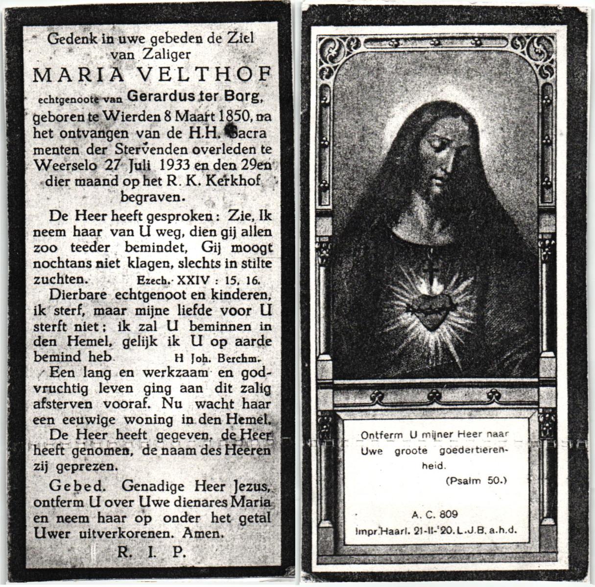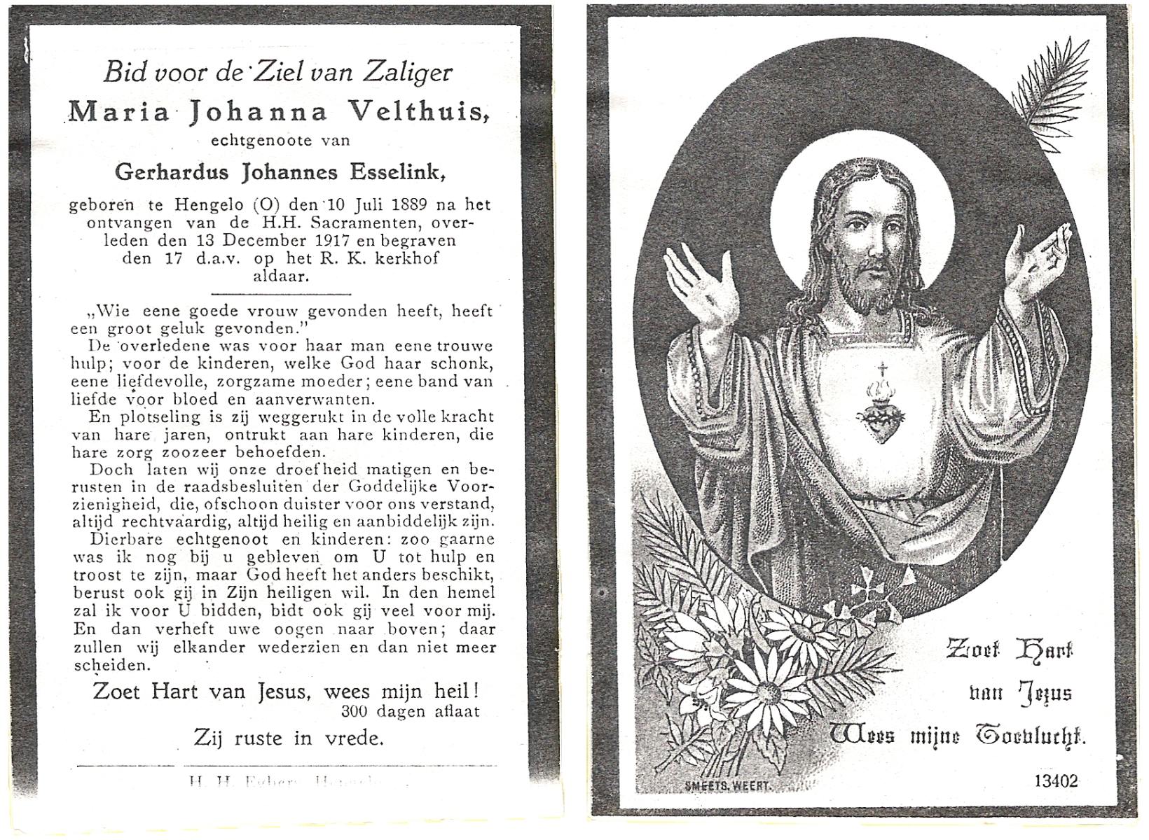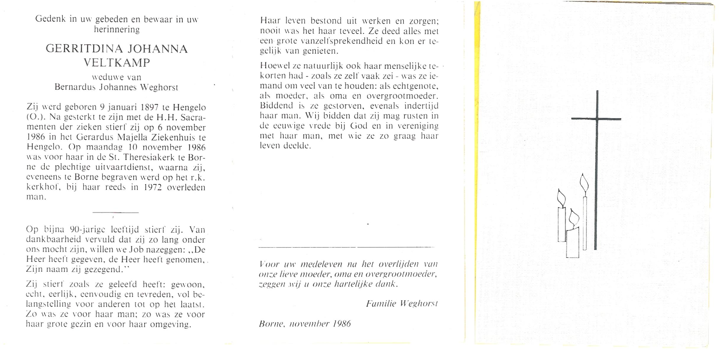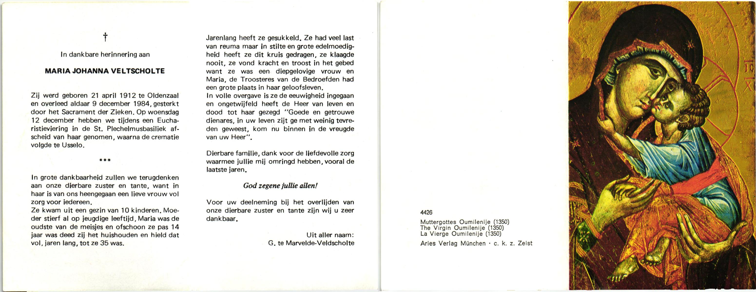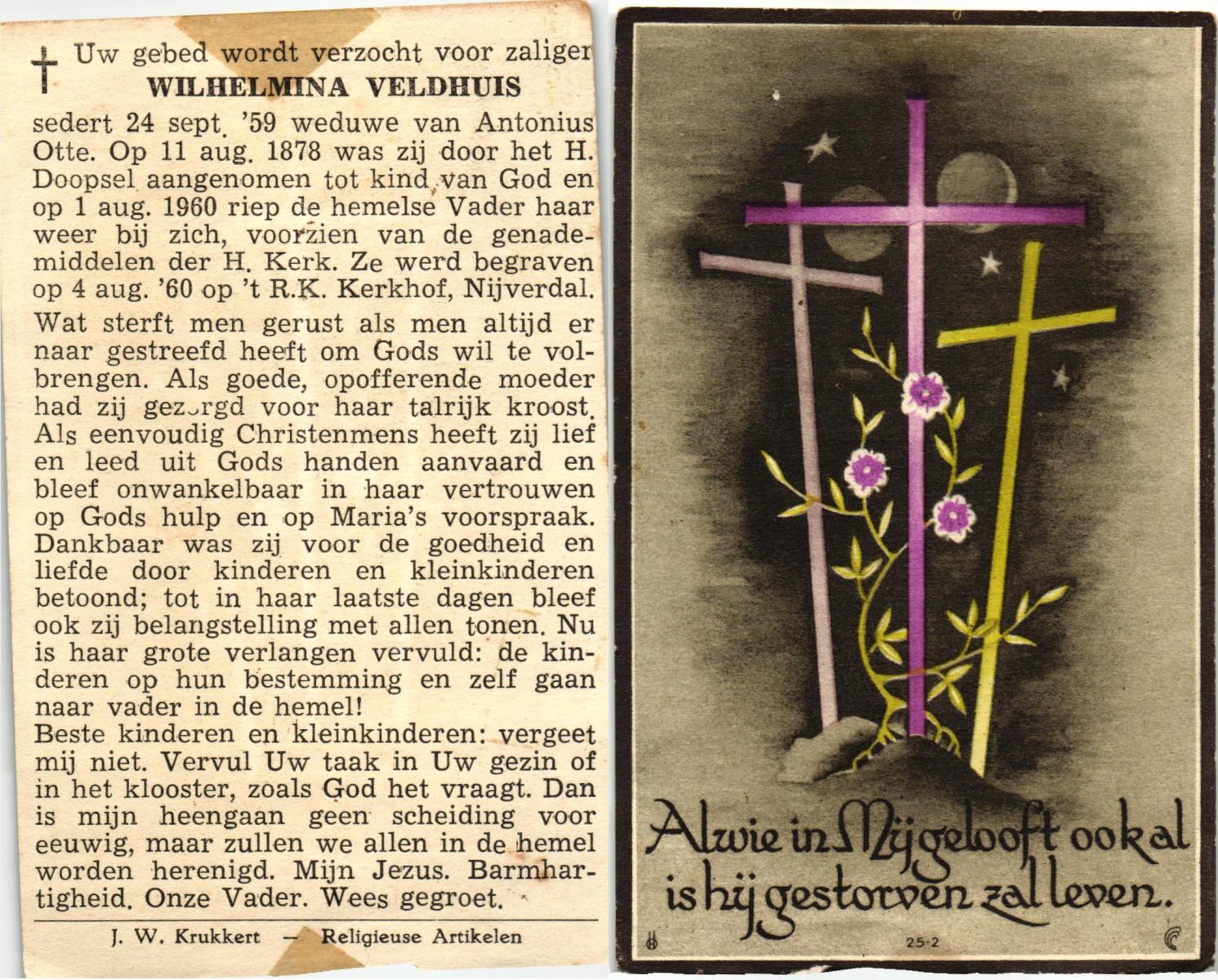 VELD, Maria Johanna, geboren op 18-01-1889 te Weerselo, overleden op 8-11-1969 te Oldenzaal op 80-jarige leeftijd, begraven te Oldenzaal R.K.kekrhof.
