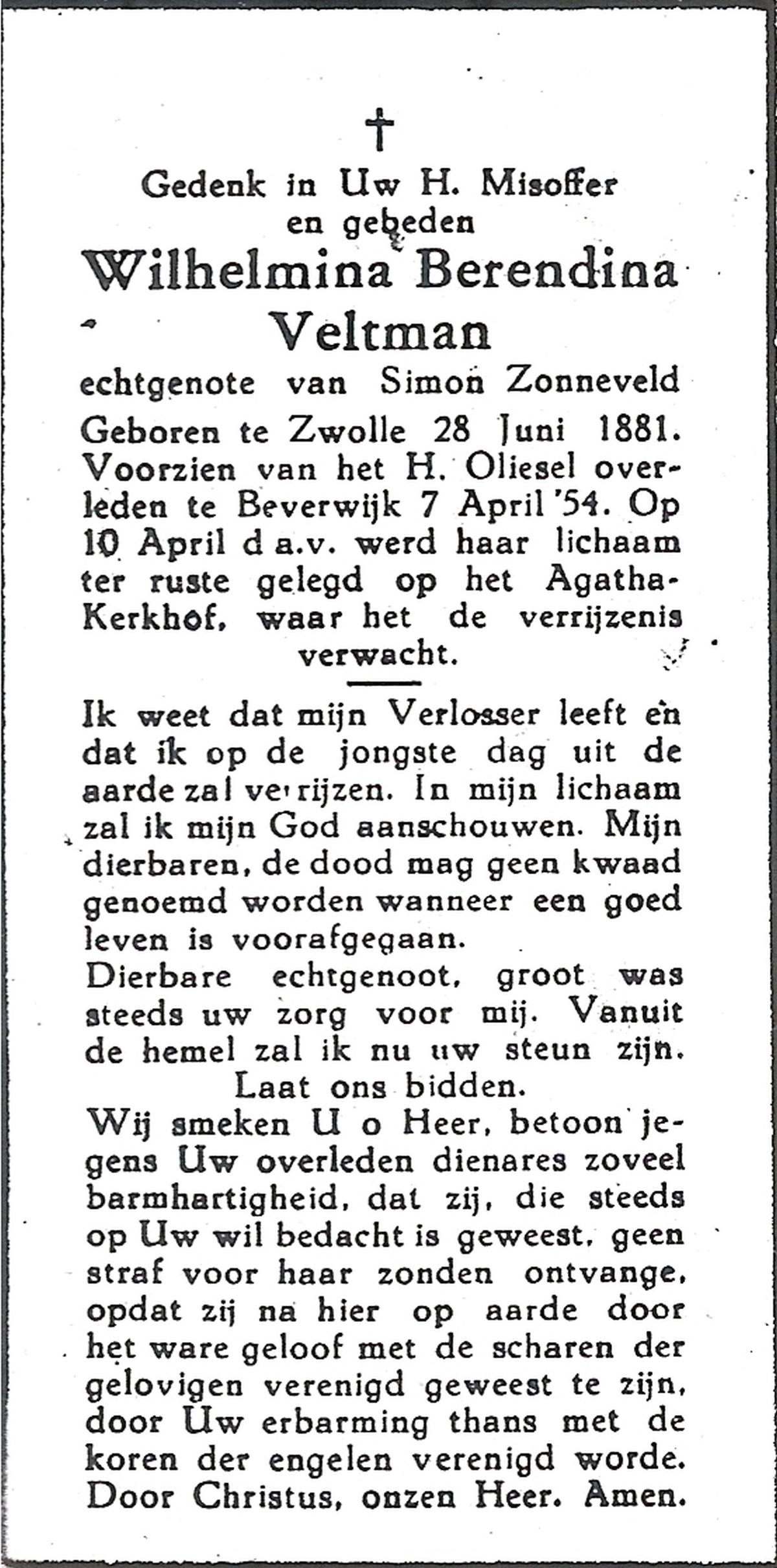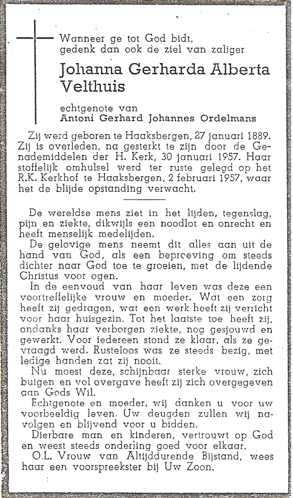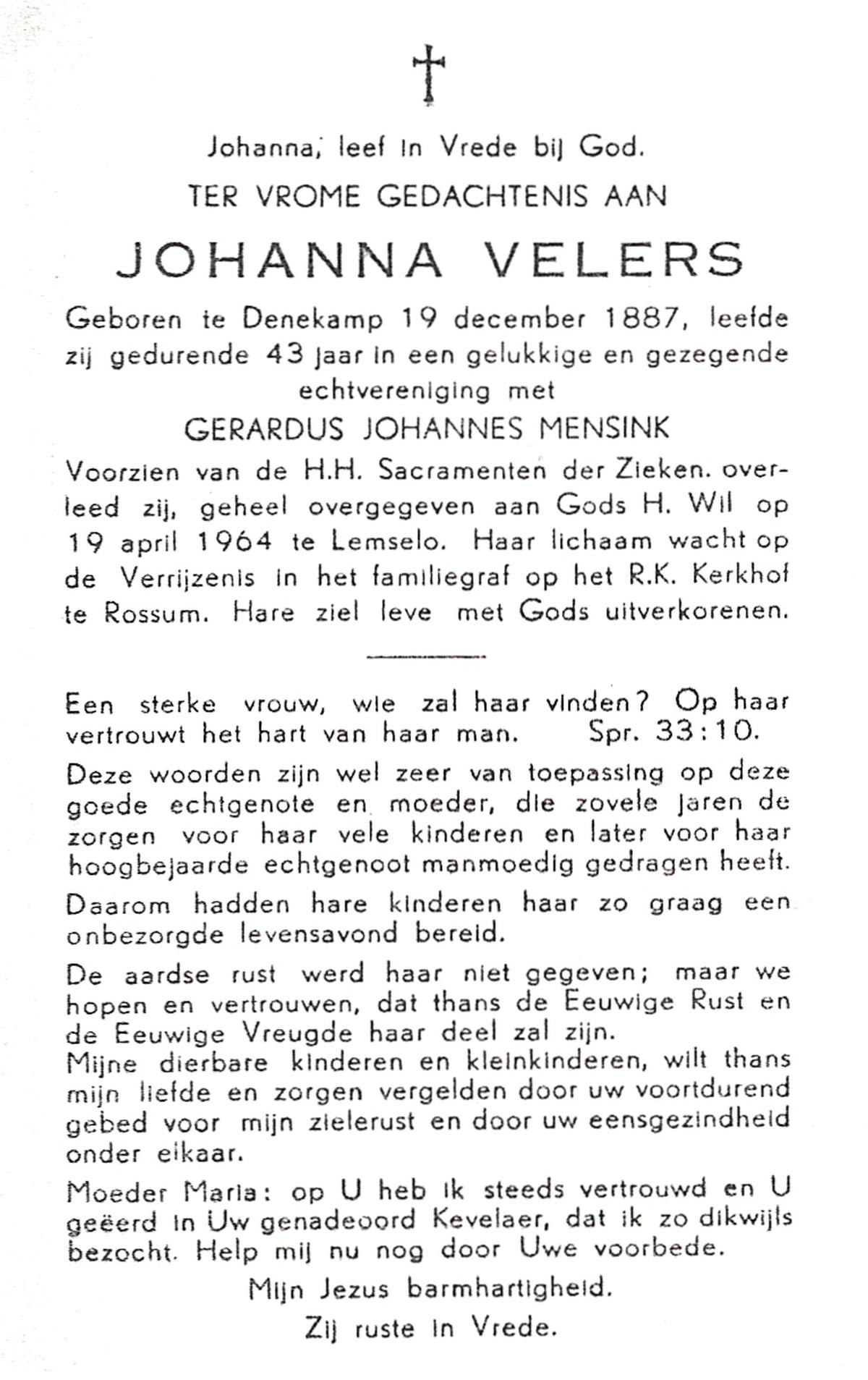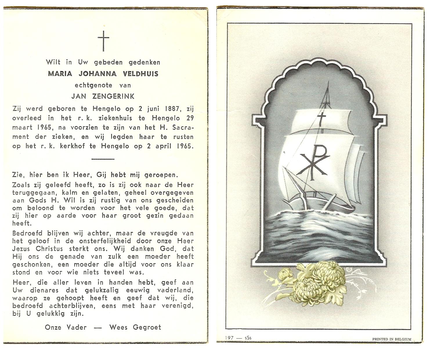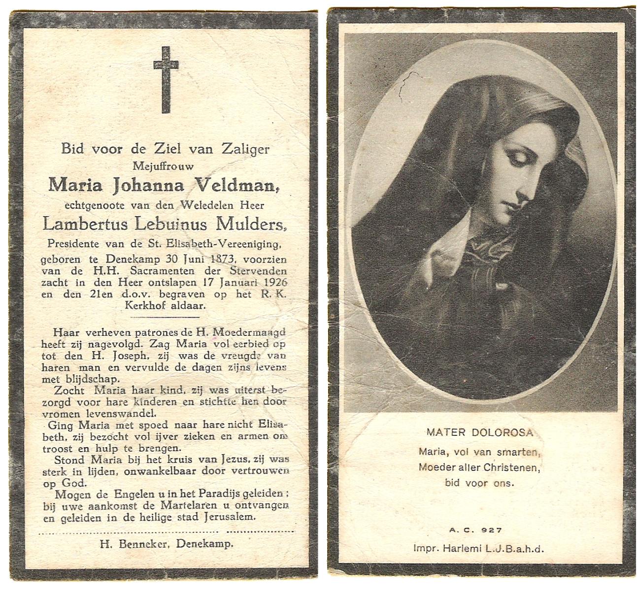 VELD, Maria Johanna, geboren op 18-01-1889 te Weerselo, overleden op 8-11-1969 te Oldenzaal op 80-jarige leeftijd, begraven te Oldenzaal R.K.kekrhof.