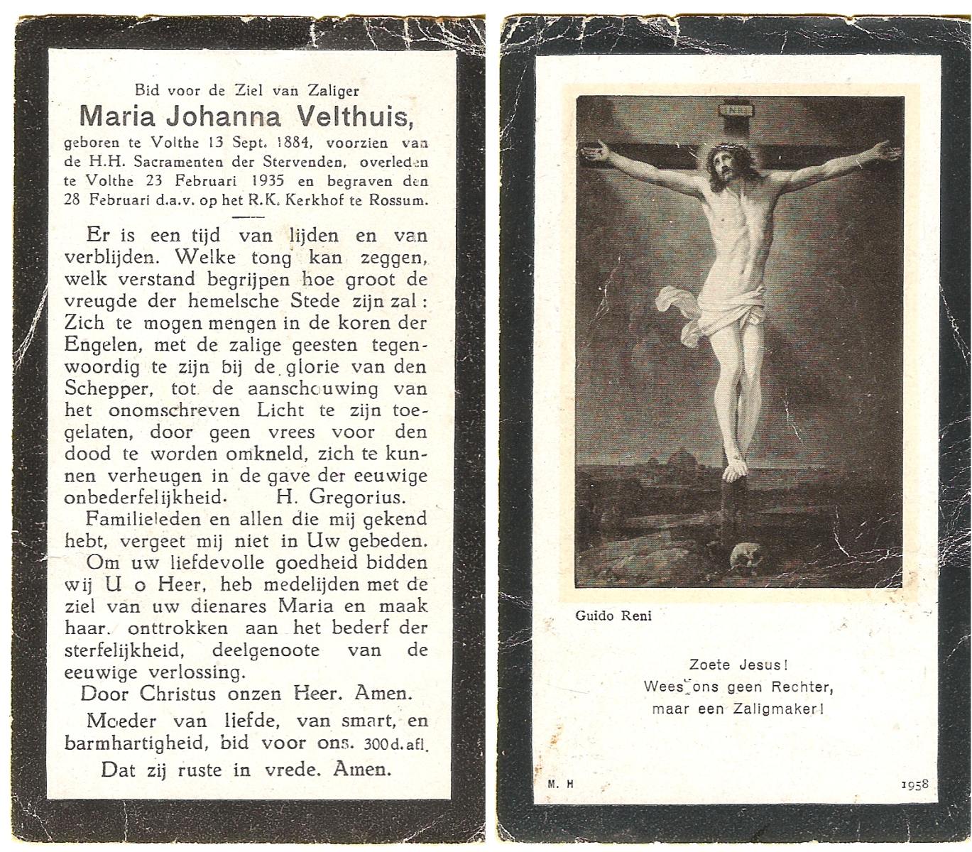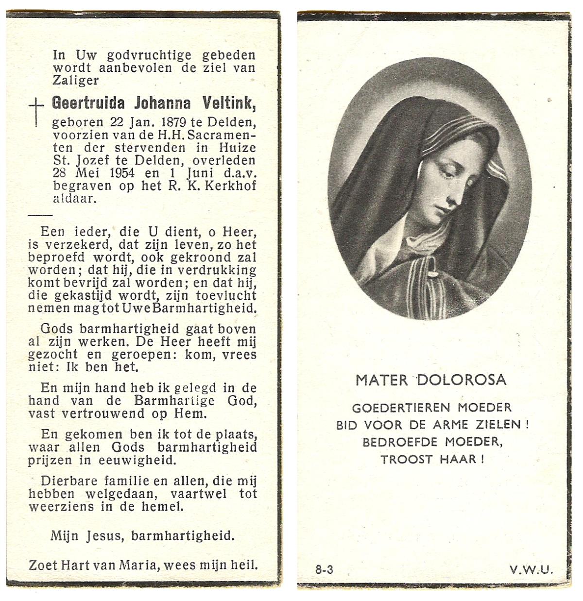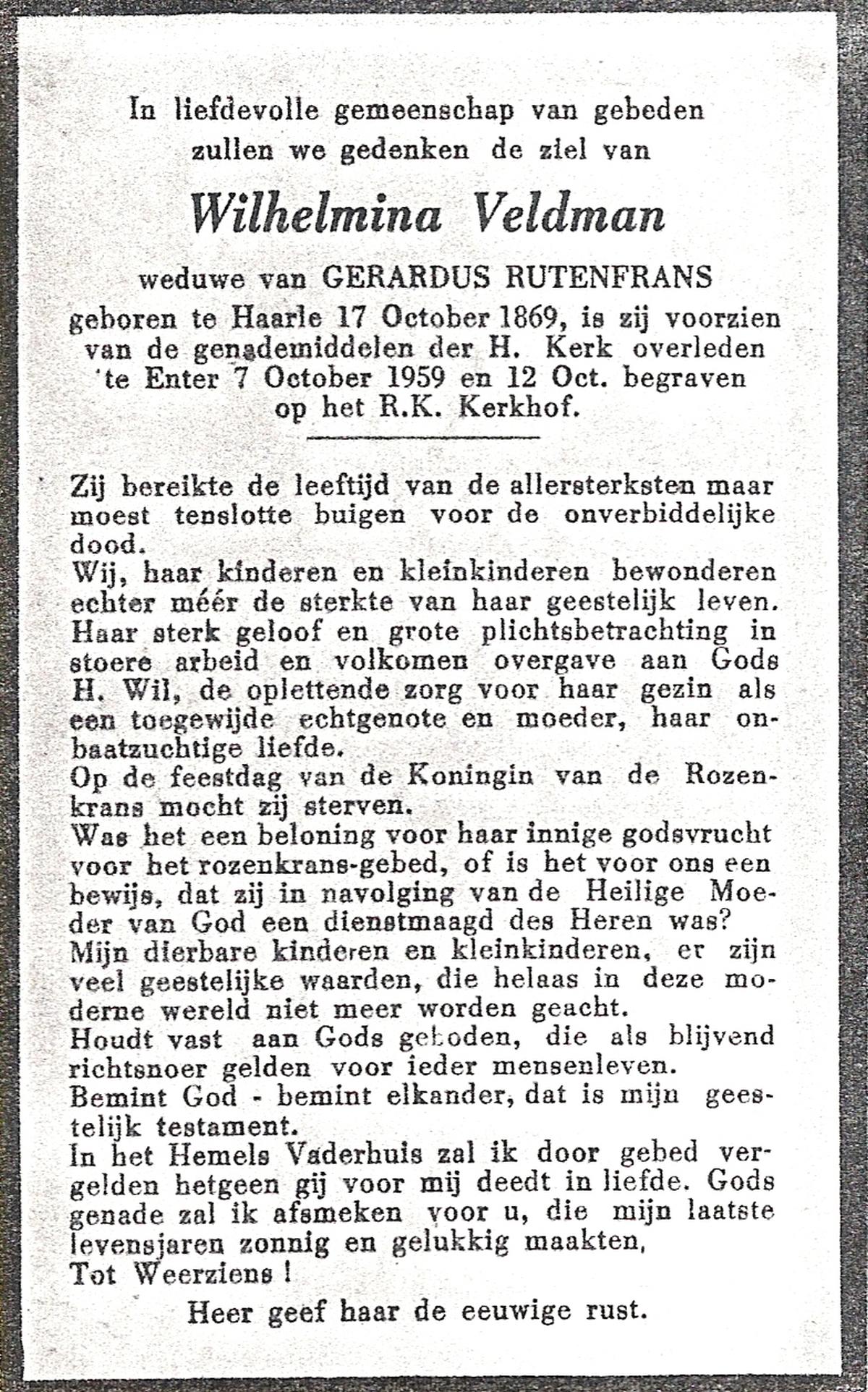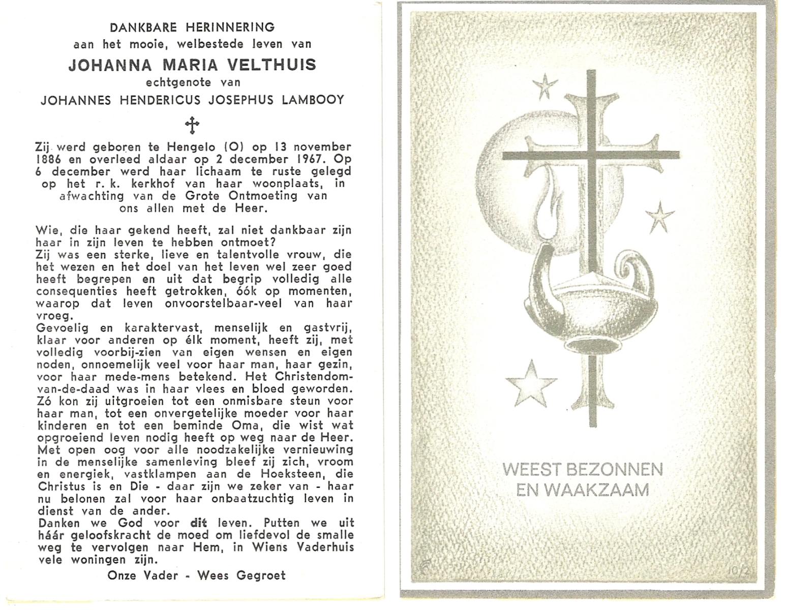 VELD, Maria Johanna, geboren op 18-01-1889 te Weerselo, overleden op 8-11-1969 te Oldenzaal op 80-jarige leeftijd, begraven te Oldenzaal R.K.kekrhof.