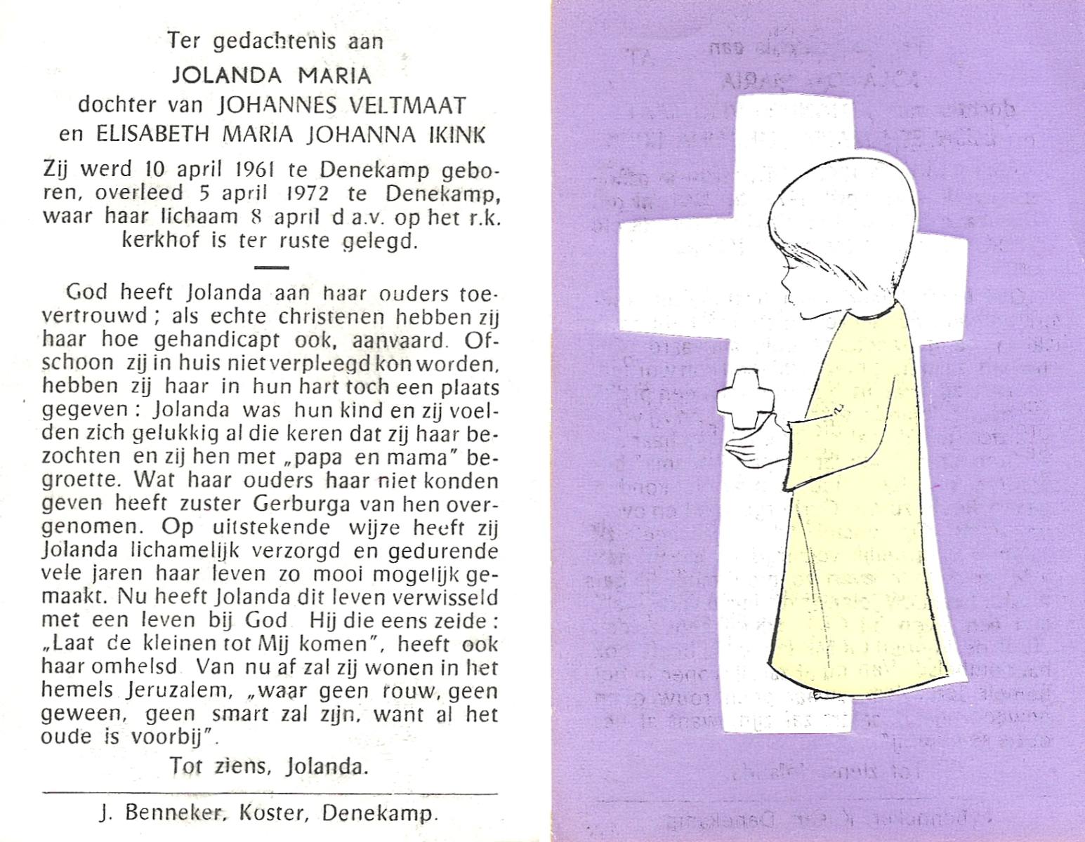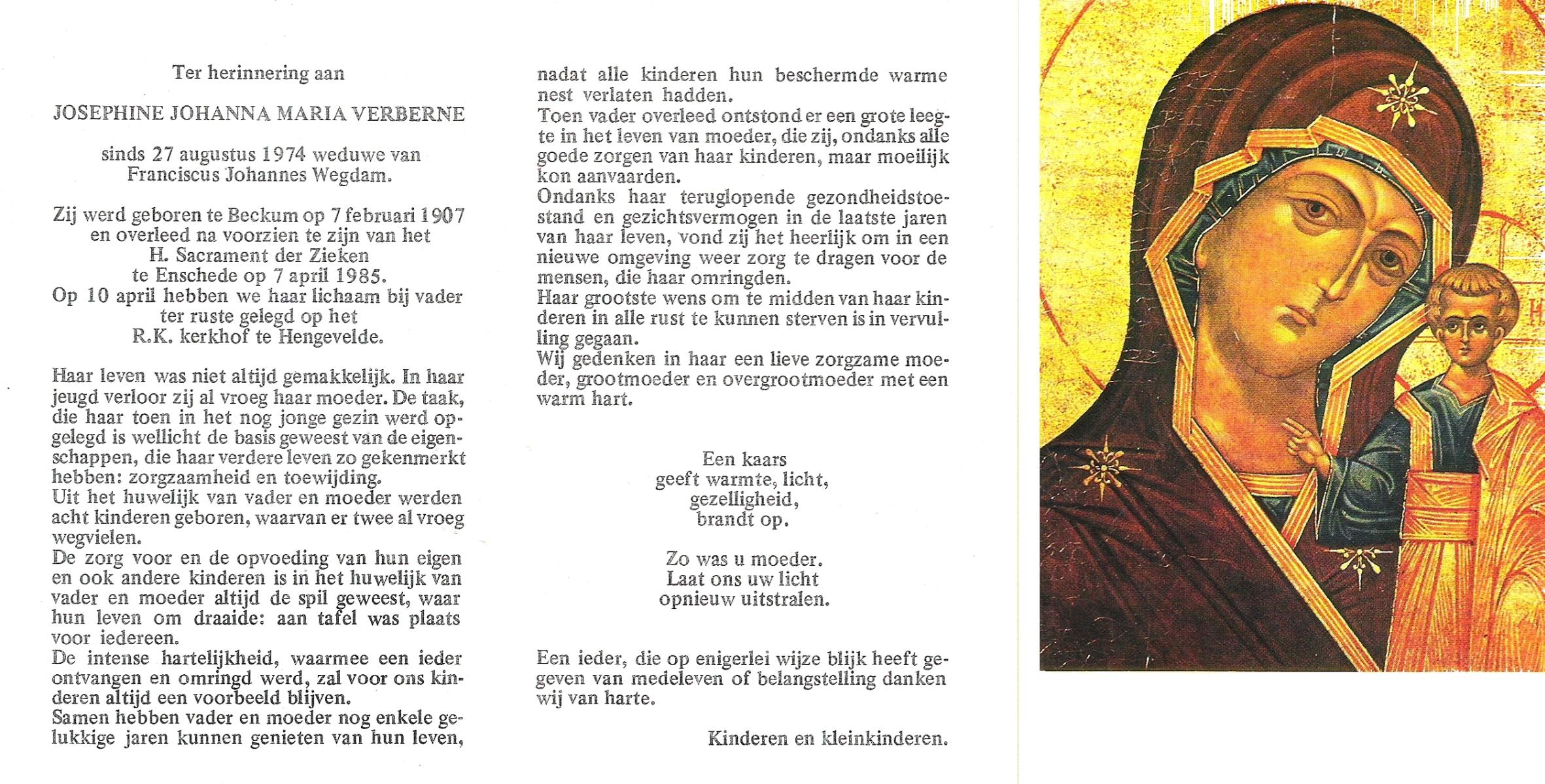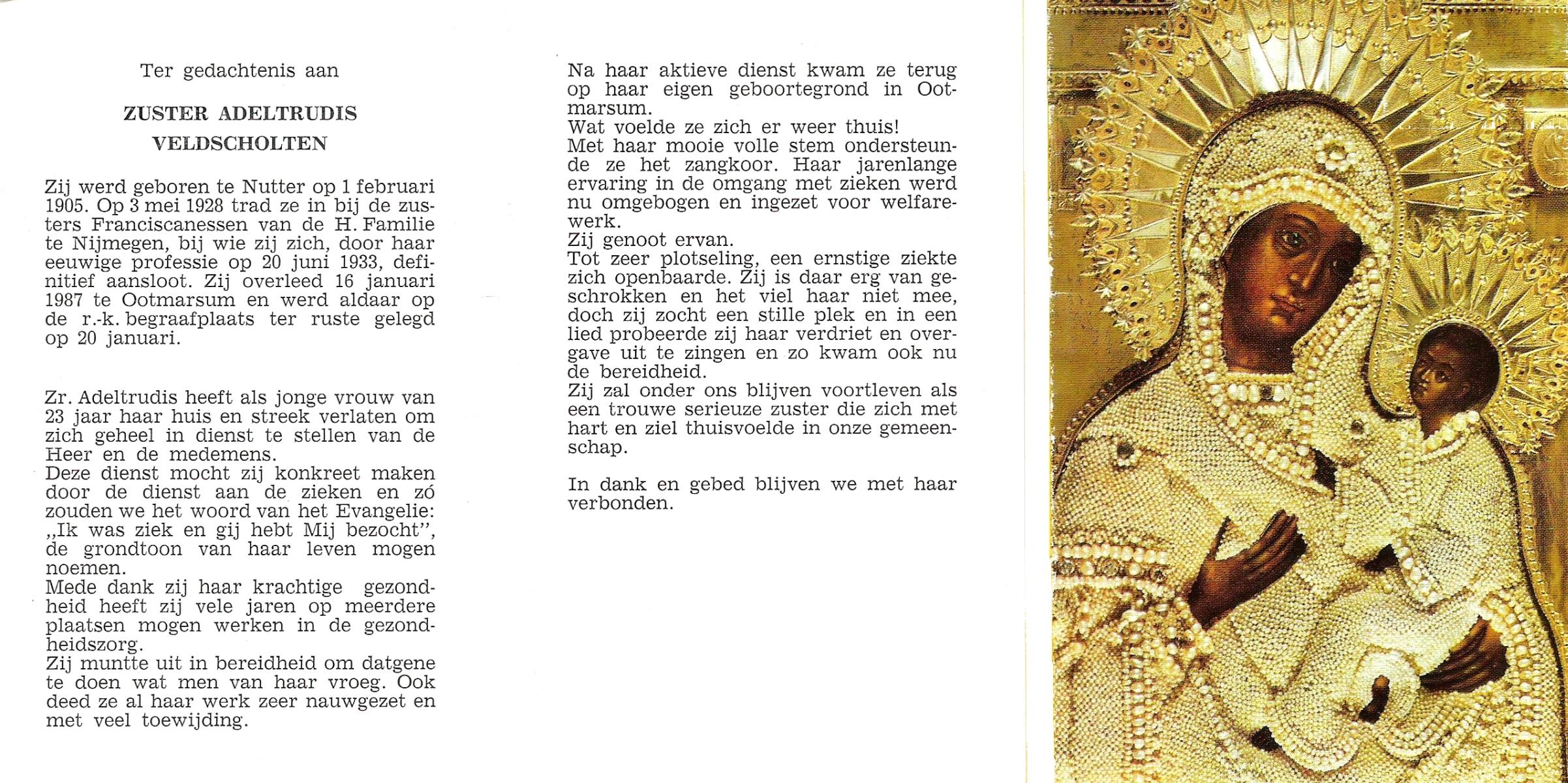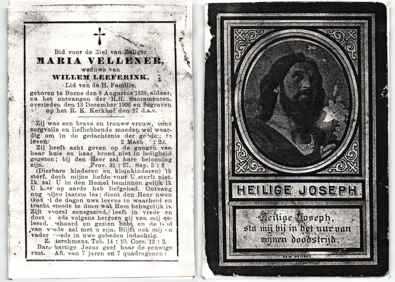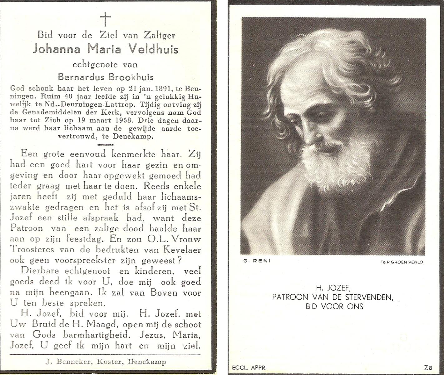 VELD, Maria Johanna, geboren op 18-01-1889 te Weerselo, overleden op 8-11-1969 te Oldenzaal op 80-jarige leeftijd, begraven te Oldenzaal R.K.kekrhof.