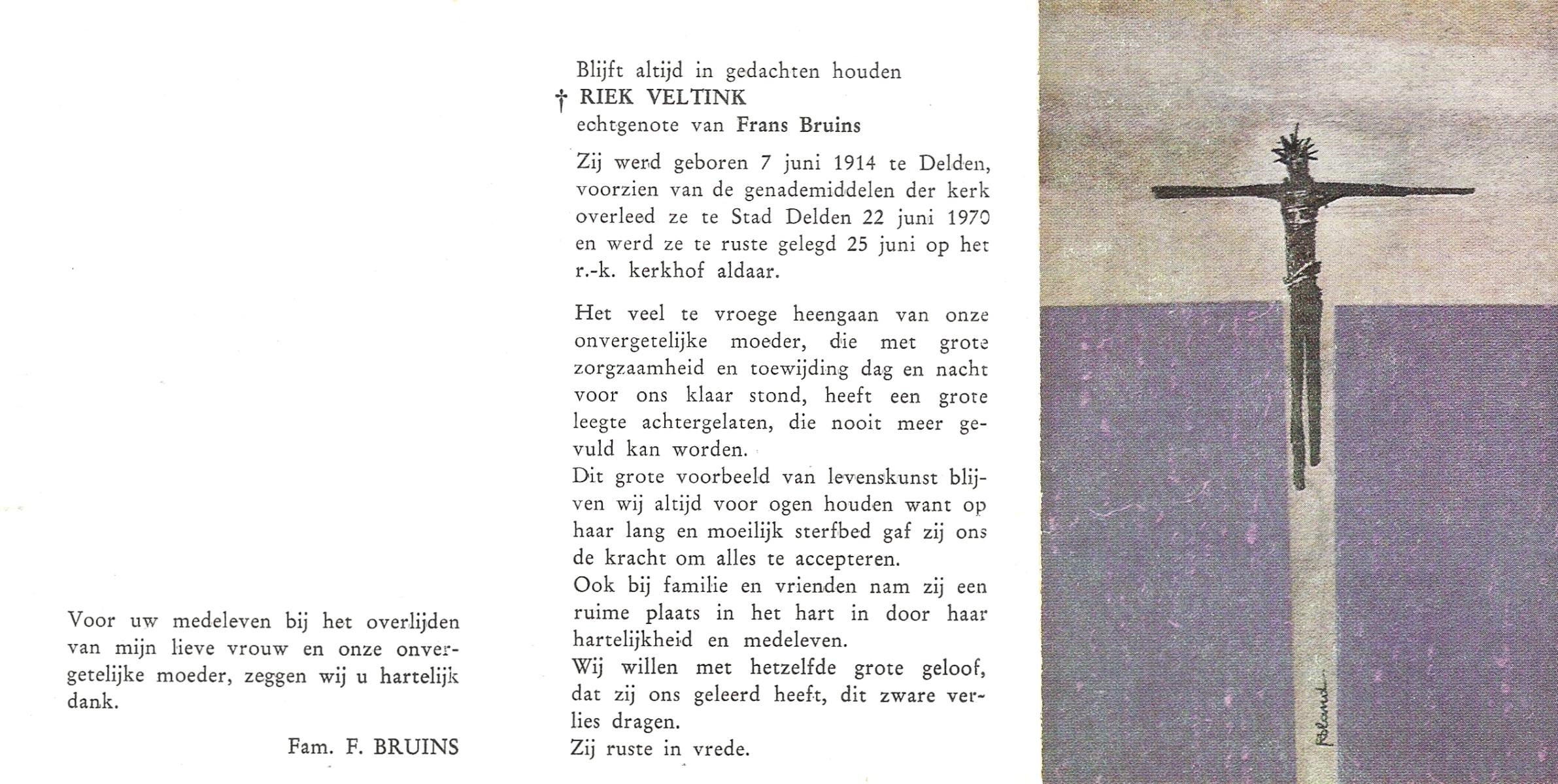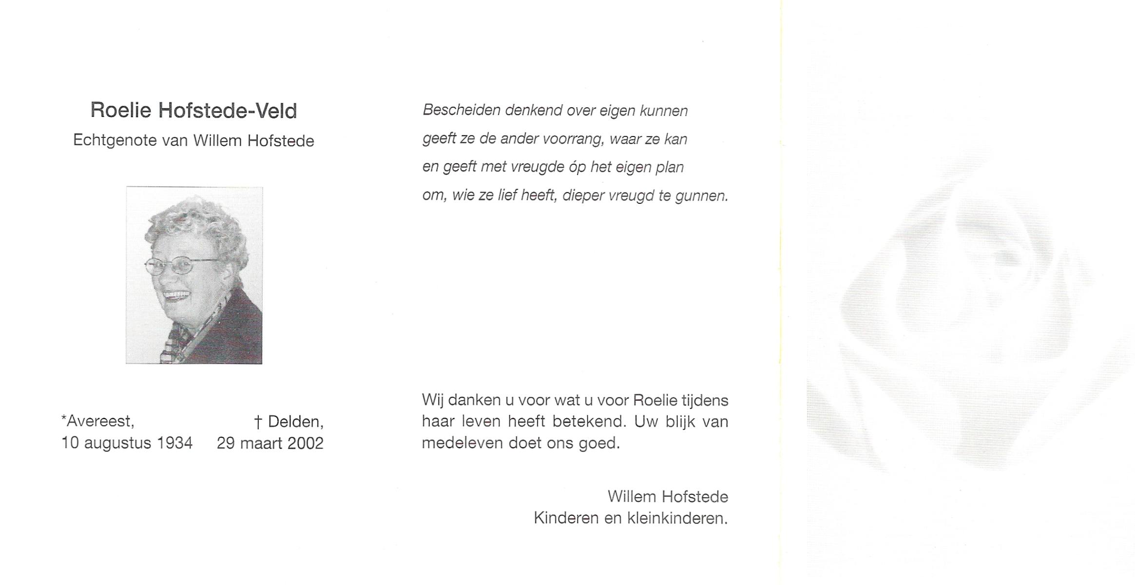 VELD, Roelie, geboren op 10-8-1934 te Avereest, overleden op 29-3-2002 te Delden op 68-jarige leeftijd.