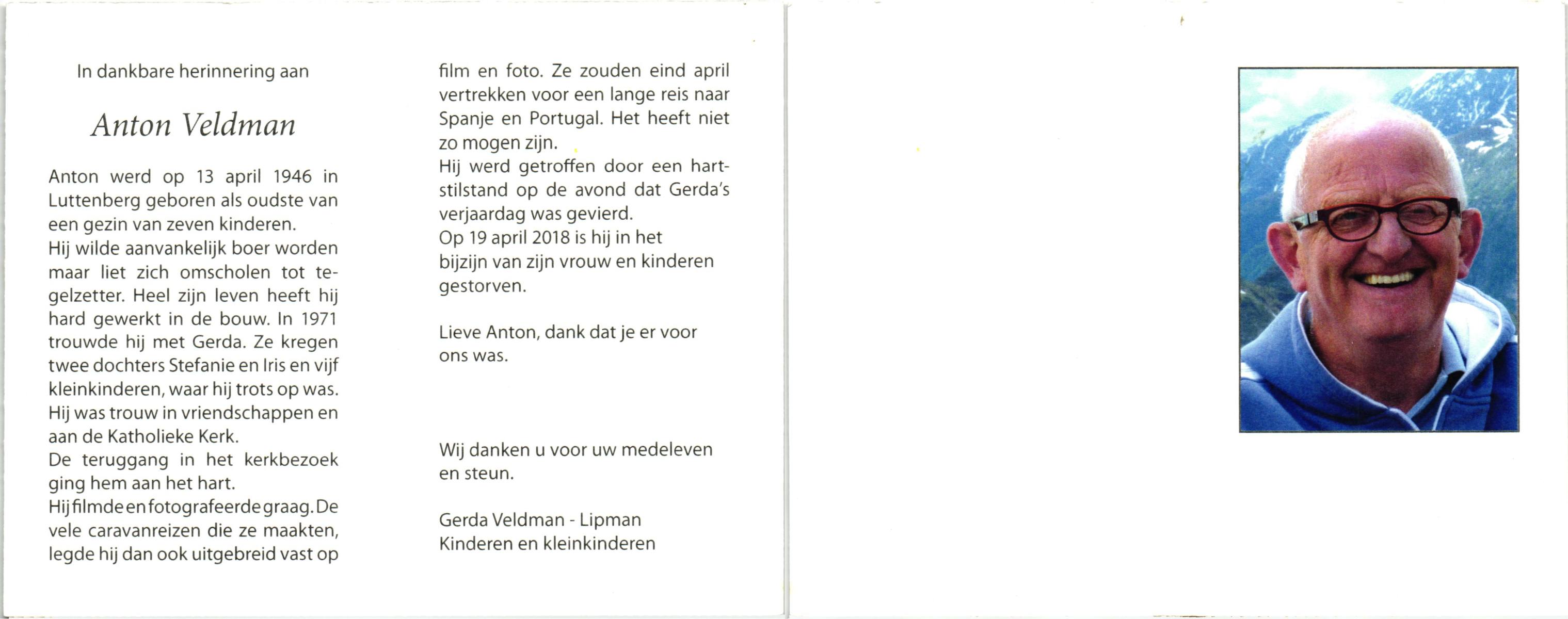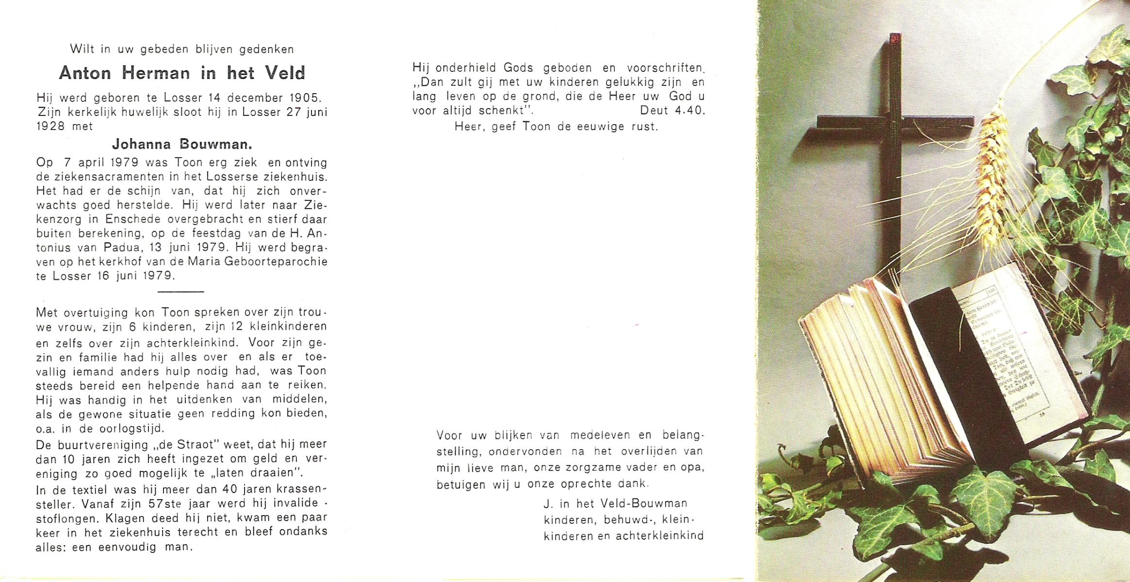 VELD, in het, Anton Herman, geboren op 14-12-1905 te Losser, overleden op 13-6-1979 te Enschede op 73-jarige leeftijd, begraven op 16-6-1979 te Losser.
