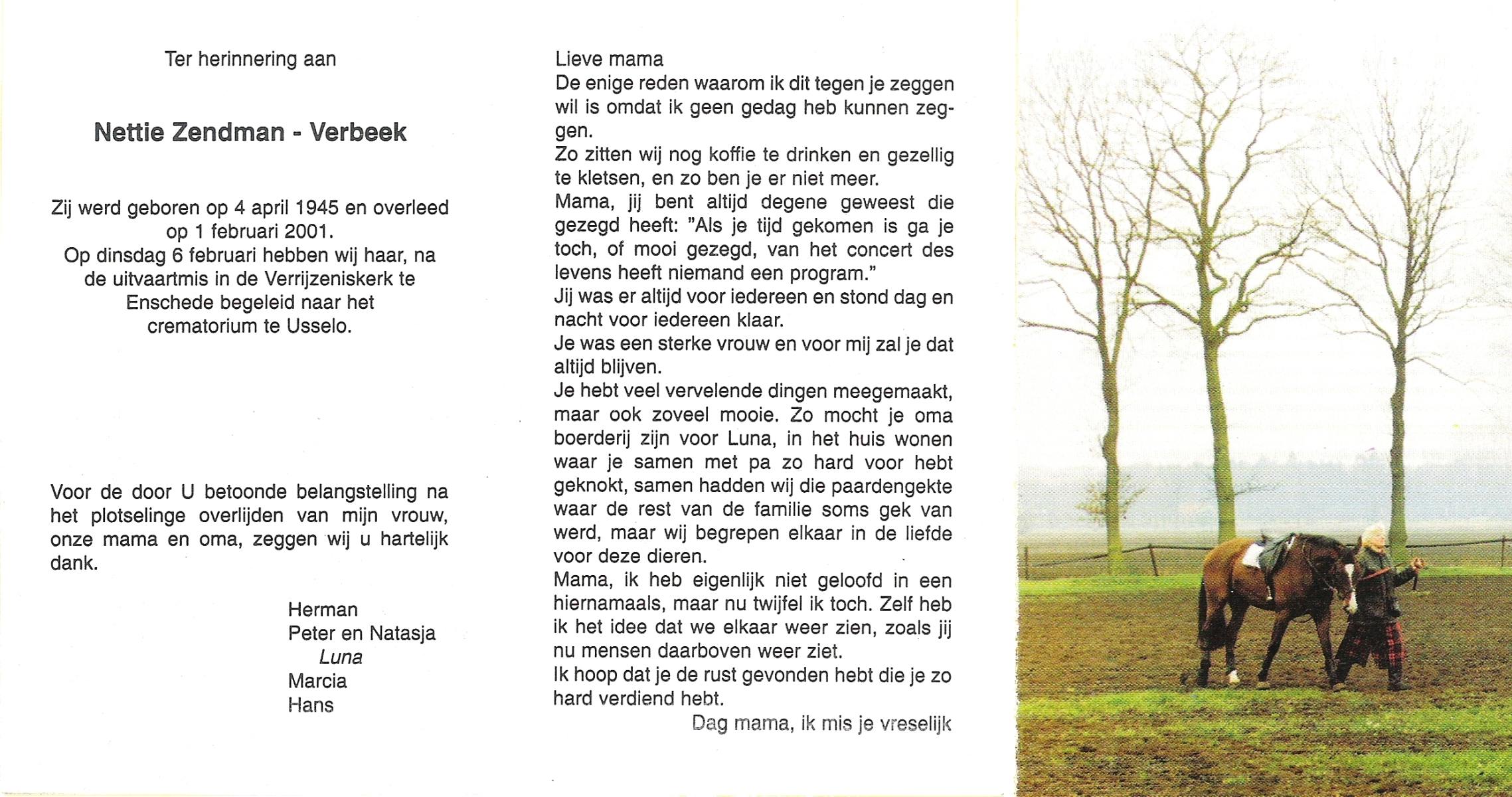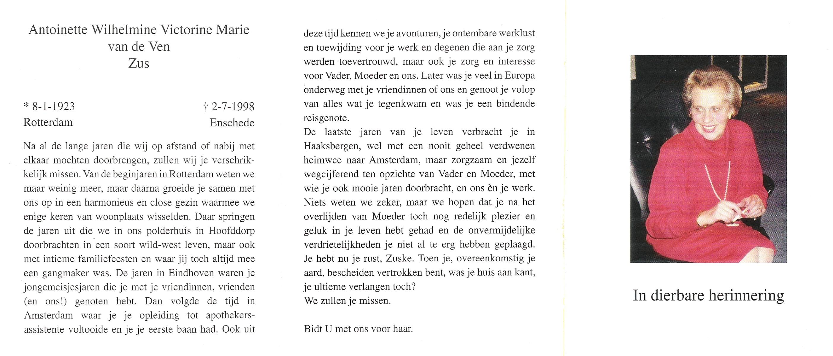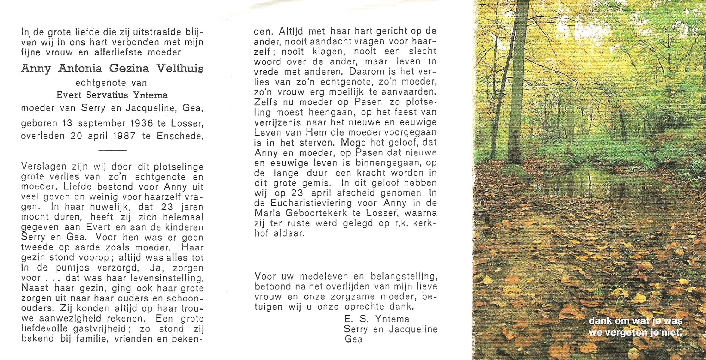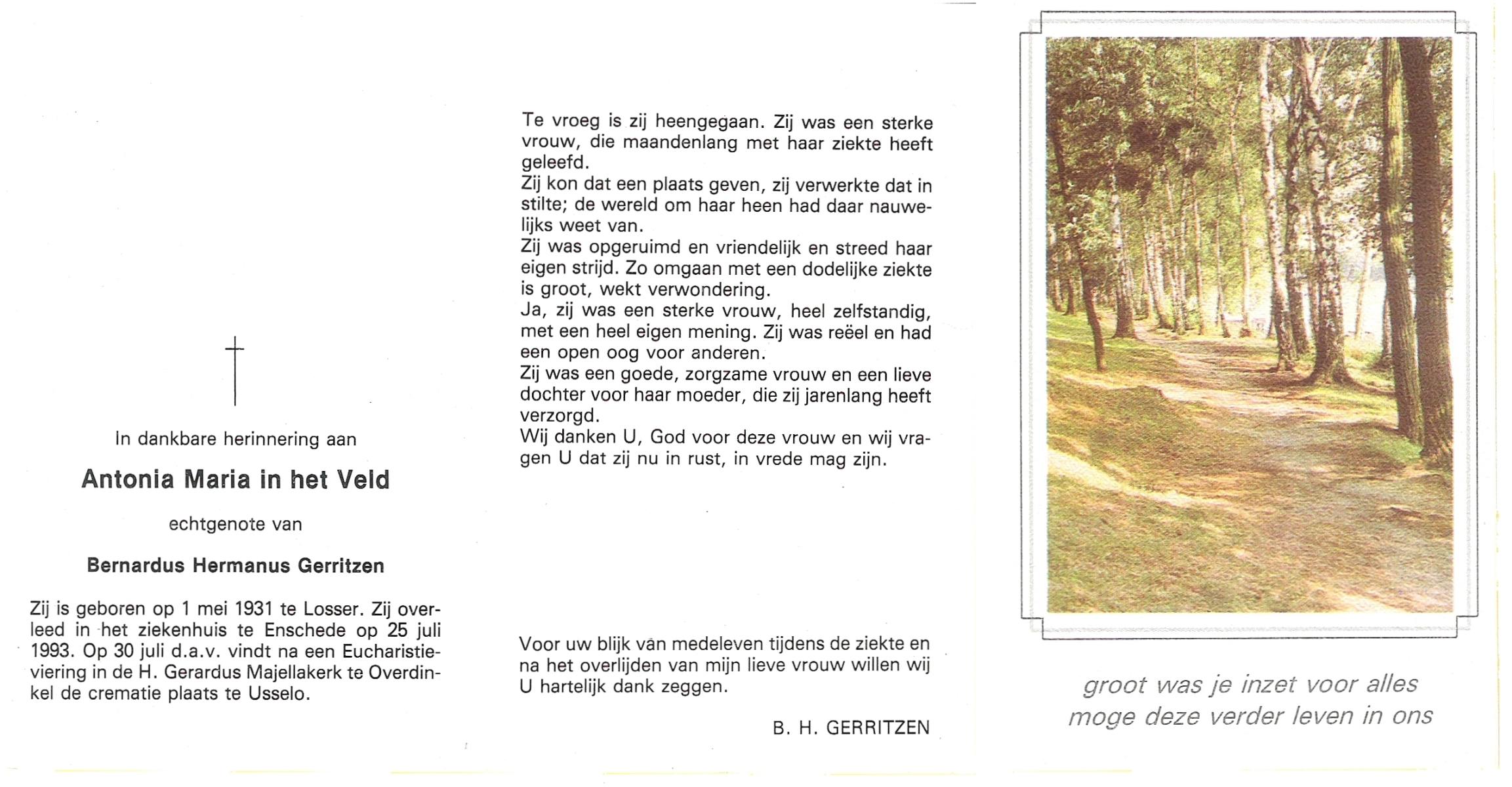 VELD, in het, Antonia Maria, geboren op 1-5-1931 te Losser, overleden op 25-7-1993 te Enschede op 62-jarige leeftijd, gecremeerd op 30-7-1993 te Usselo.