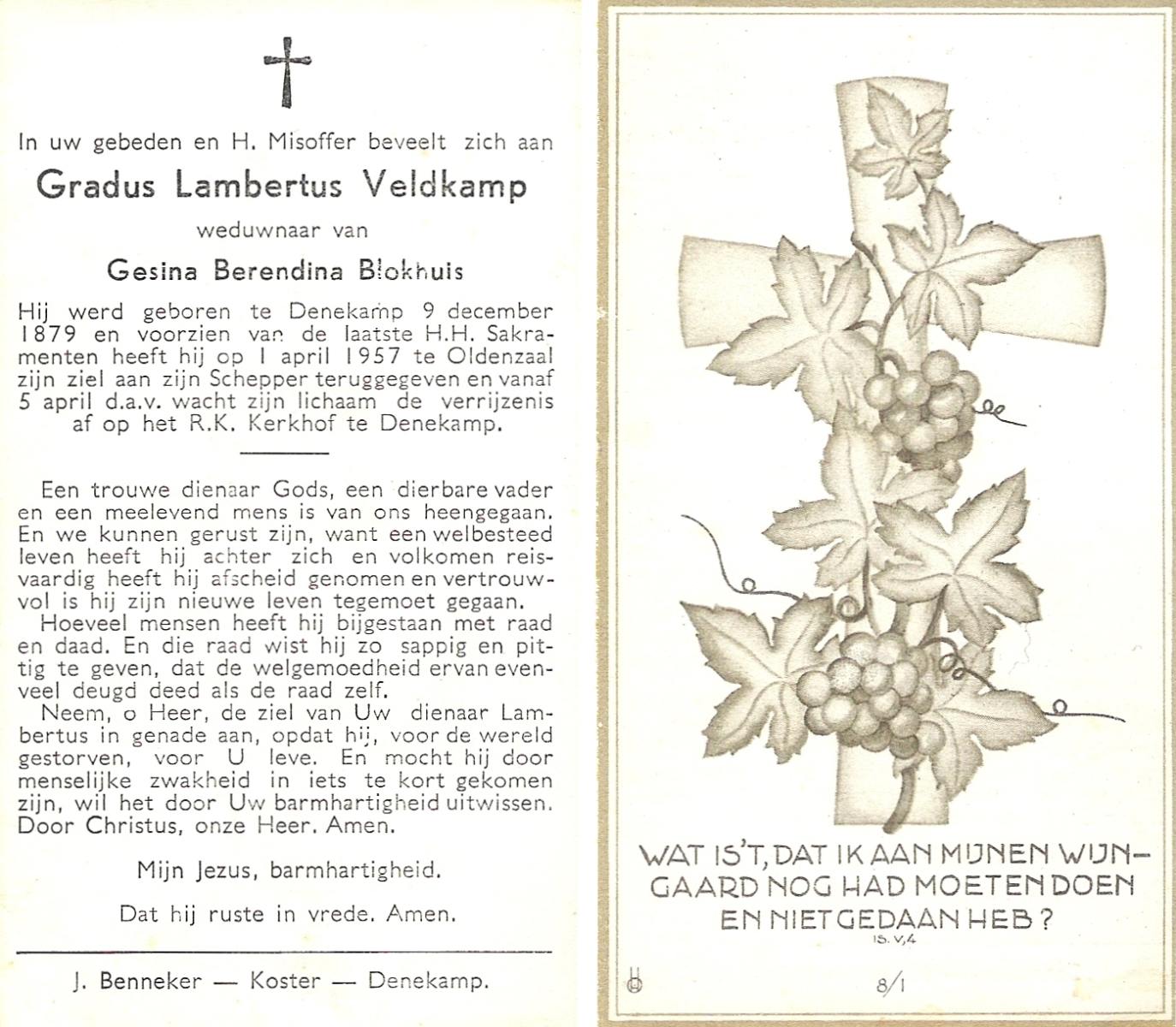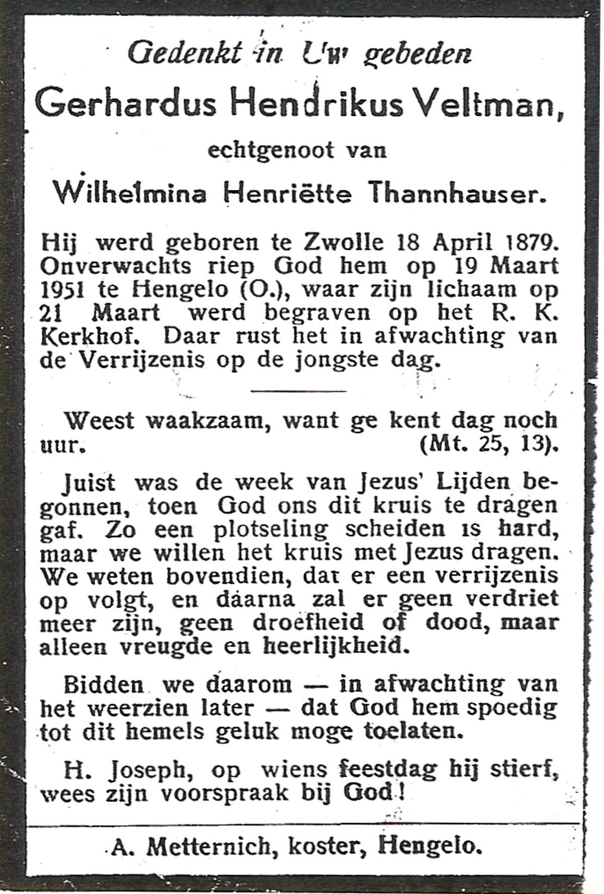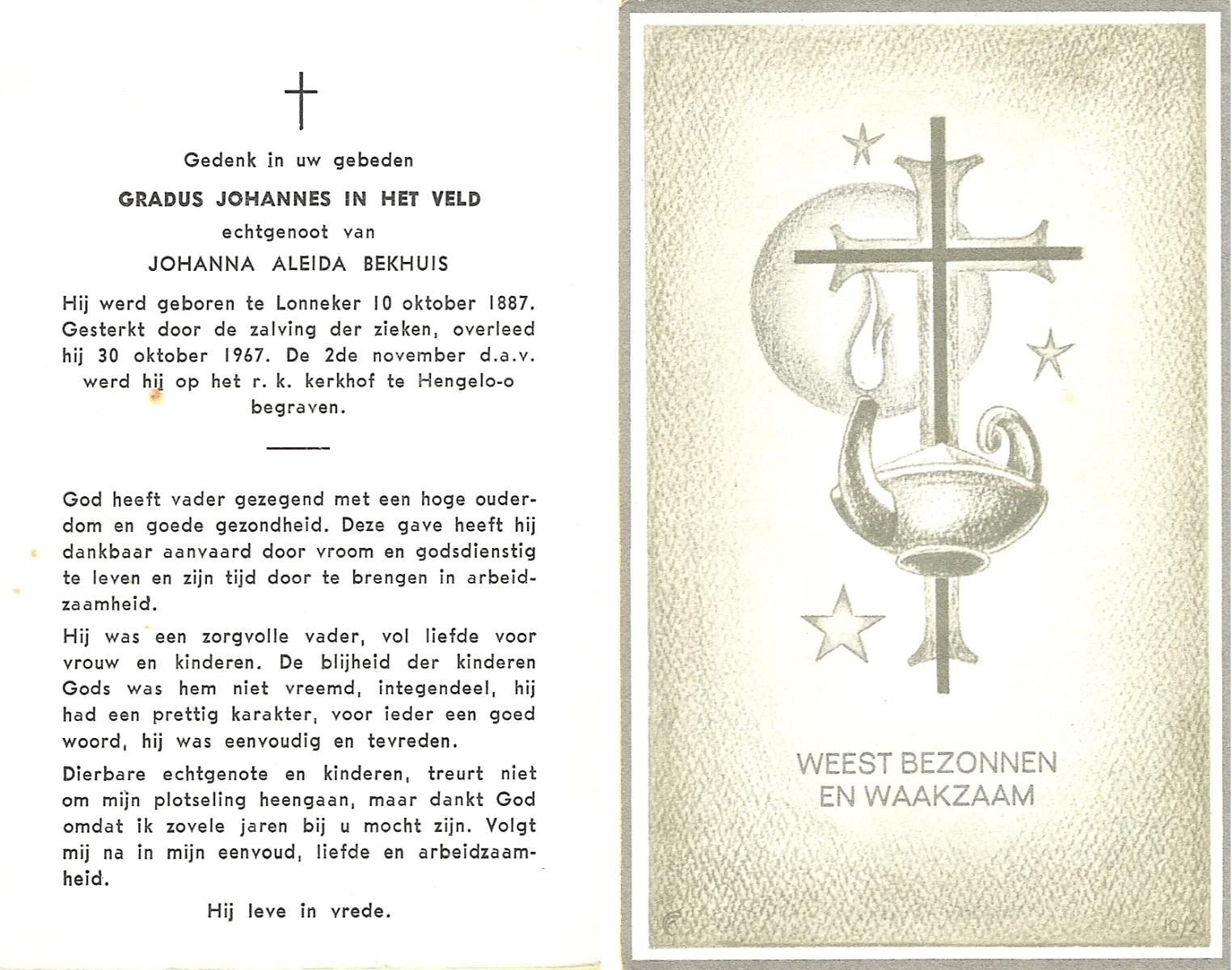 VELD, in het, Gradus Johannes, geboren op 10-10-1887 te Lonneker, overleden op 30-10-1967 op 80-jarige leeftijd, begraven op 2-11-1967 te Hengelo (Ov.).