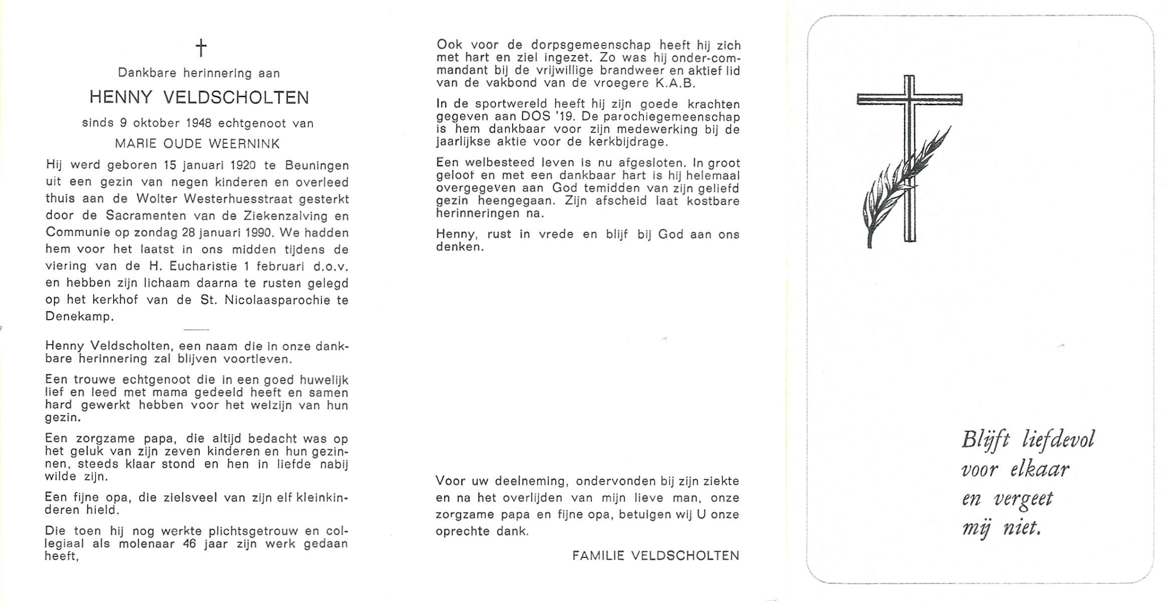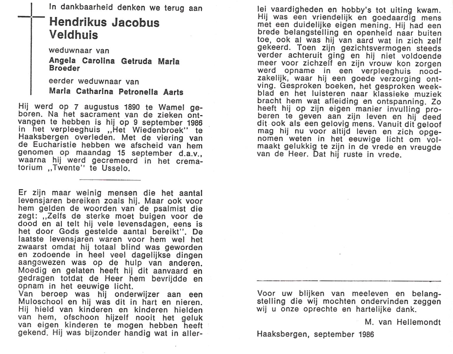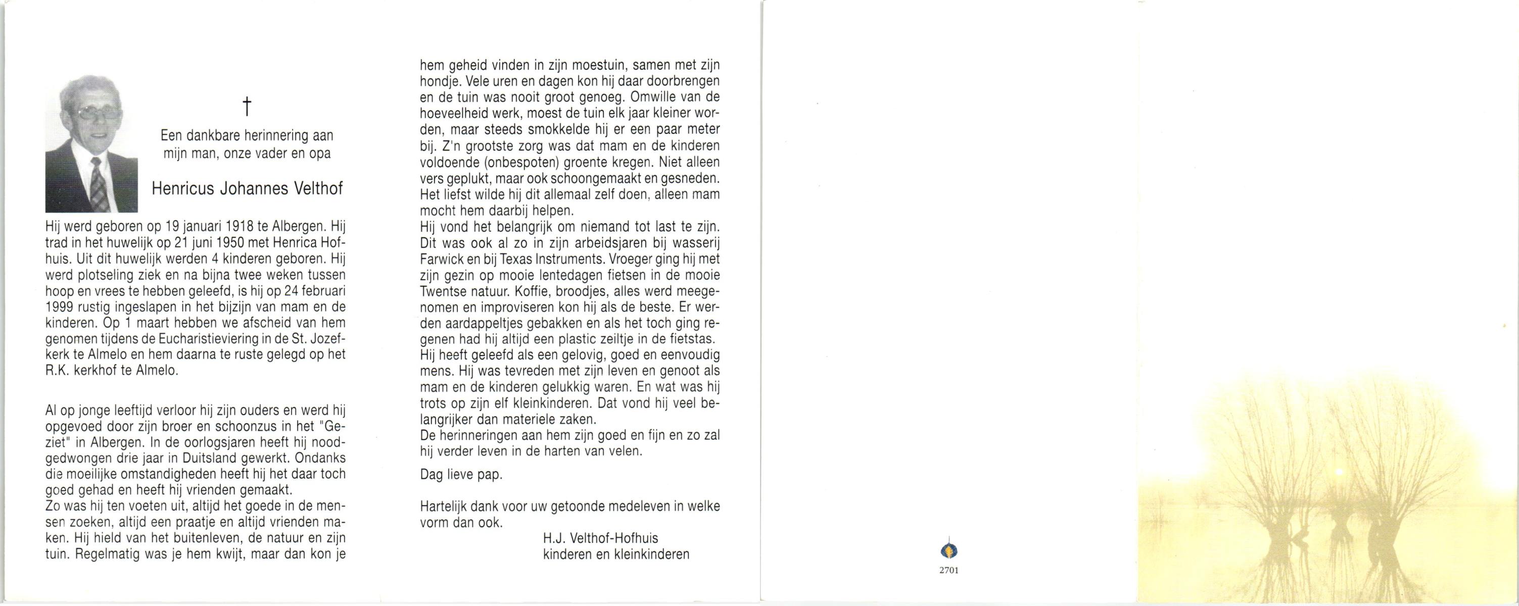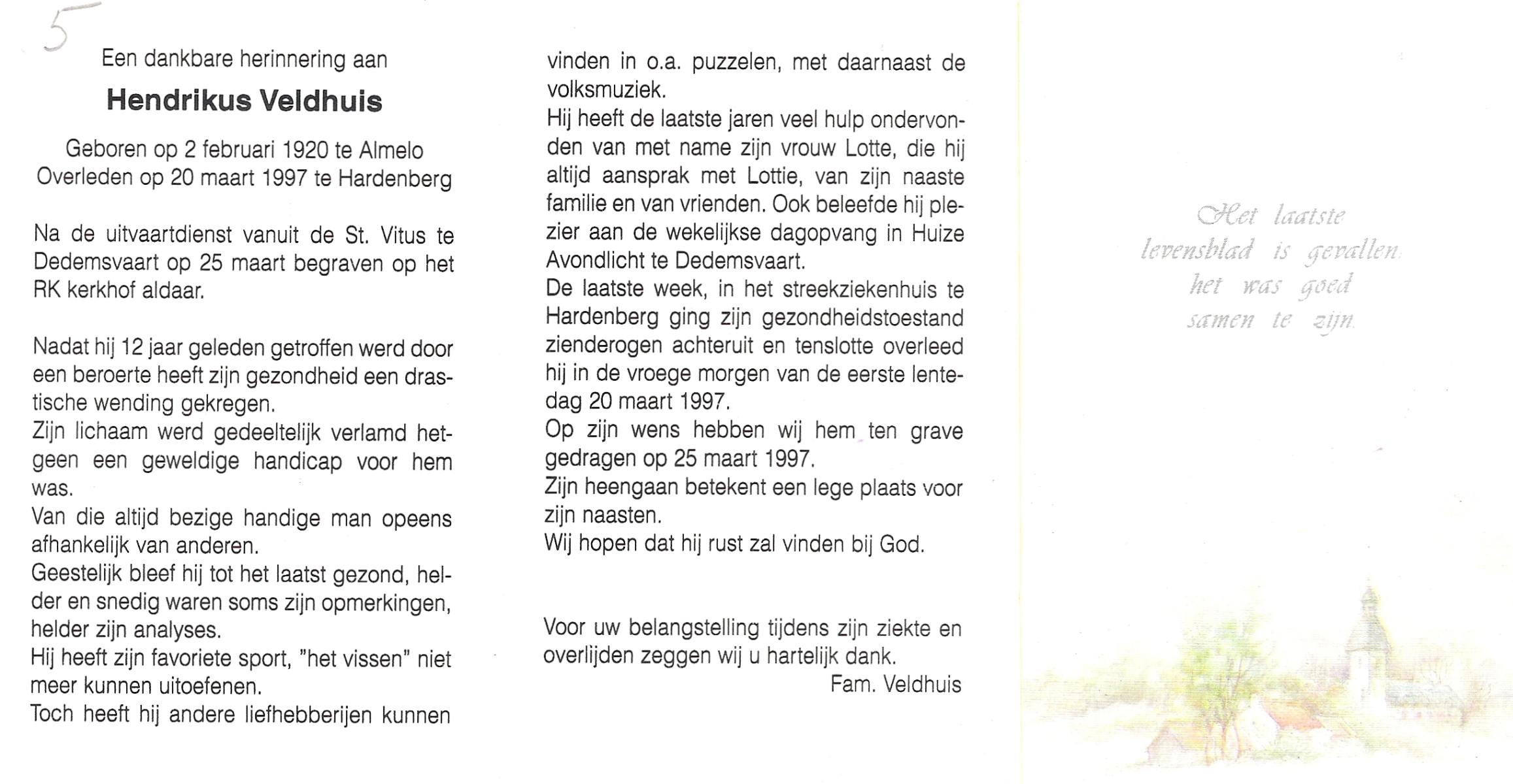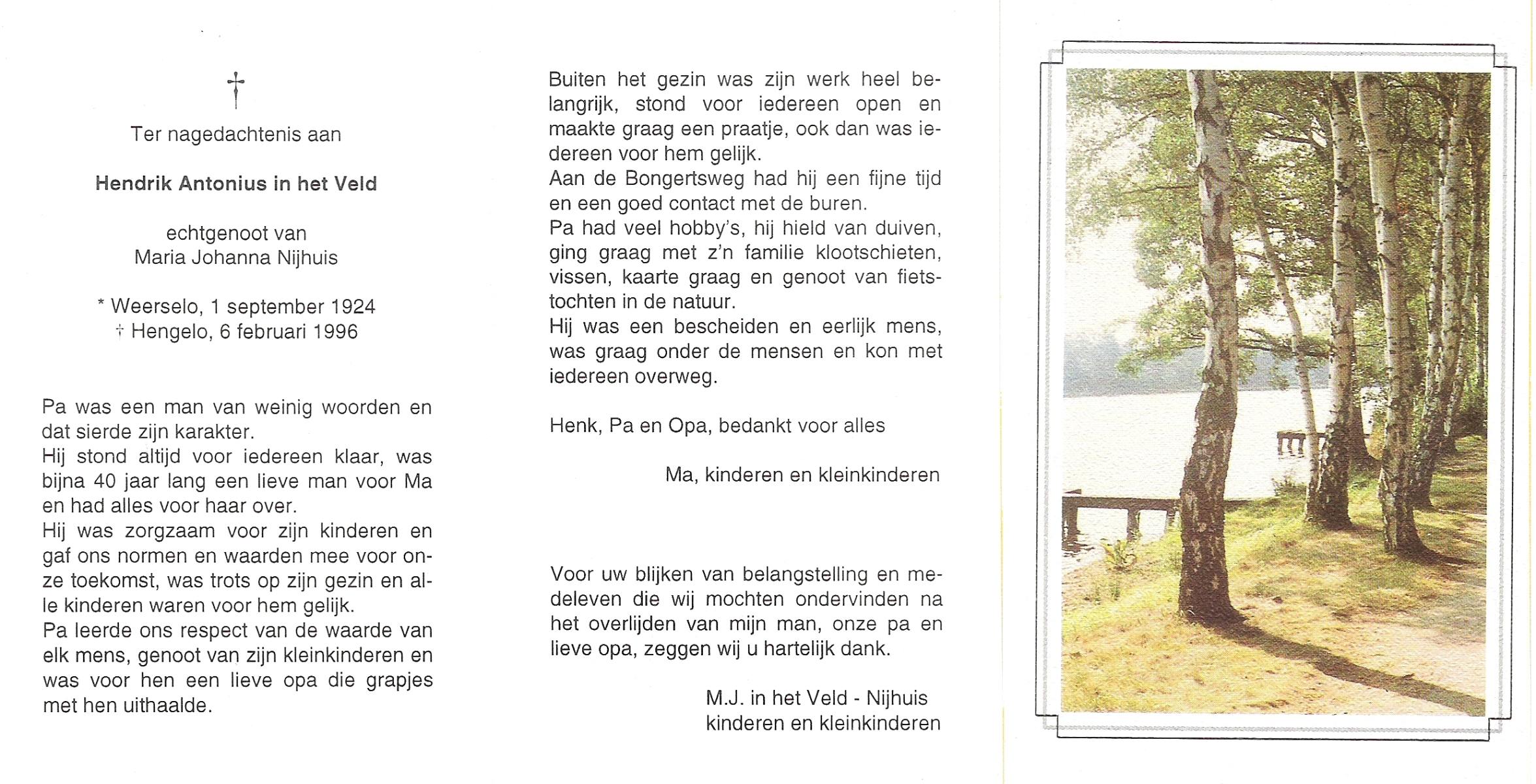 VELD, in het, Hendrik Antonius, geboren op 1-9-1924 te Weerselo, overleden op 8-2-1996 te Hengelo (Ov.) op 71-jarige leeftijd.