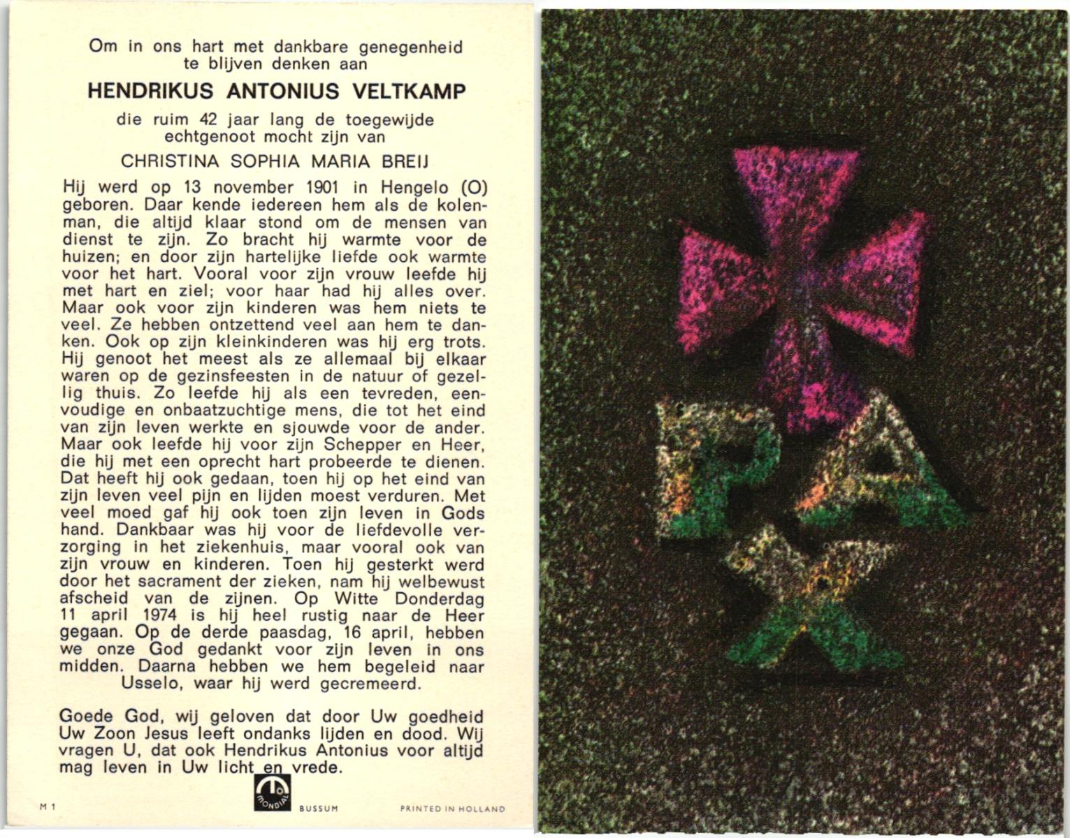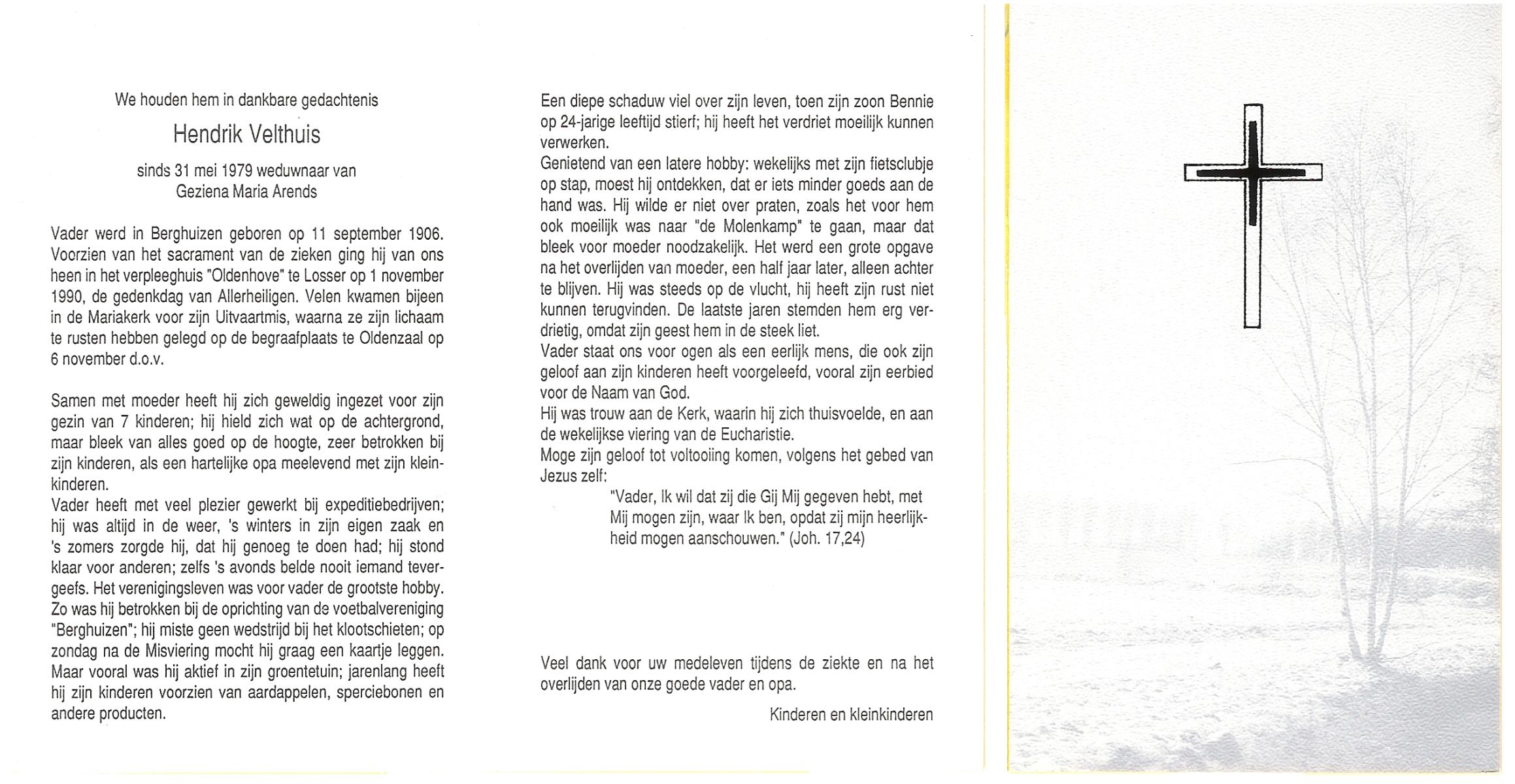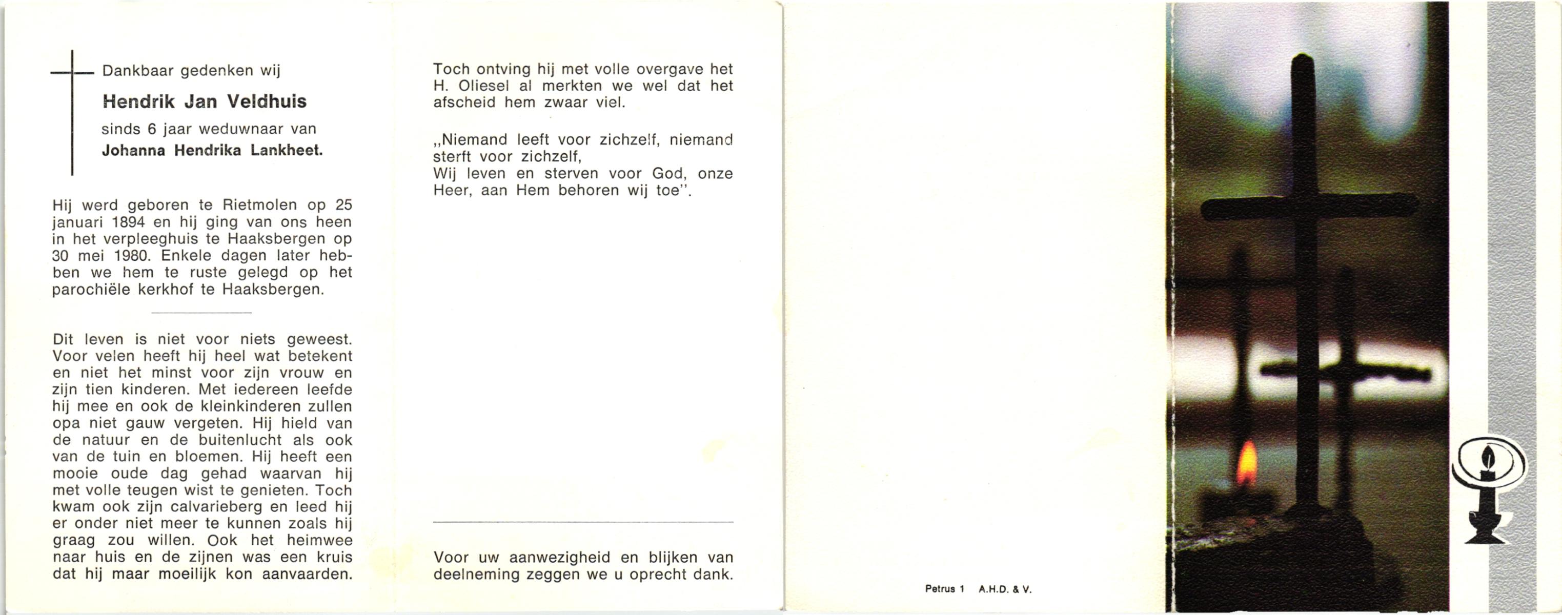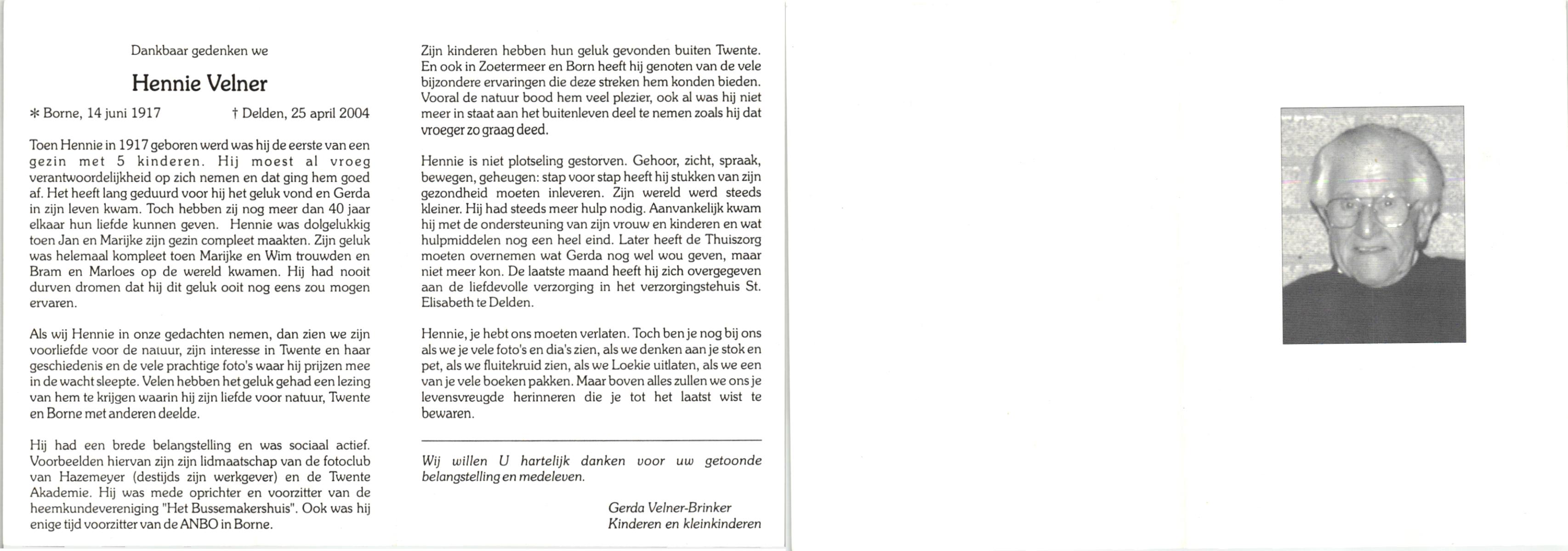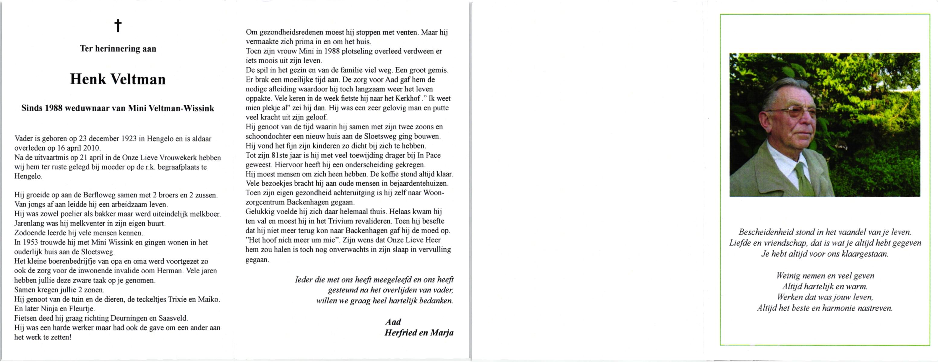 VELD, in het, Hendrik Antonius, geboren op 1-9-1924 te Weerselo, overleden op 8-2-1996 te Hengelo (Ov.) op 71-jarige leeftijd.