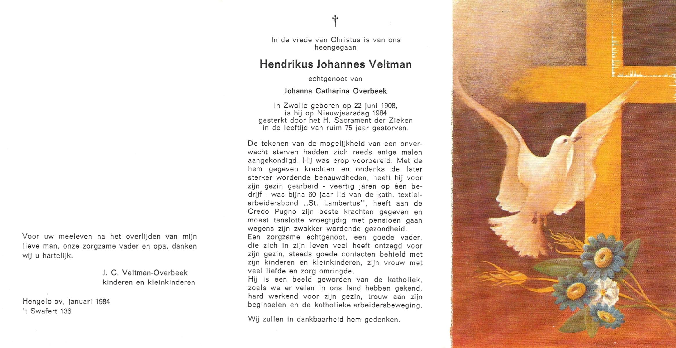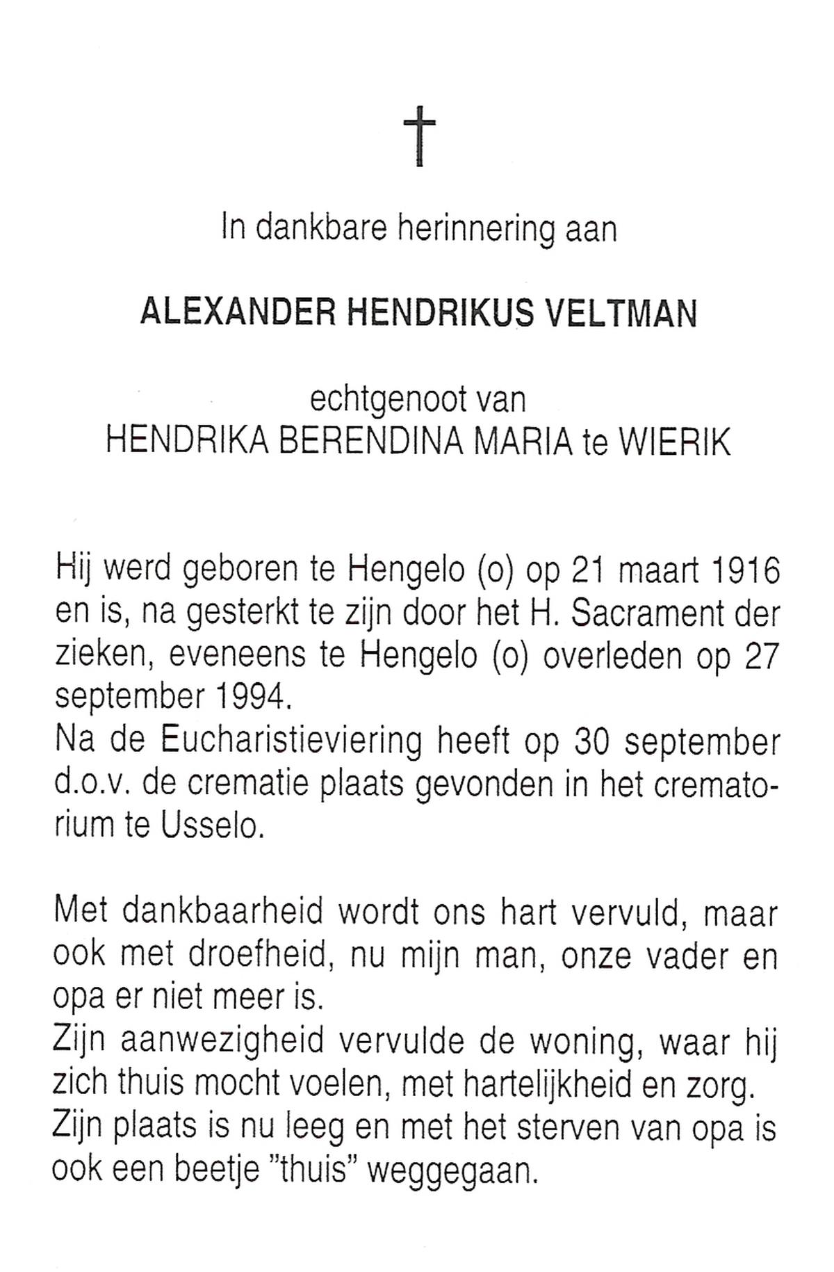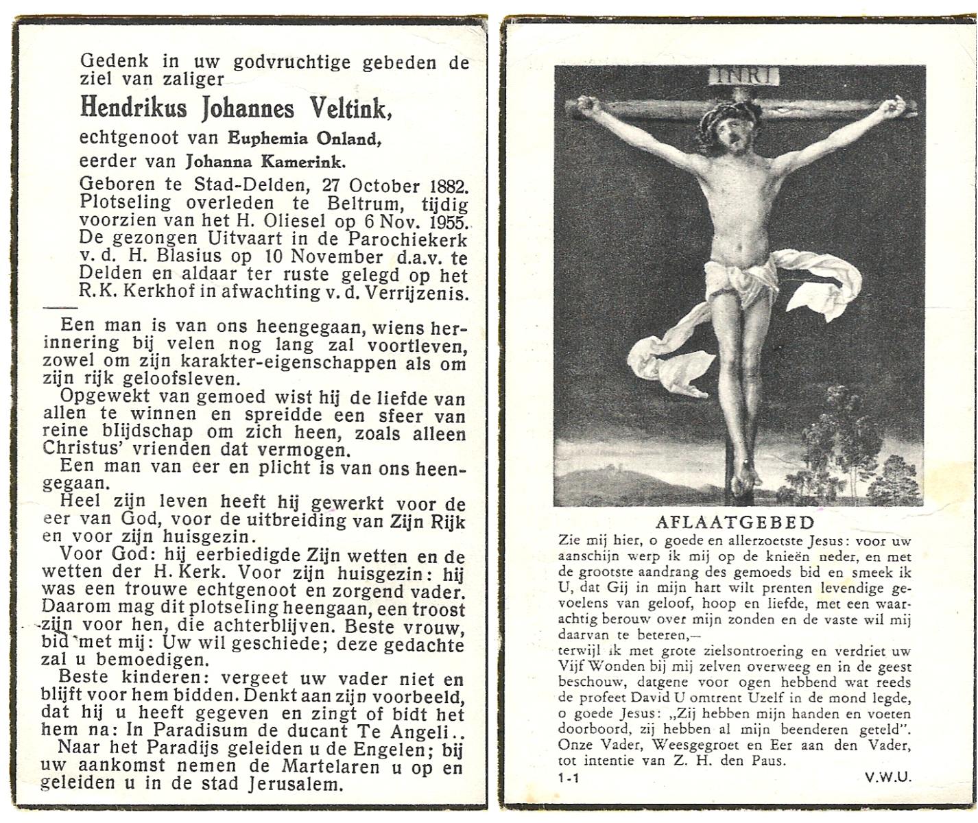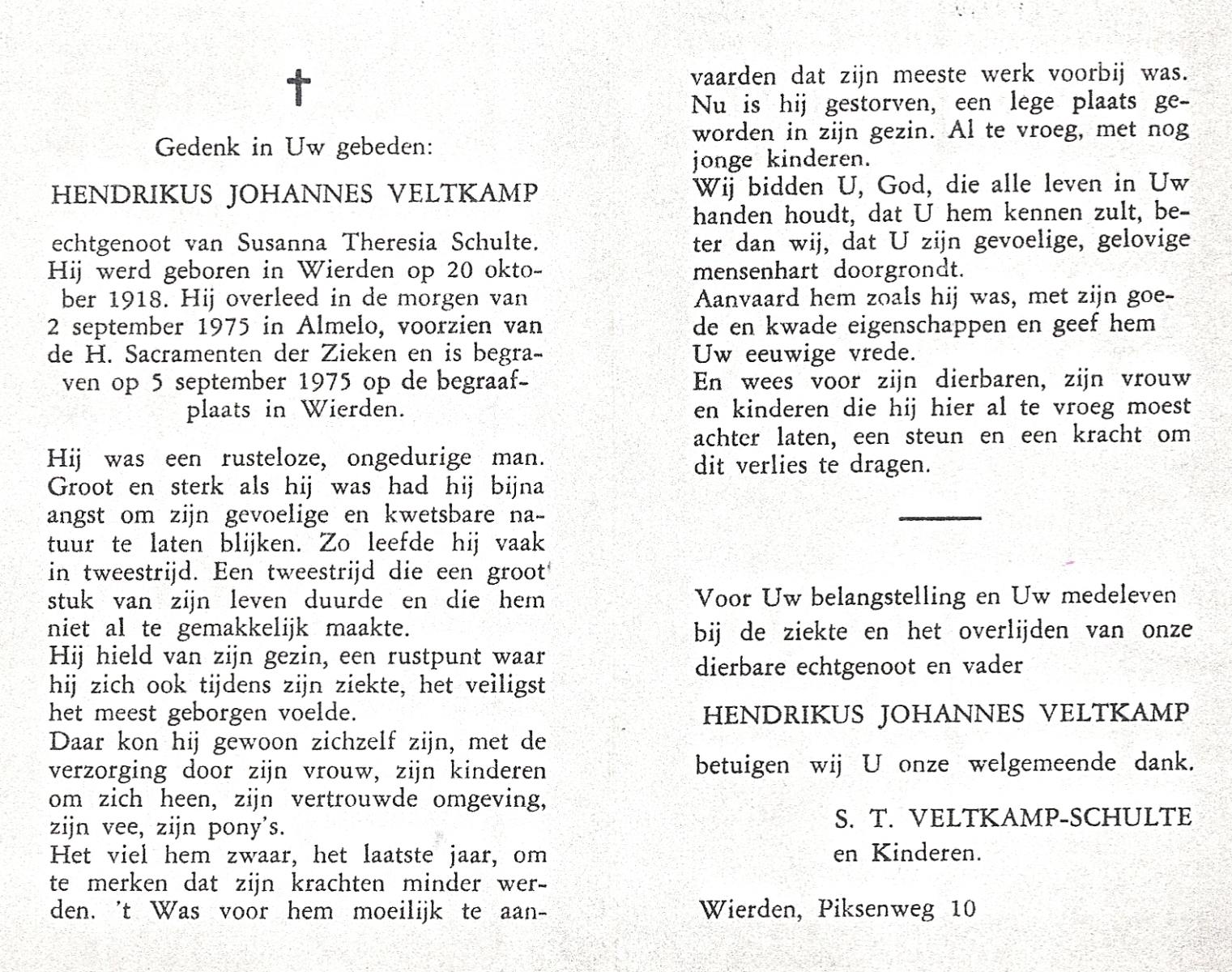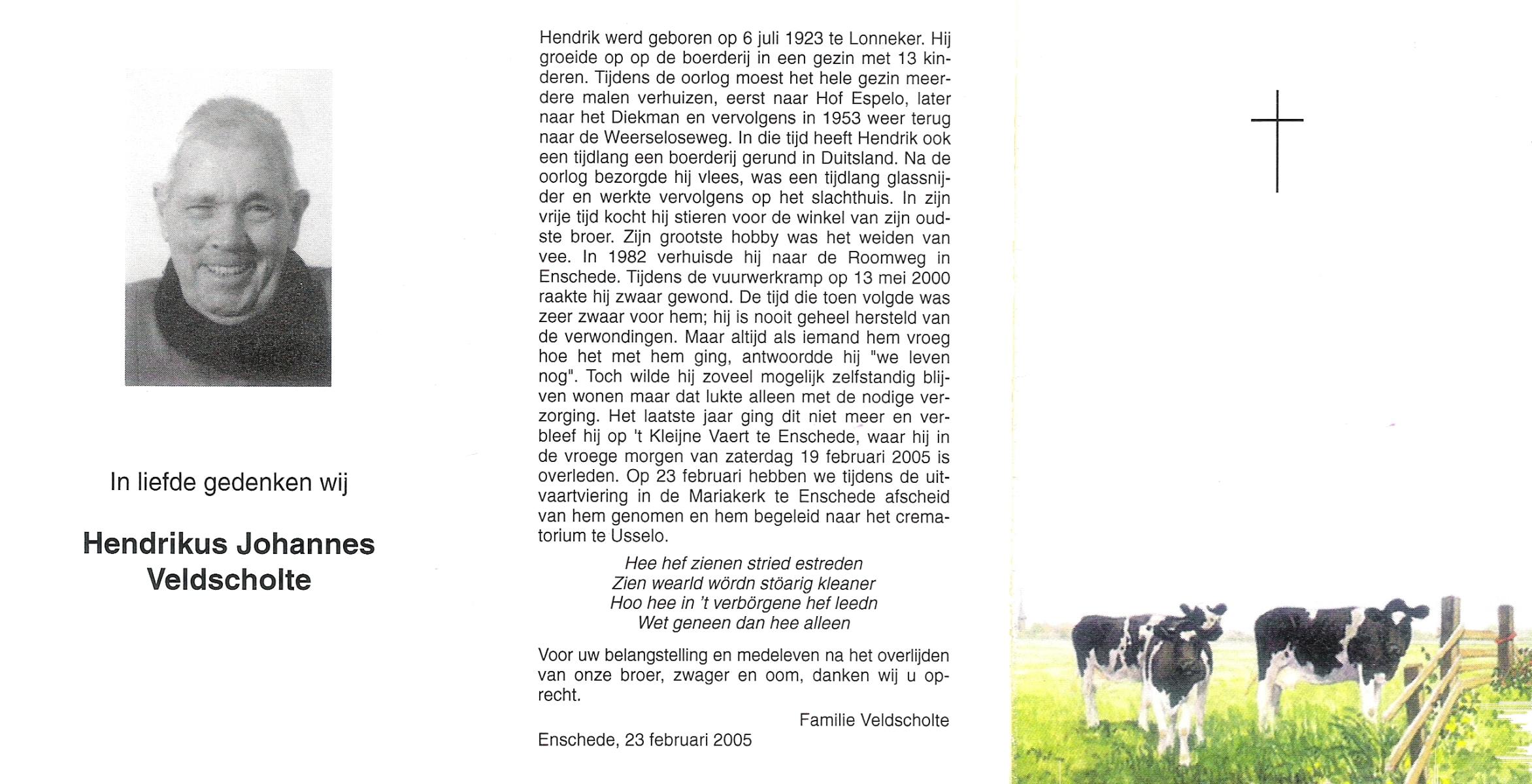 VELD, in het, Hendrik Antonius, geboren op 1-9-1924 te Weerselo, overleden op 8-2-1996 te Hengelo (Ov.) op 71-jarige leeftijd.