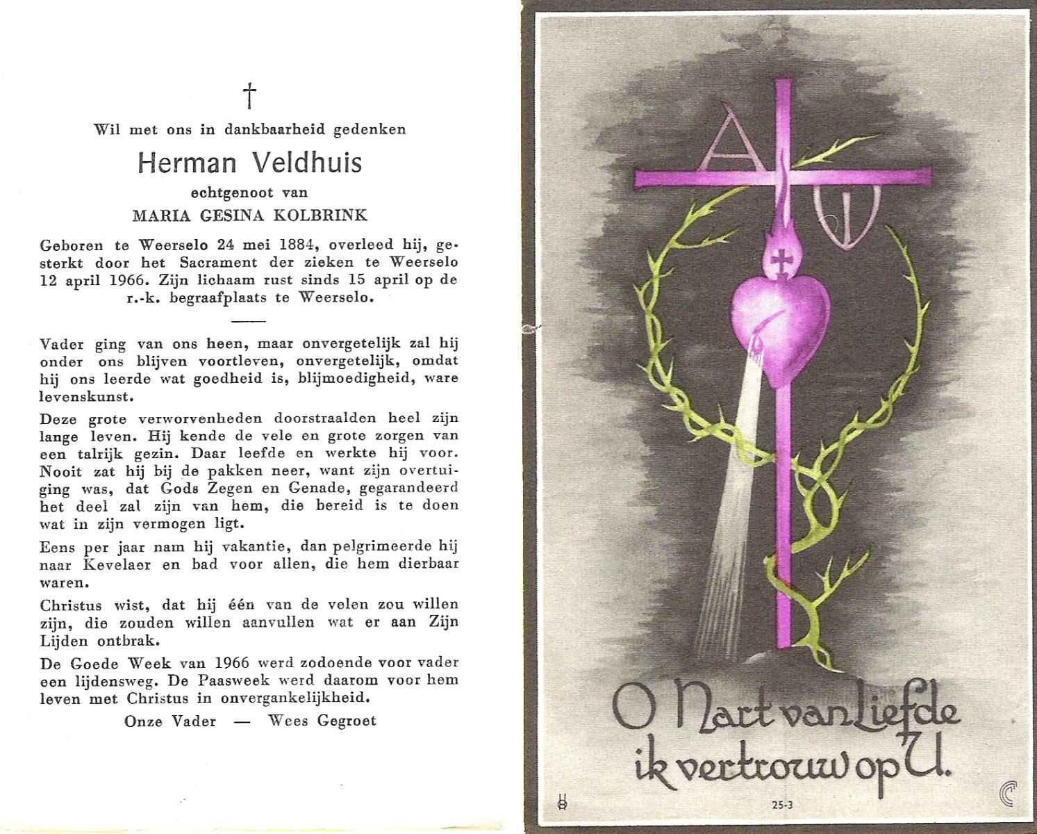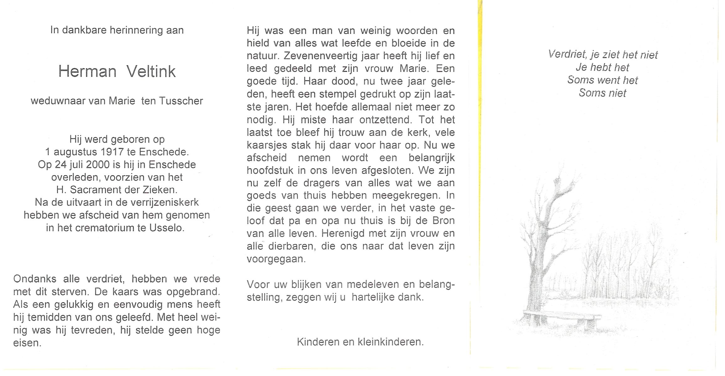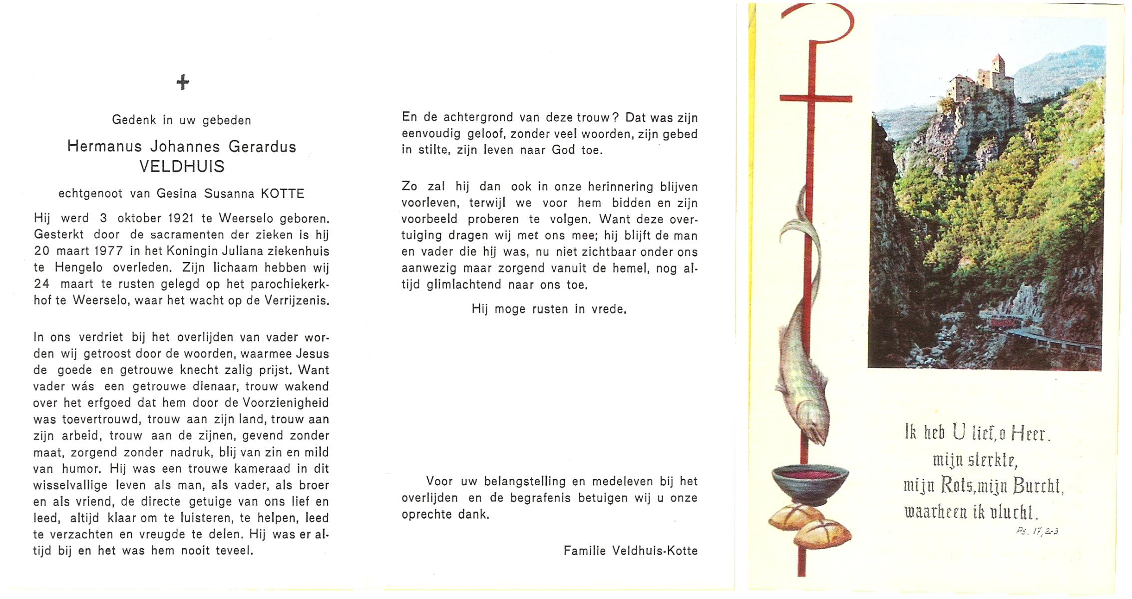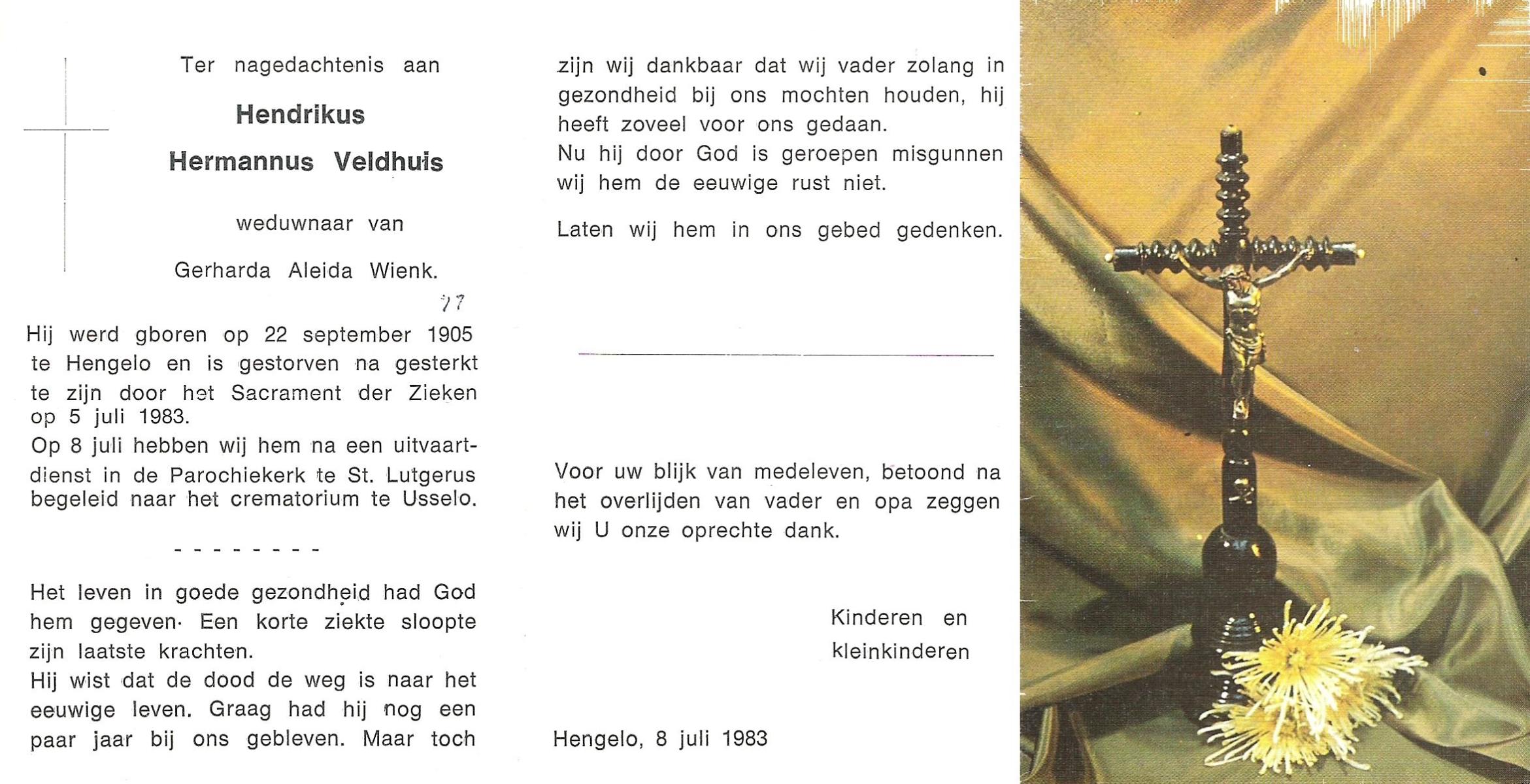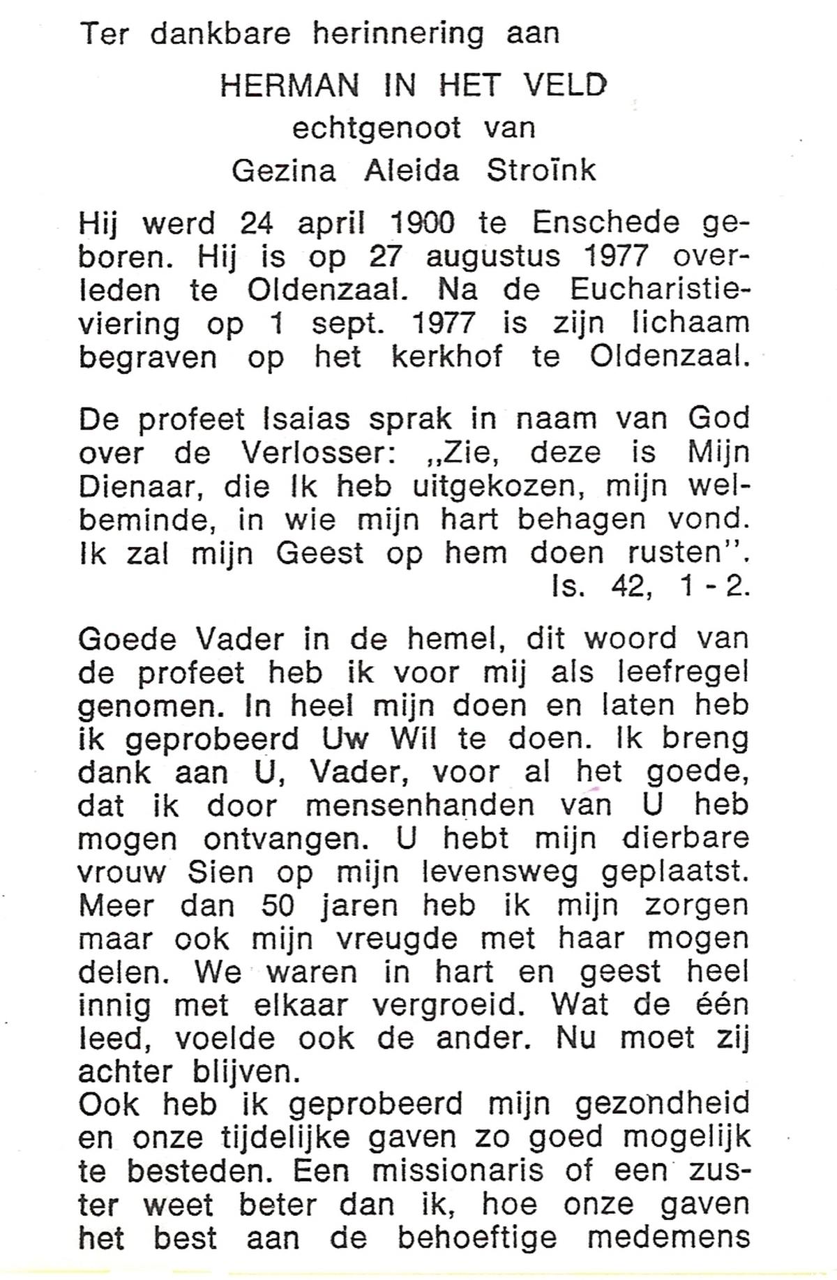 VELD, in het, Herman, geboren op 24-4-1900 te Enschede, overleden op 27-8-1977 te Oldenzaal op 77-jarige leeftijd.