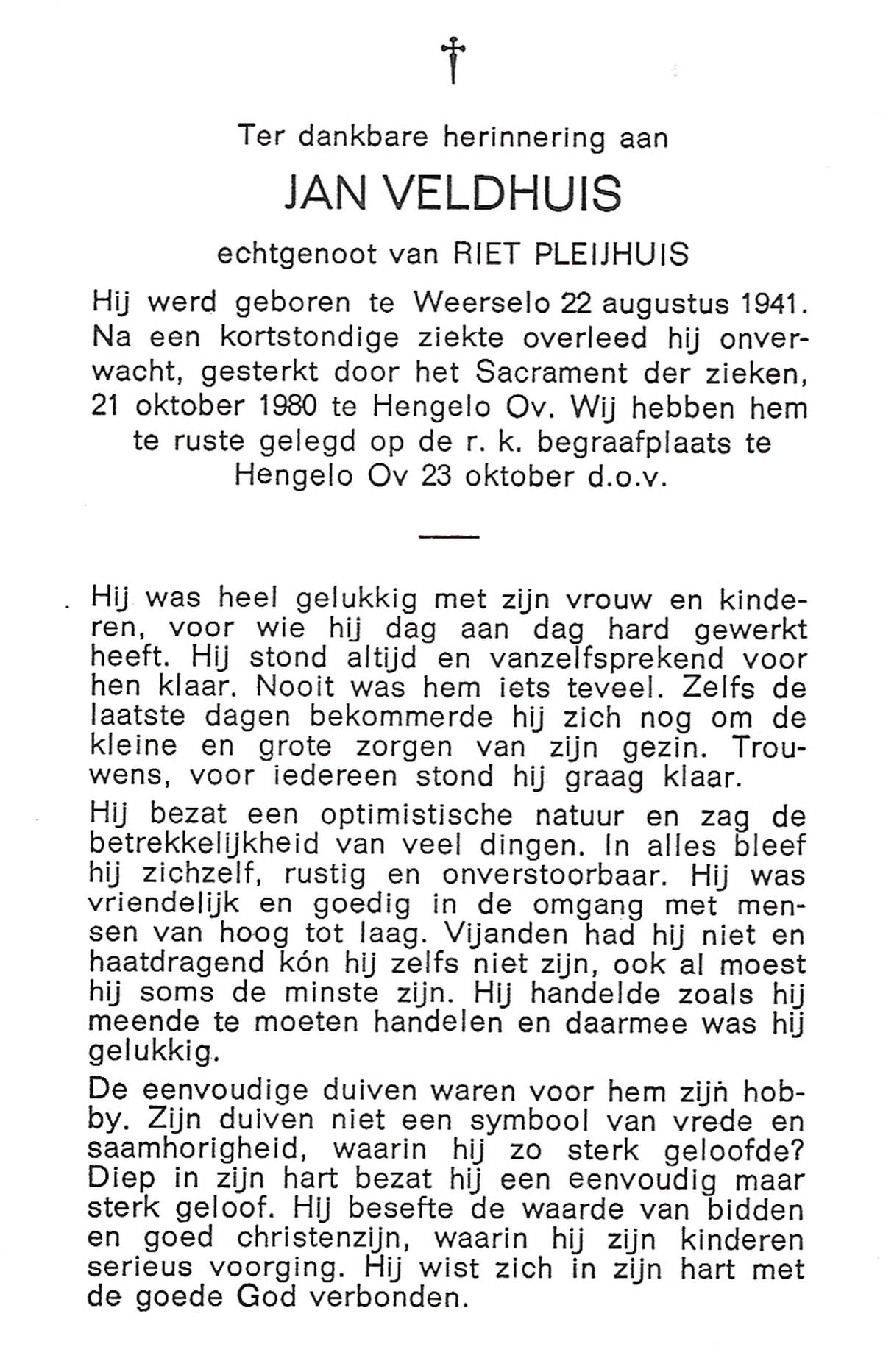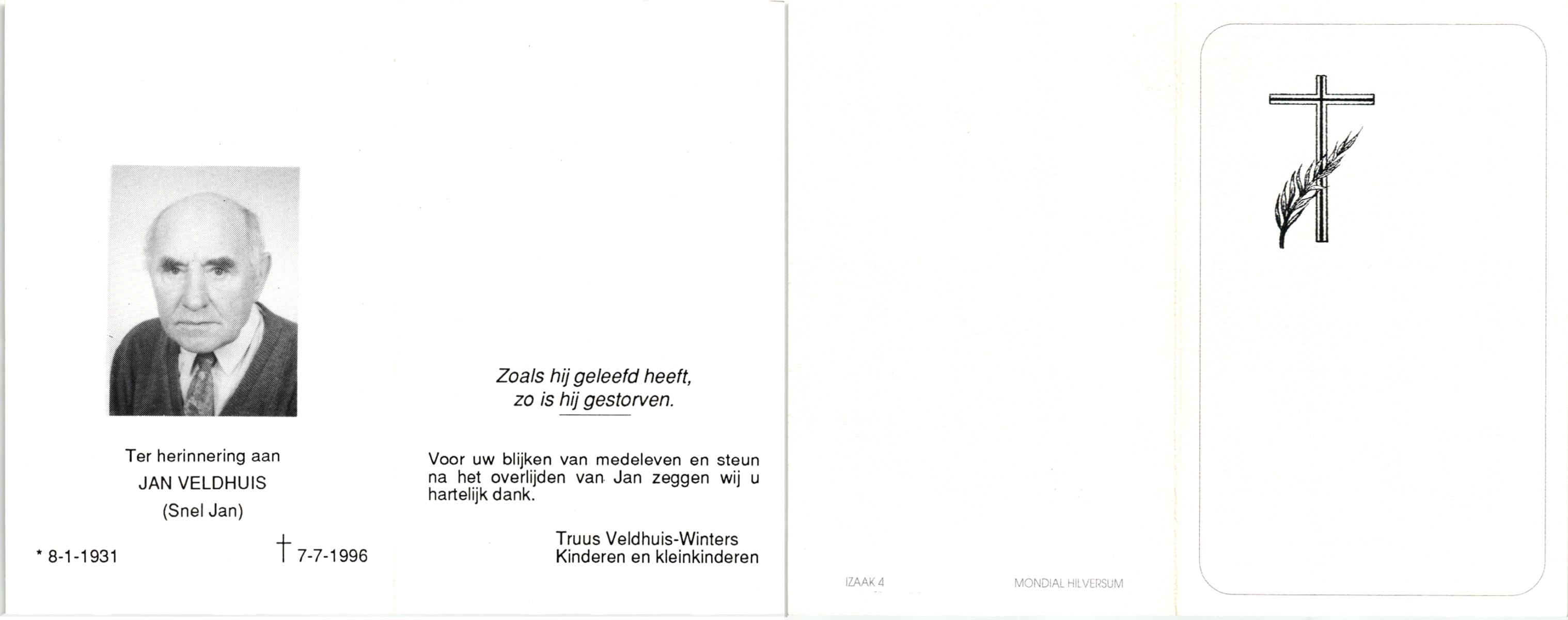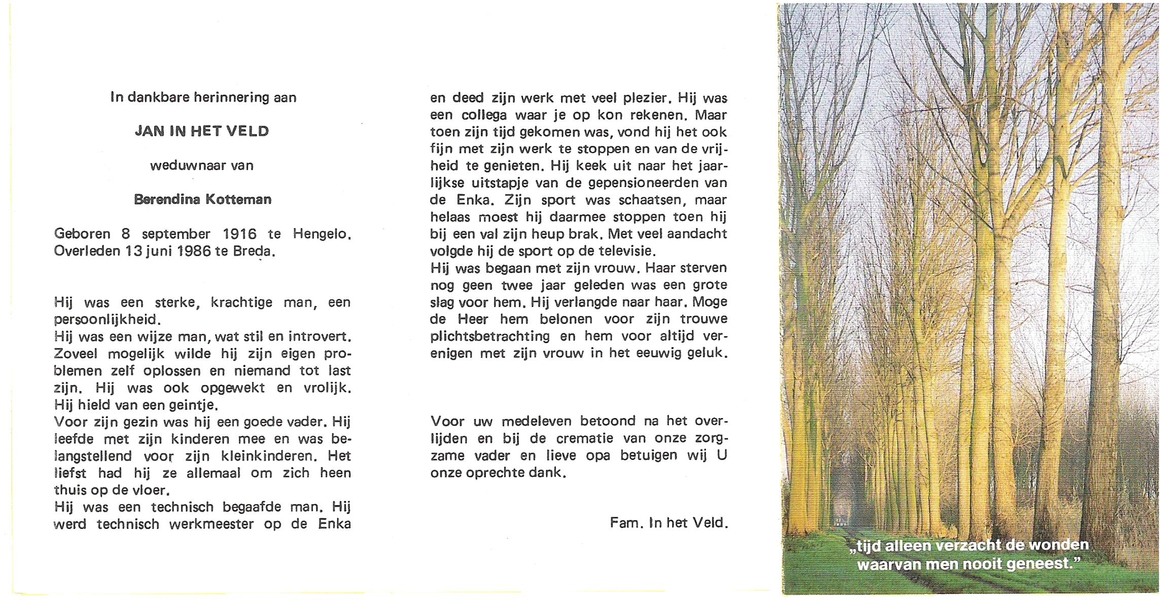 VELD, in het, Jan, geboren op 8-9-1916 te Hengelo (O), overleden op 13-6-1986 te Breda op 70-jarige leeftijd.