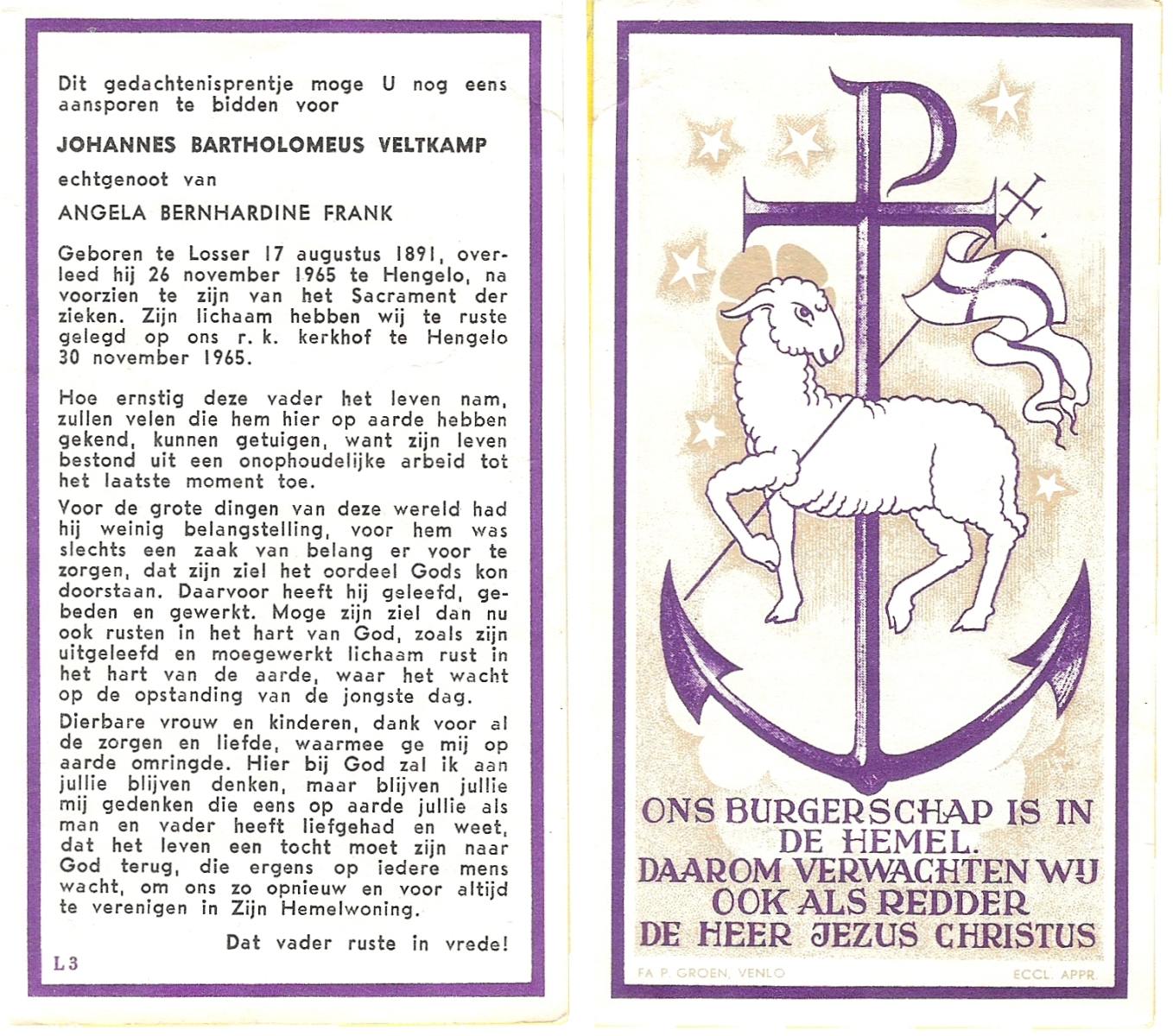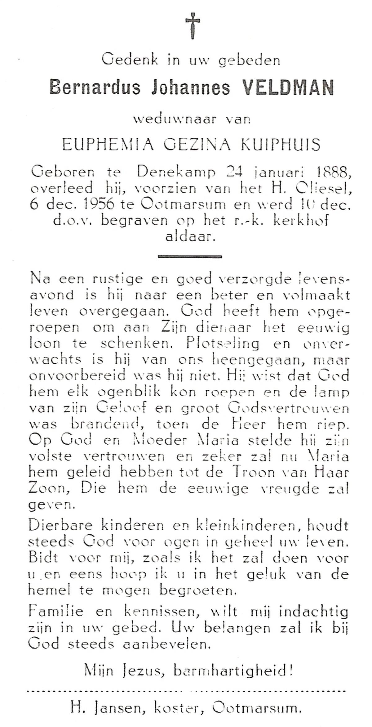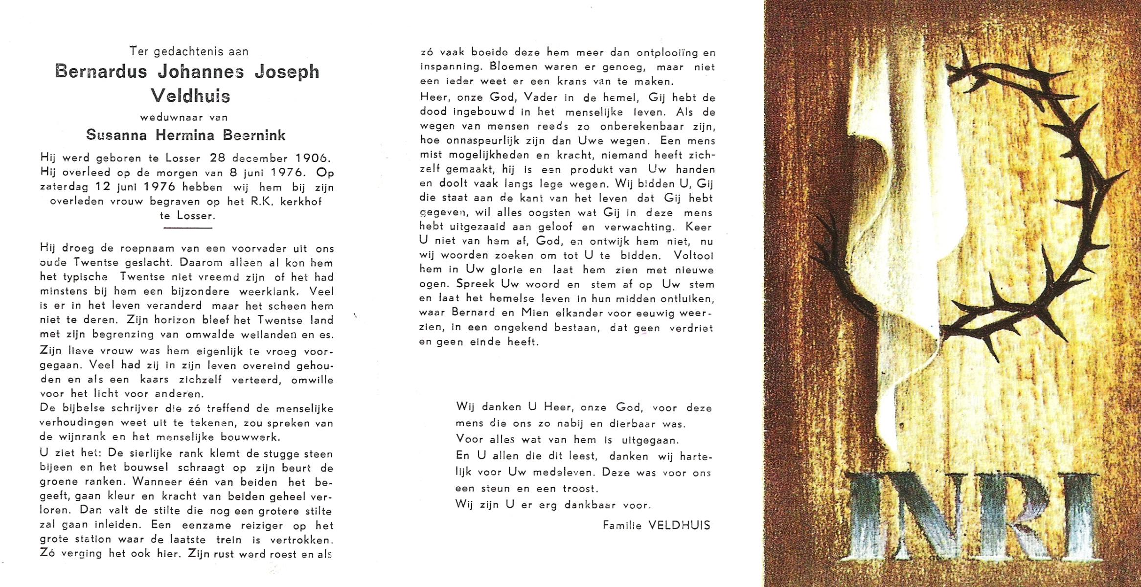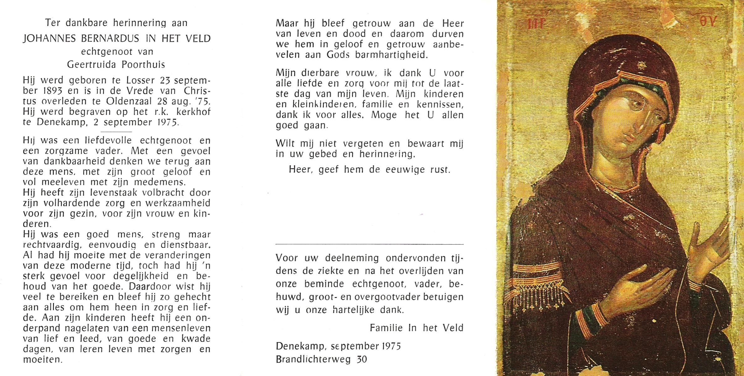 VELD, in het, Johannes Bernardus, geboren op 23-09-1893 te Losser, overleden op 28-8-1975 te Oldenzaal op 81-jarige leeftijd, begraven op 2-9-1975 te Denekamp.