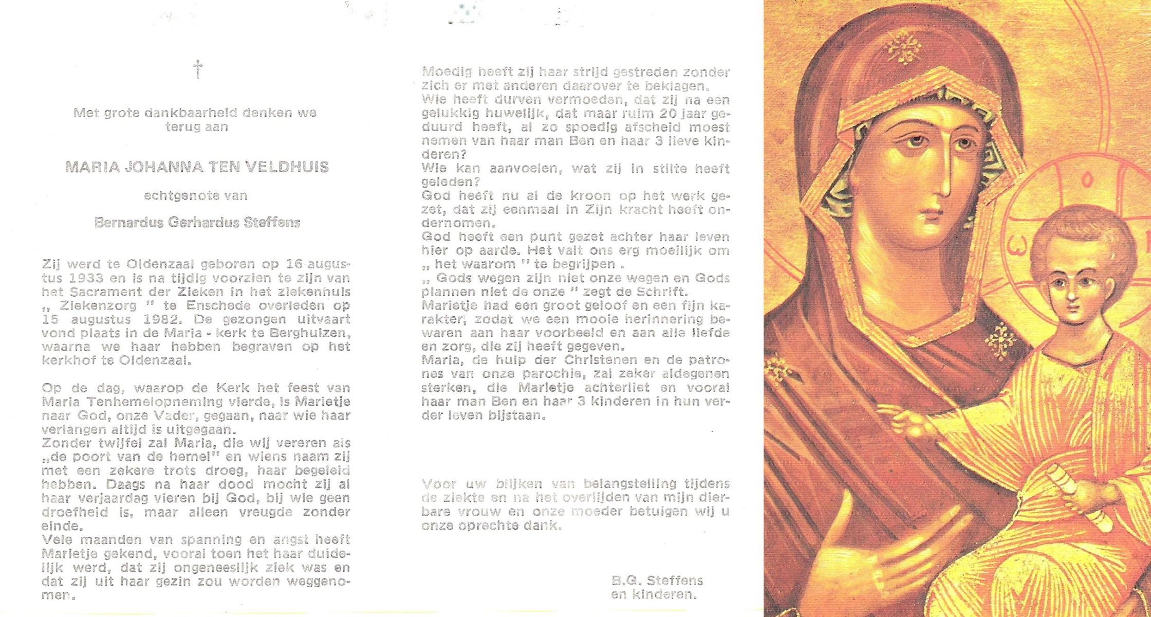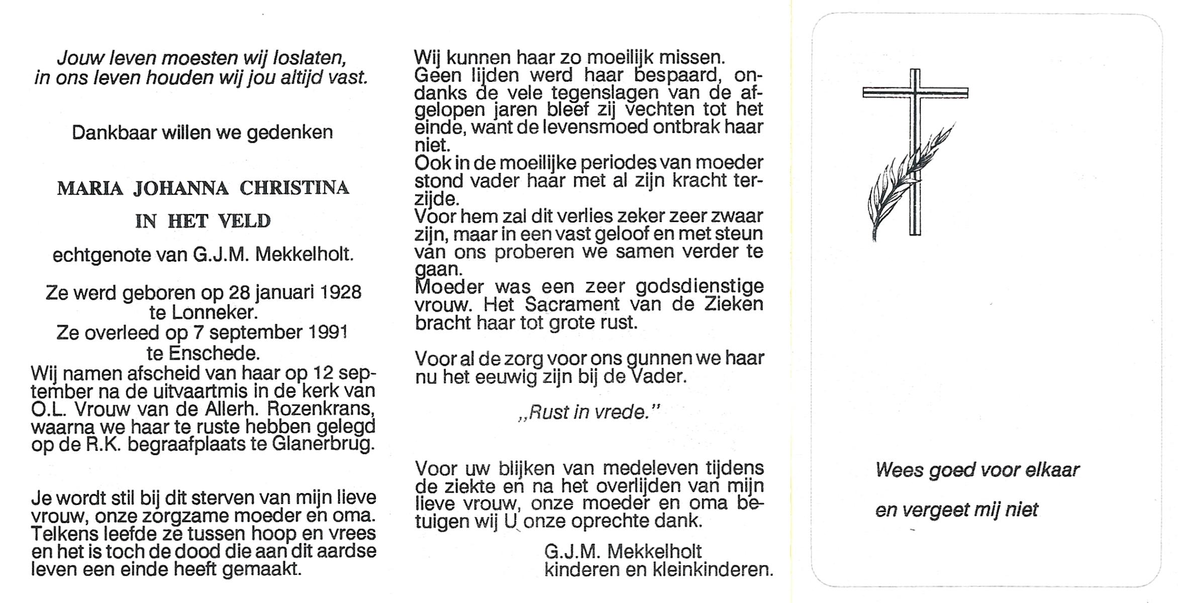 VELD, in het, Maria Johanna Christina, geboren op 28-1-1928 te Lonneker, overleden op 7-9-1991 te Enschede op 63-jarige leeftijd, begraven op 12-9-1991 te Glanerbrug.