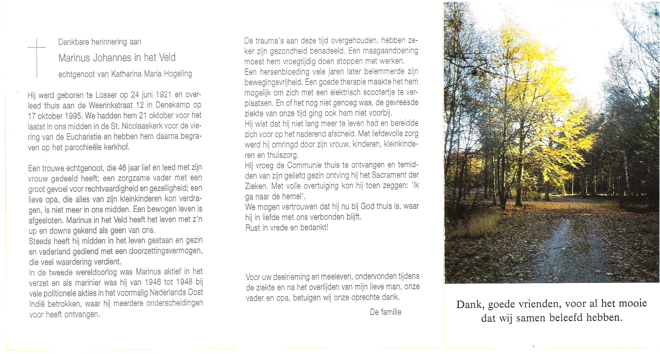 VELD, In het, Marinus Johannes, geboren op 24-6-1921 te Losser, overleden op 17-10-1995 te Denekamp op 74-jarige leeftijd, begraven op 21-10-1995 te Denekamp.