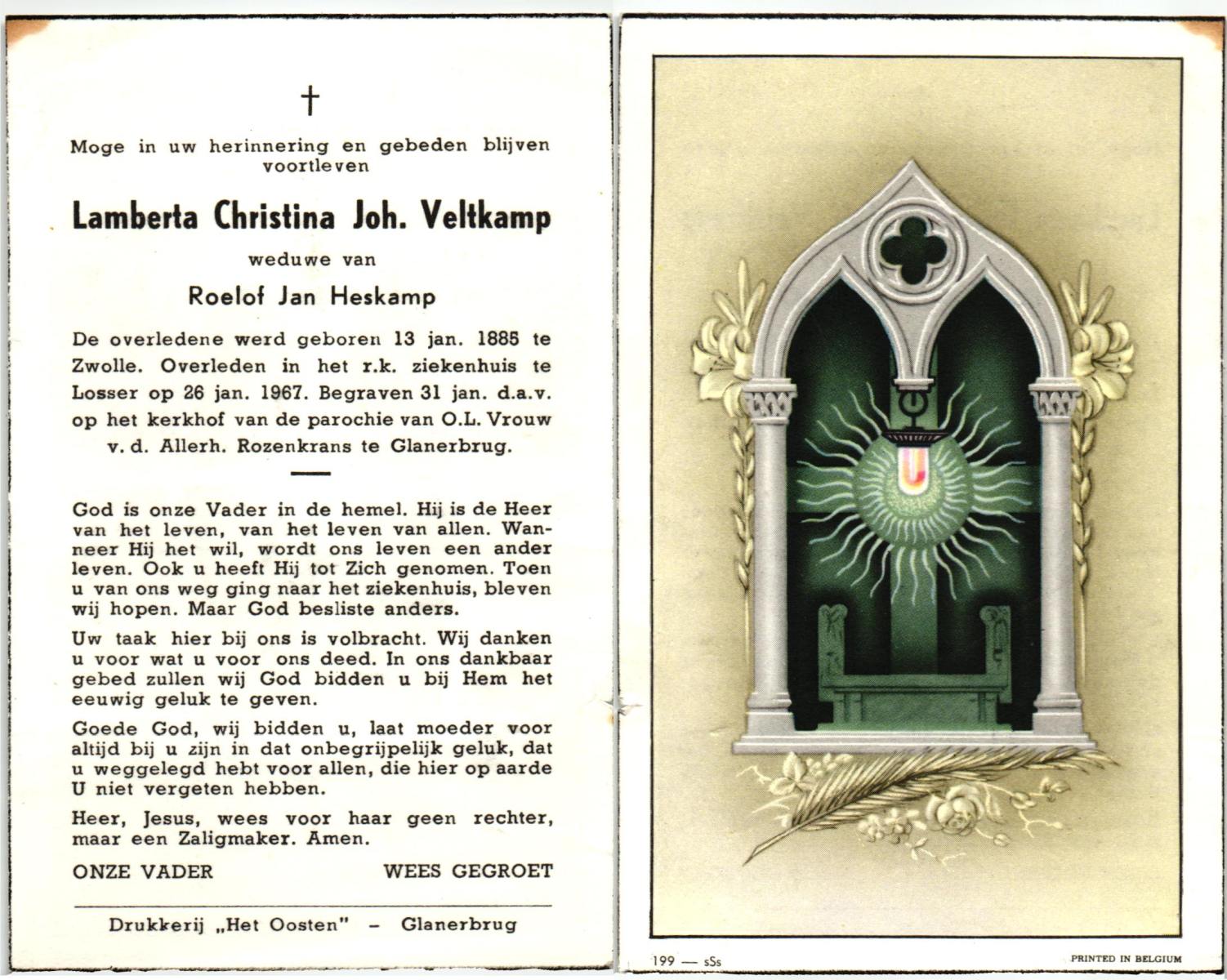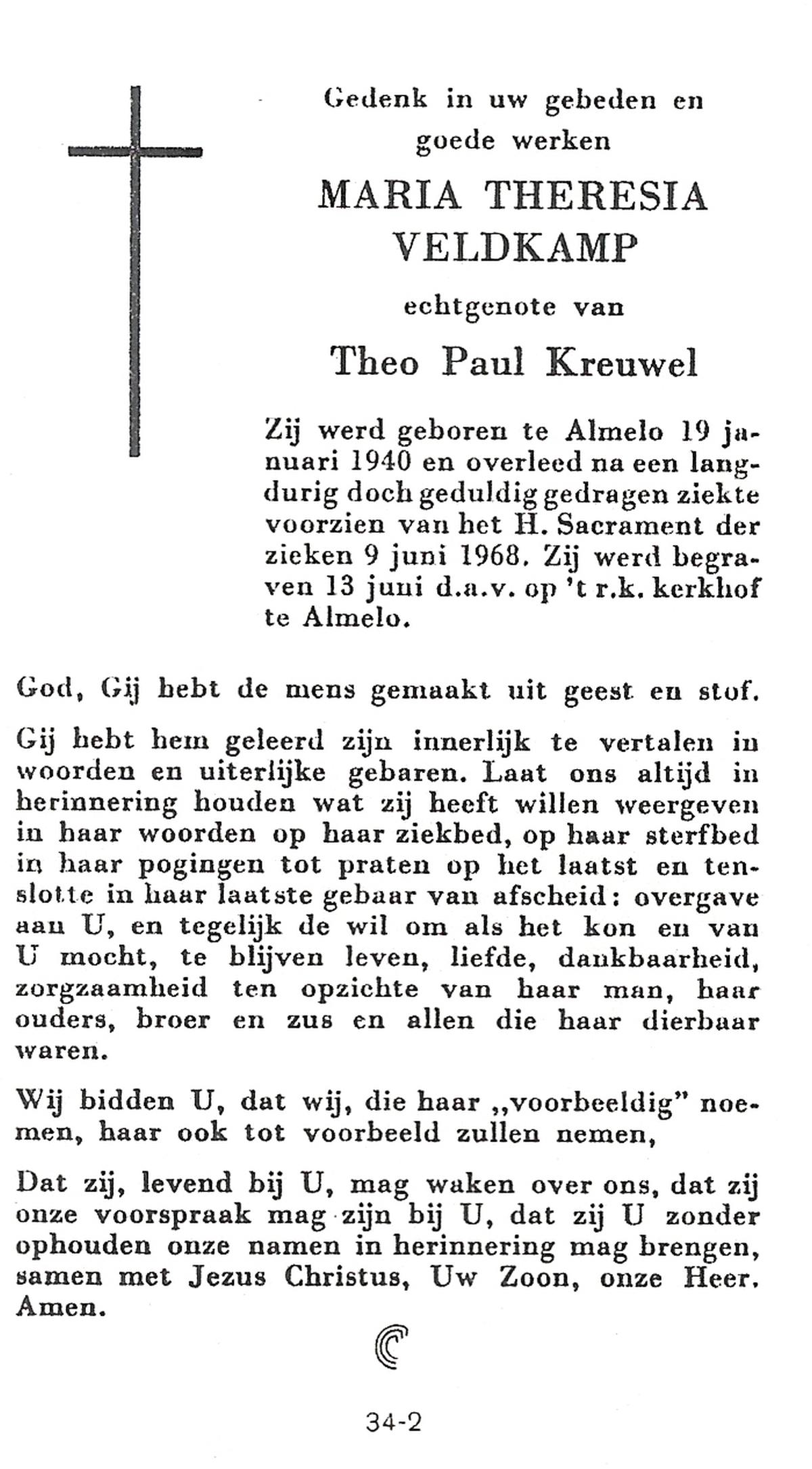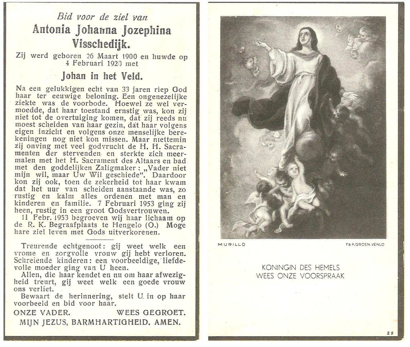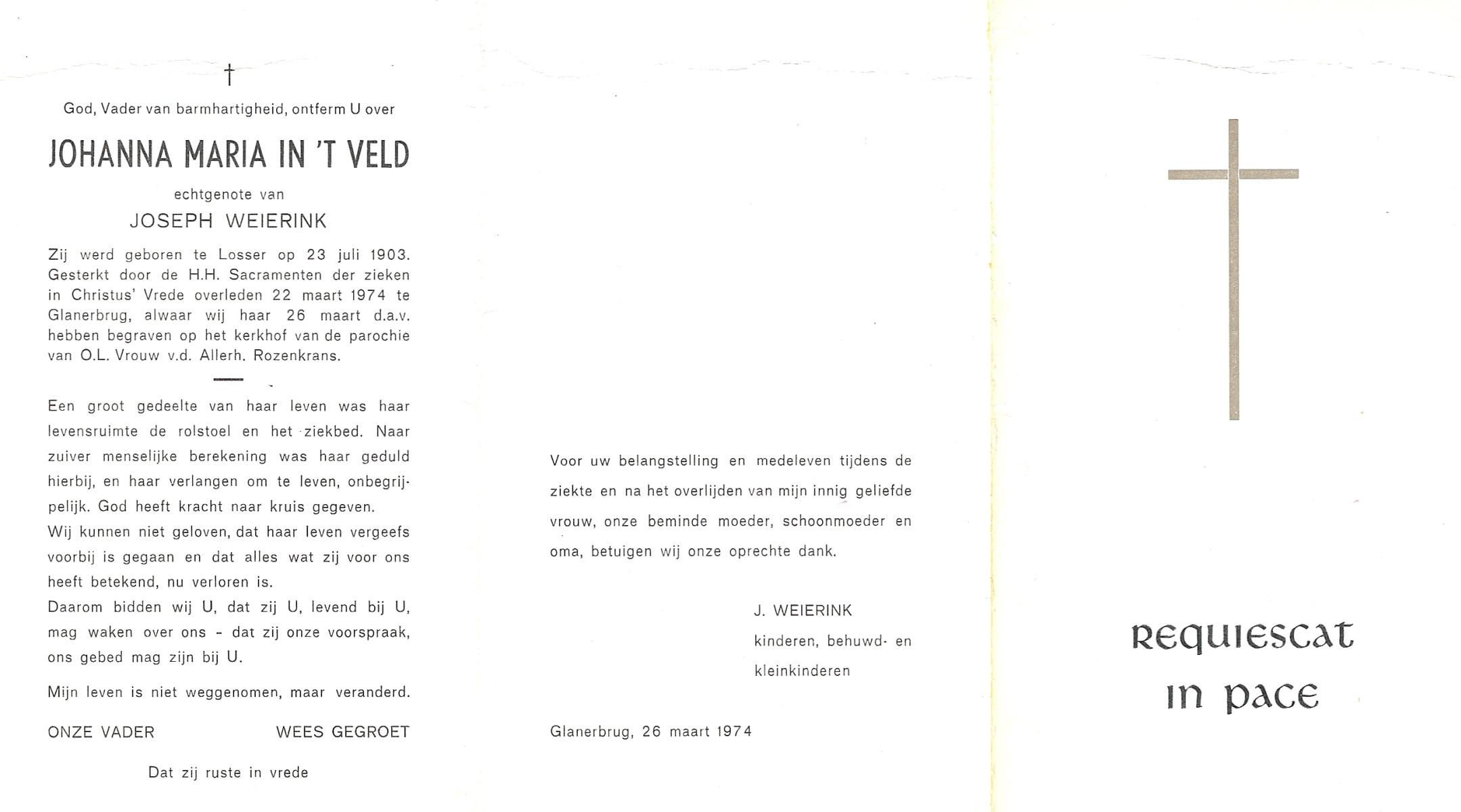 VELD, in 't, Johanna Maria, geboren op 23-7-1903 te Losser, overleden op 22-3-1974 te Glanerbrug op 70-jarige leeftijd, begraven op 26-3-1974 te Glanerbrug.