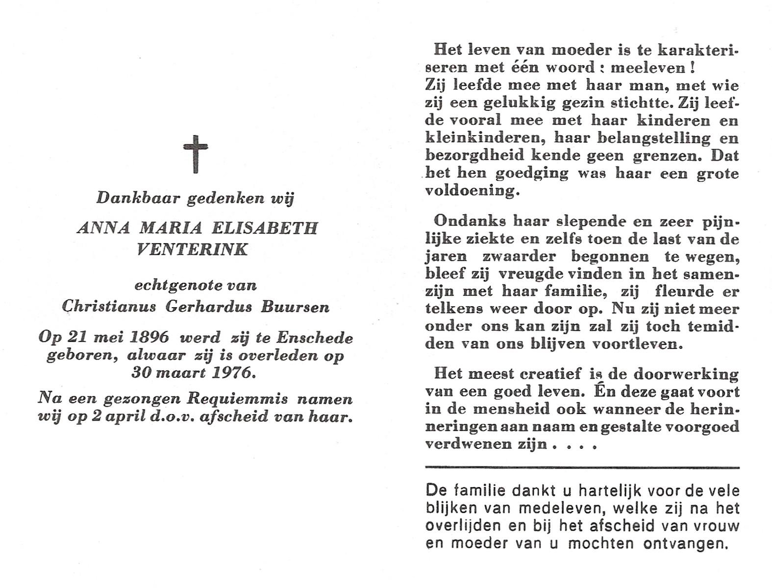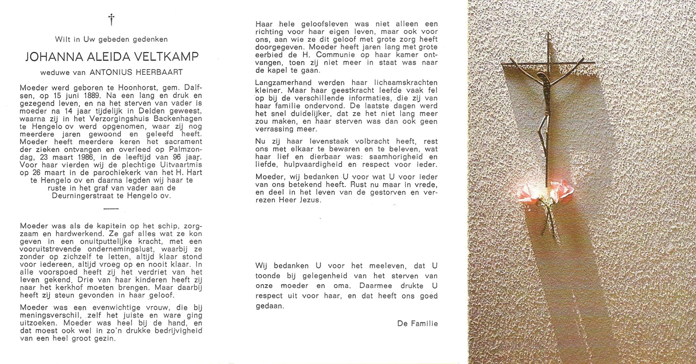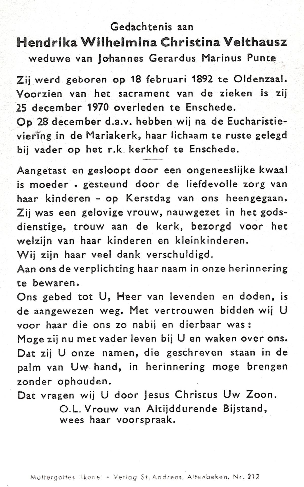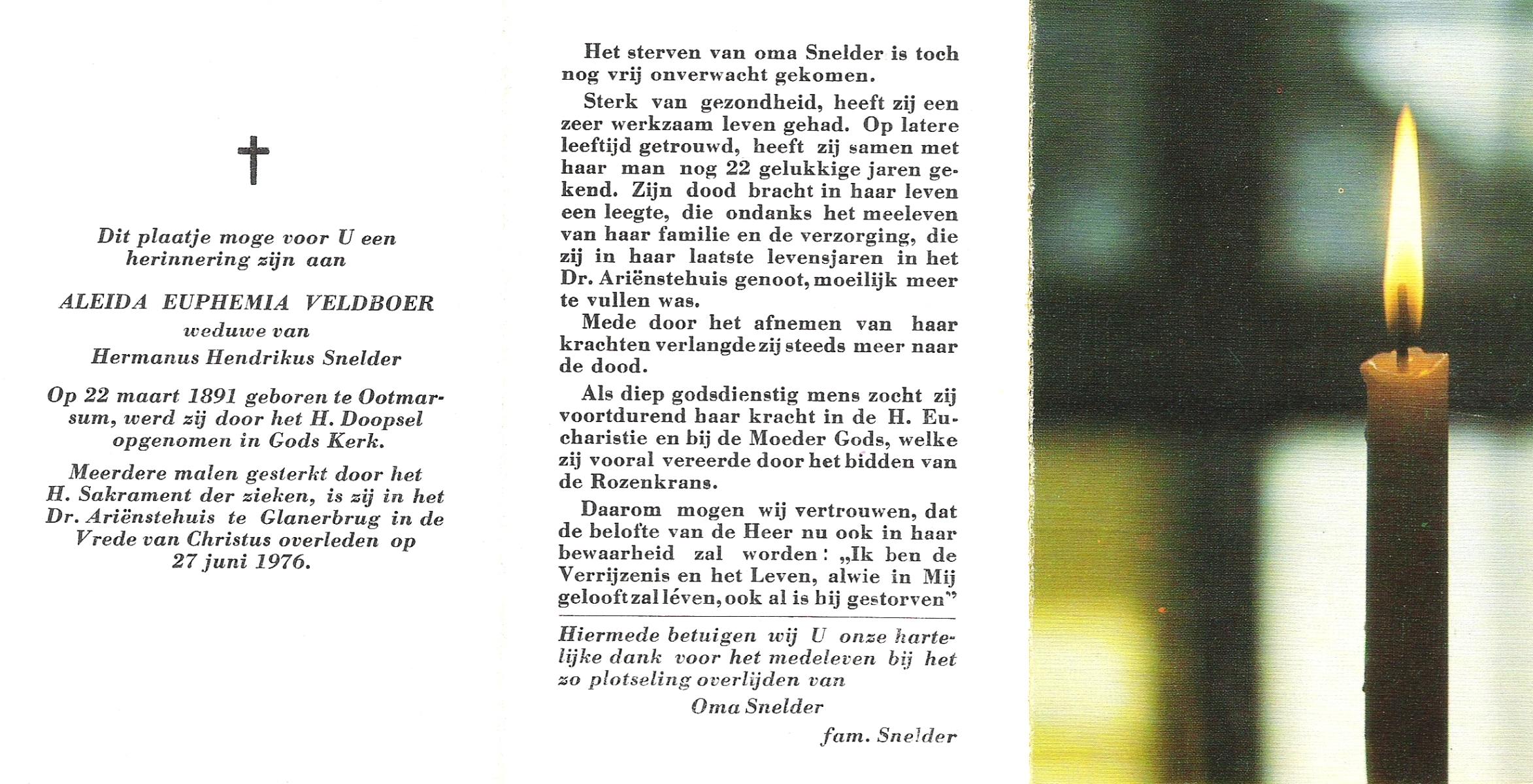 VELDBOER, Aleida Euphemia, geboren op 22-03-1891 te Ootmarsum, overleden op 27-6-1976 te Glanerbrug op 85-jarige leeftijd.
