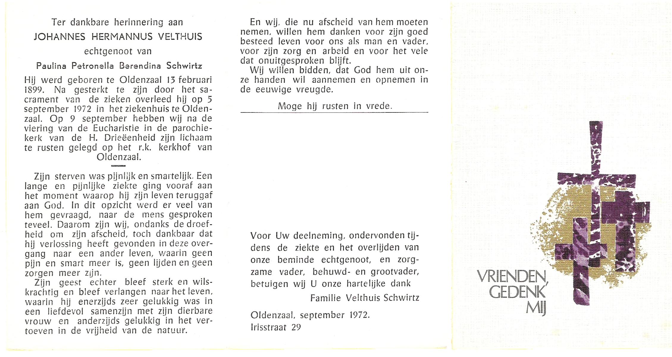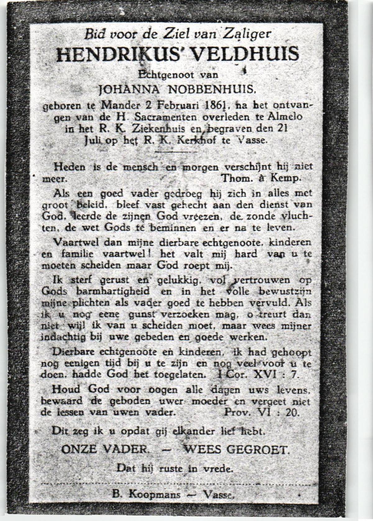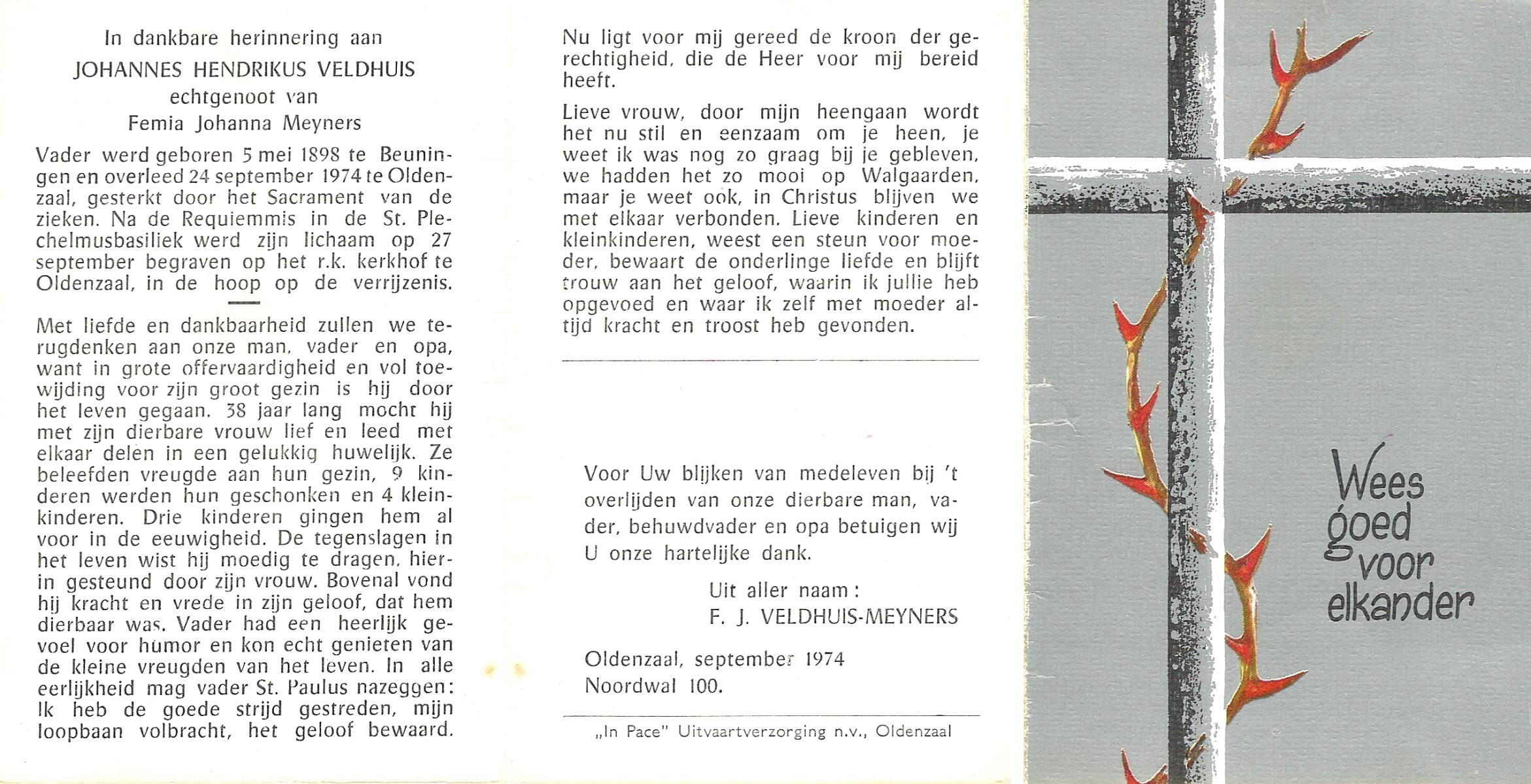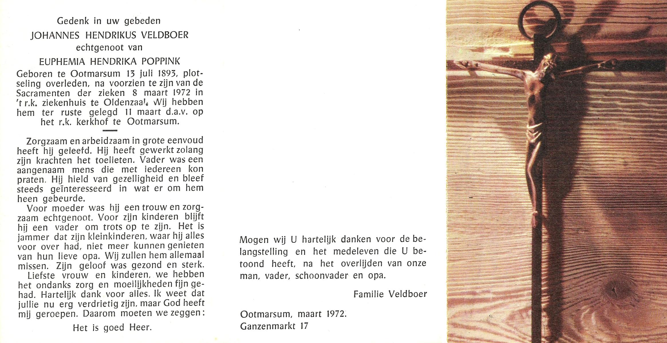 VELDBOER, Johannes Hendrikus, geboren op 13-07-1893 te Ootmarsum, overleden op 8-3-1972 te Oldenzaal op 78-jarige leeftijd, begraven op 11-3-1972 te Ootmarsum.