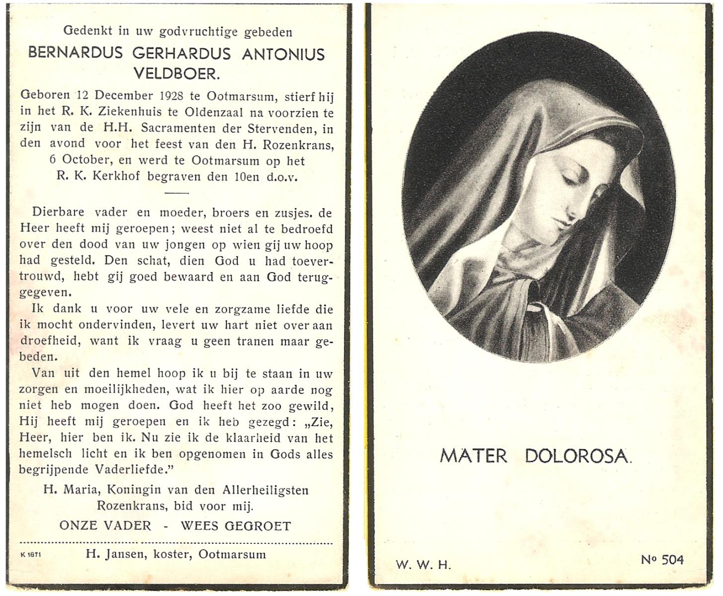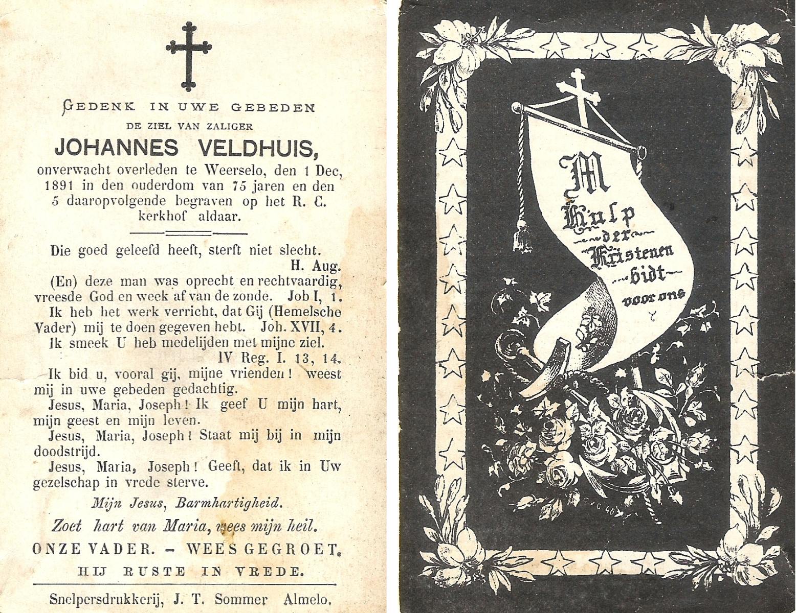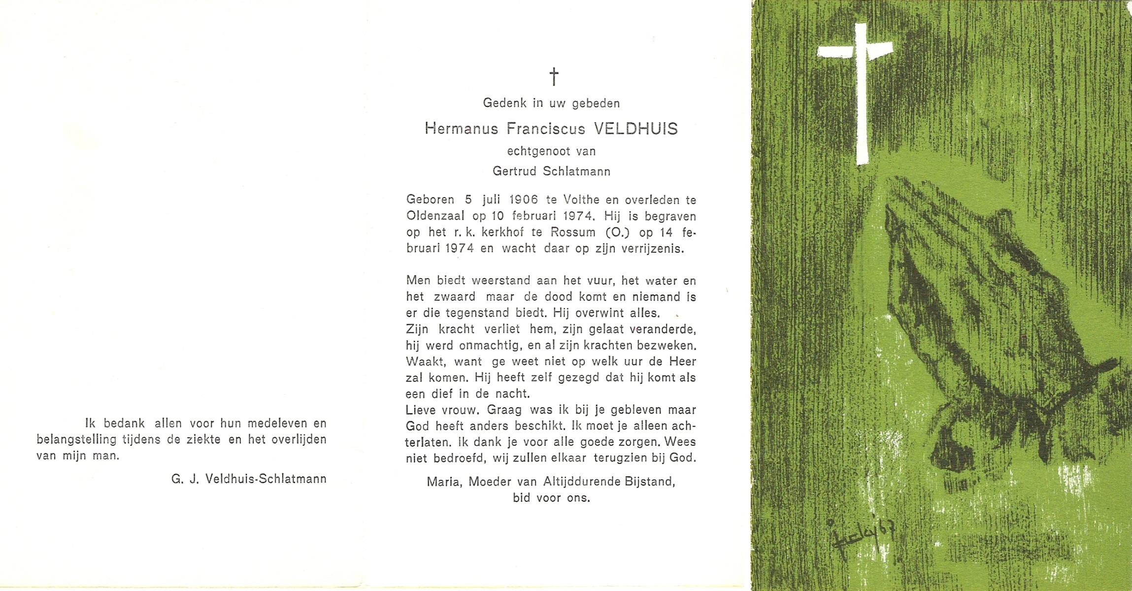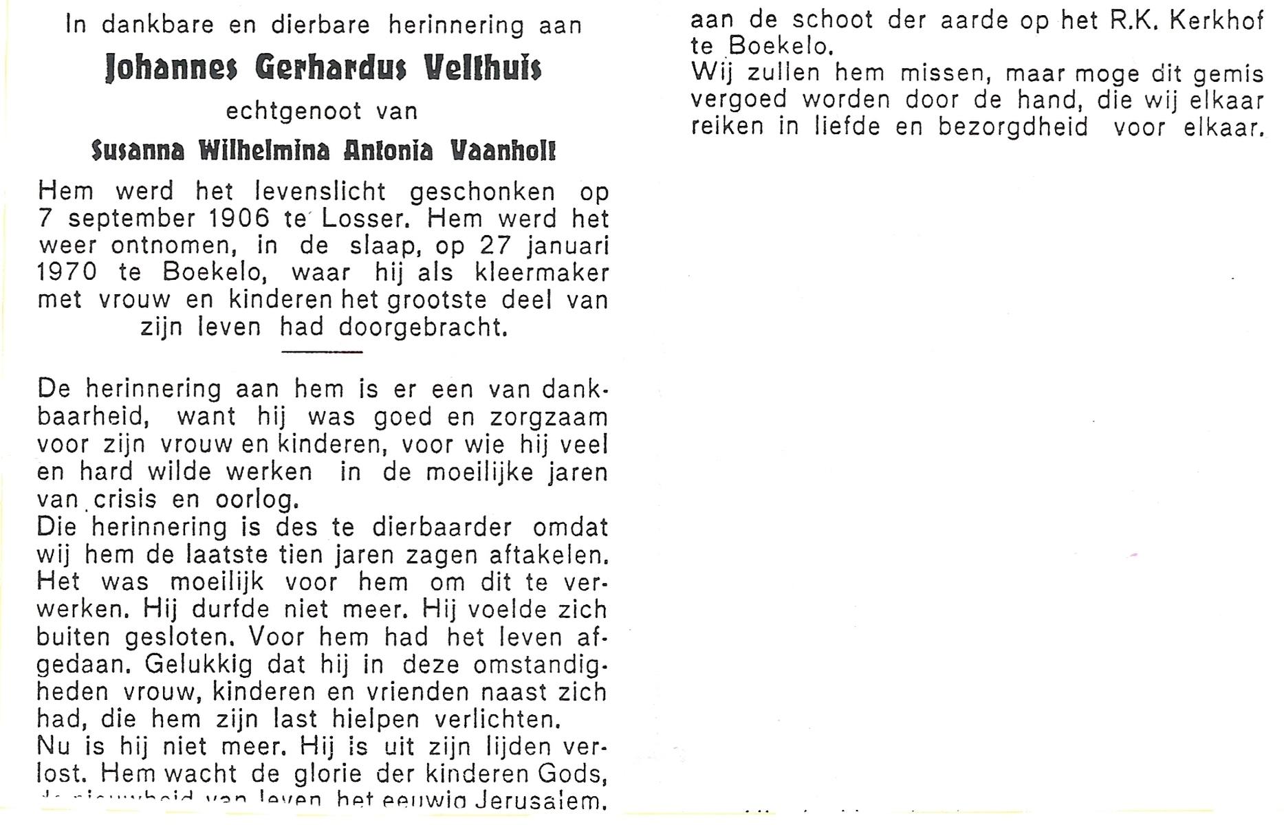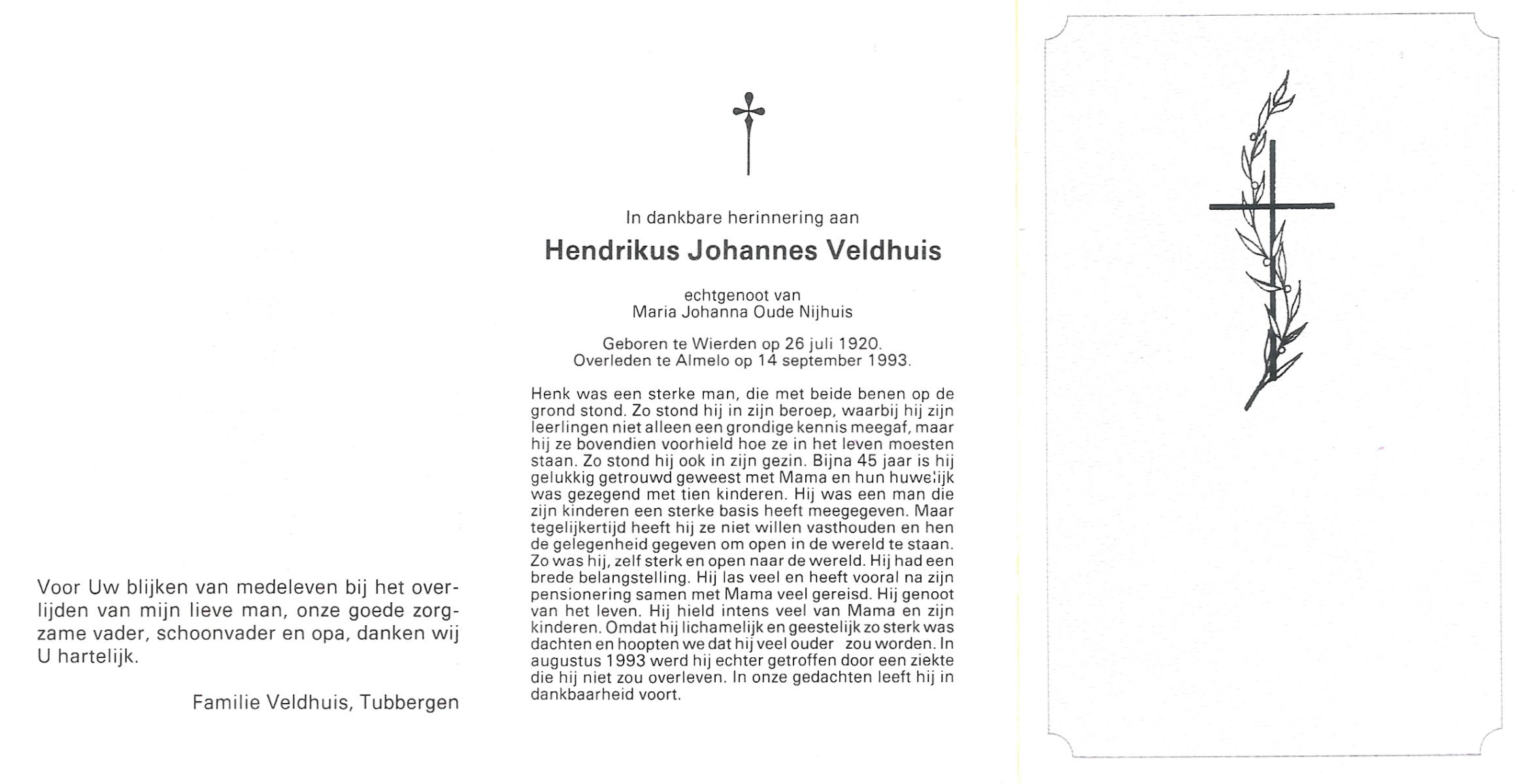 VELDBOER, Johannes Hendrikus, geboren op 13-07-1893 te Ootmarsum, overleden op 8-3-1972 te Oldenzaal op 78-jarige leeftijd, begraven op 11-3-1972 te Ootmarsum.