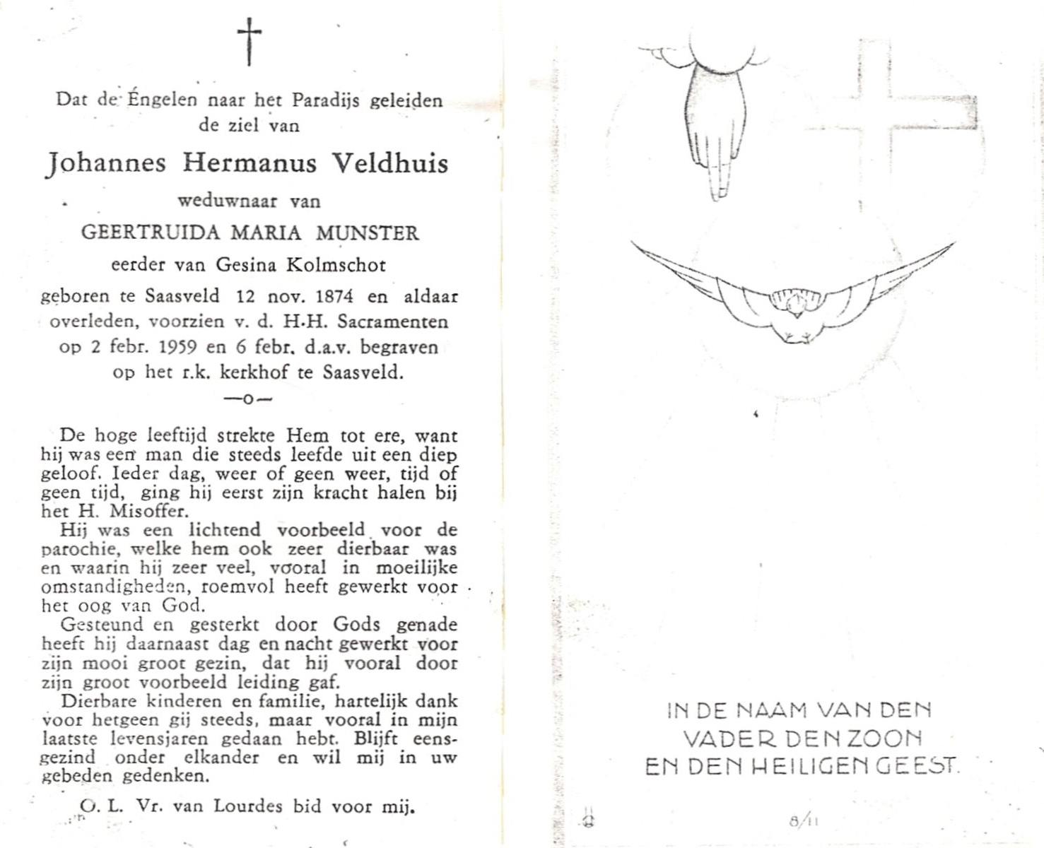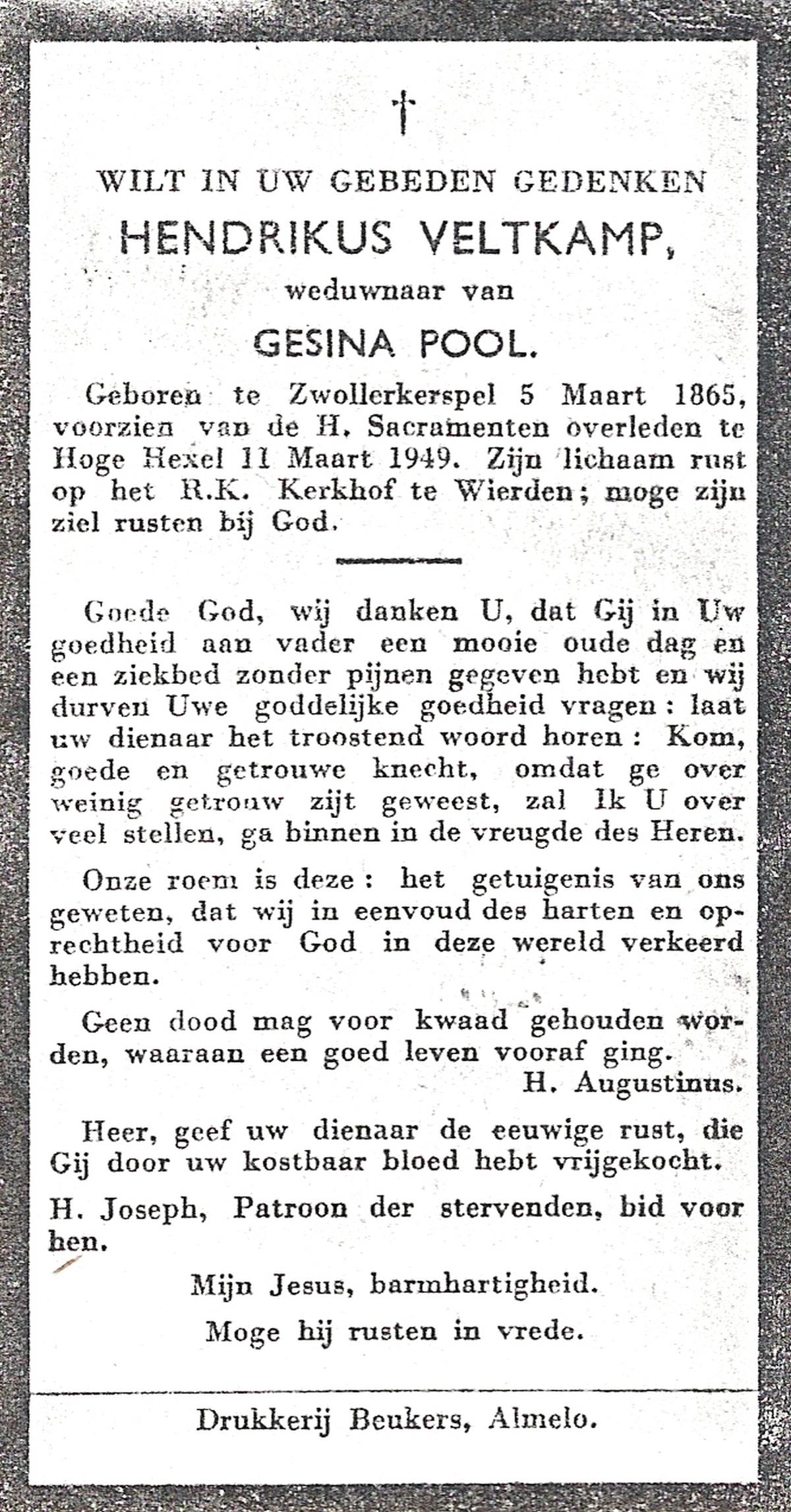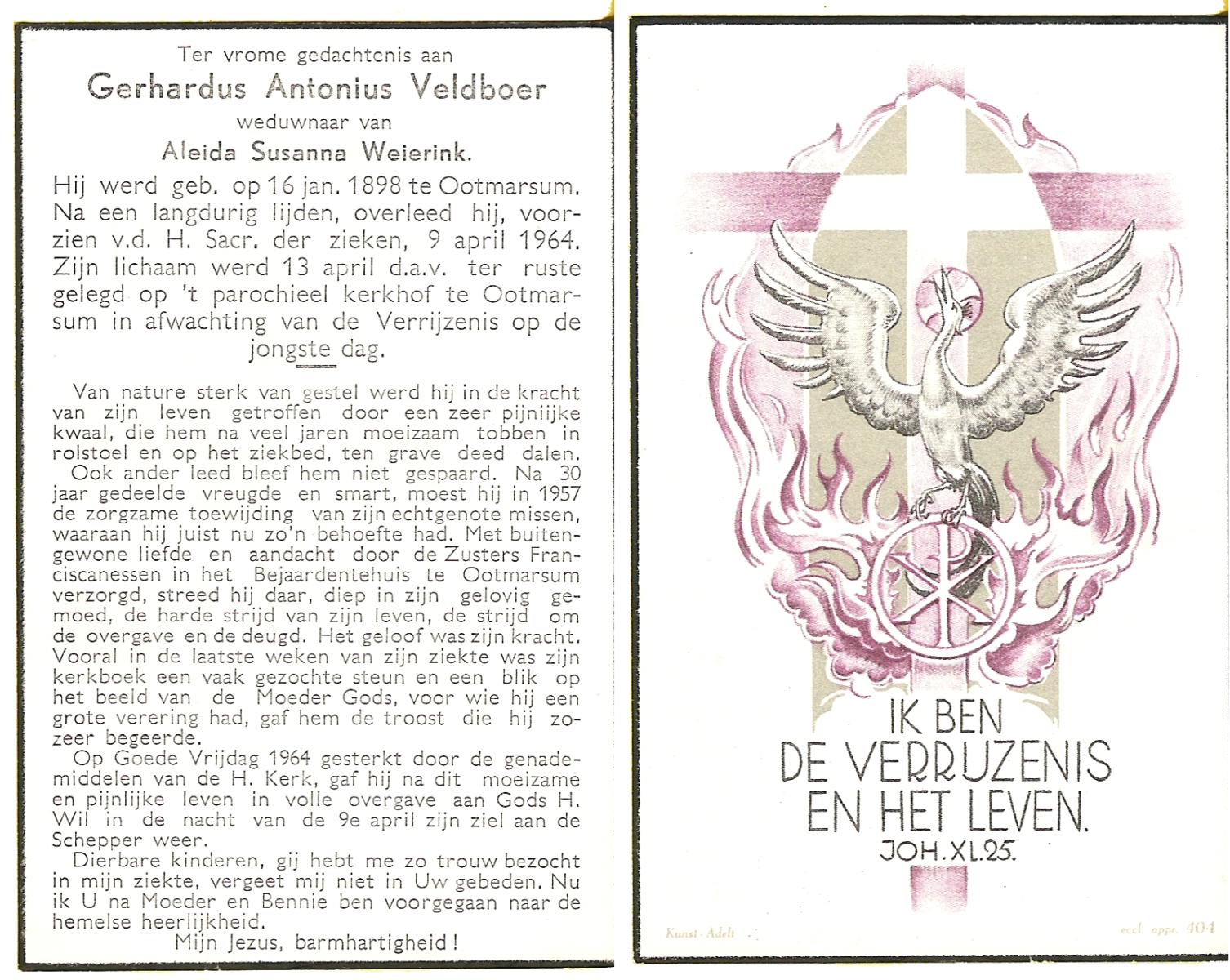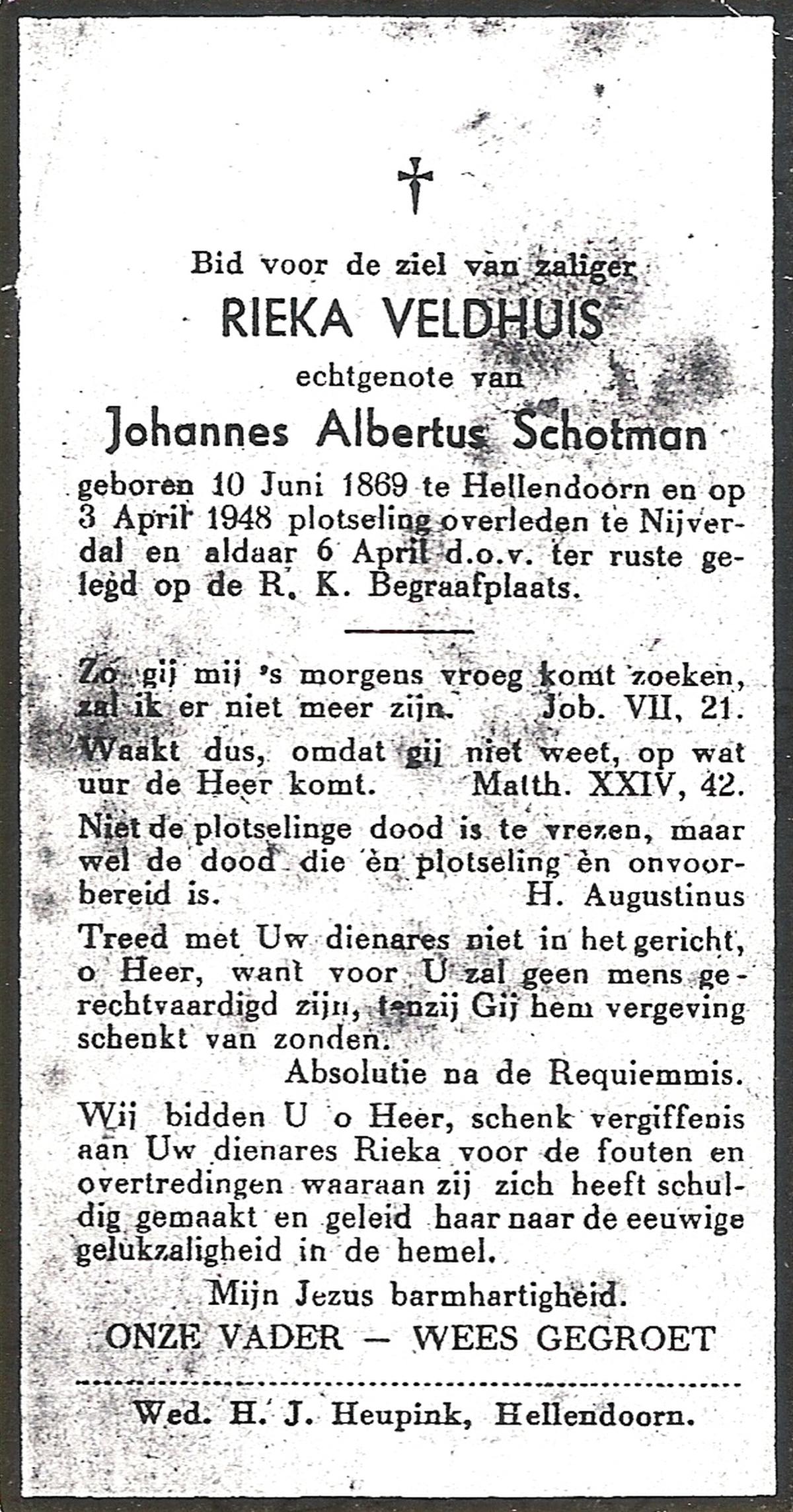 VELDBOER, Johannes Hendrikus, geboren op 13-07-1893 te Ootmarsum, overleden op 8-3-1972 te Oldenzaal op 78-jarige leeftijd, begraven op 11-3-1972 te Ootmarsum.