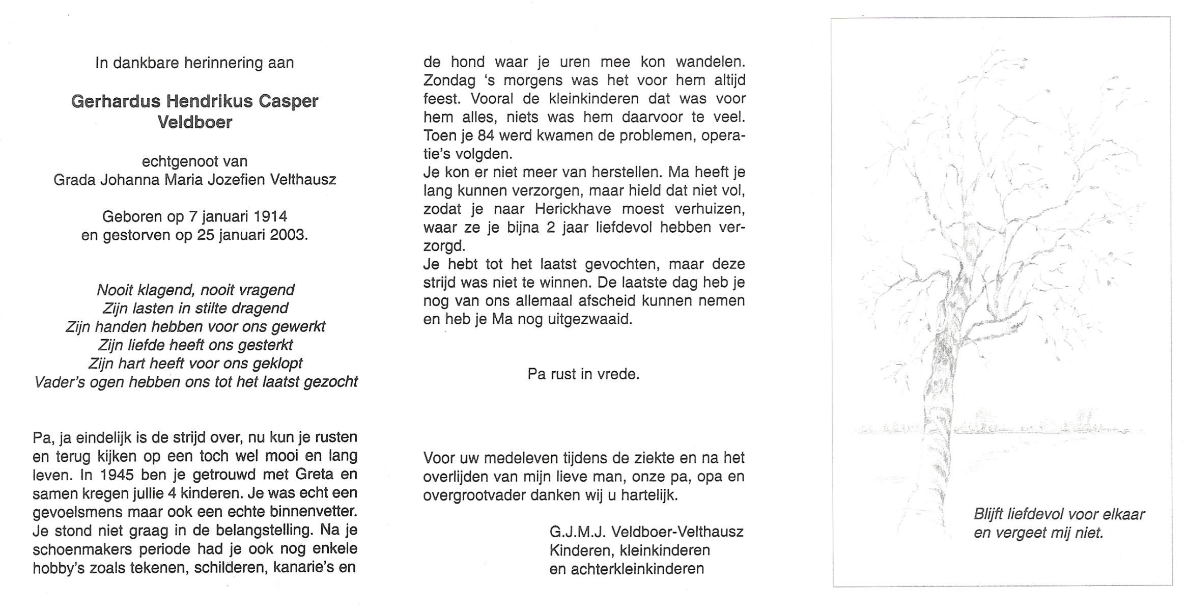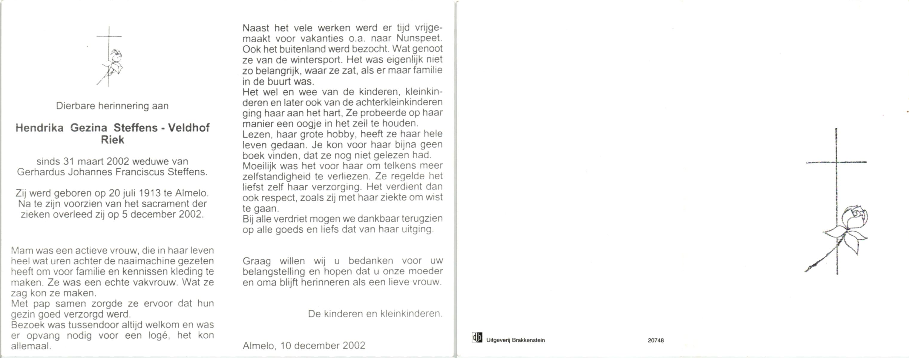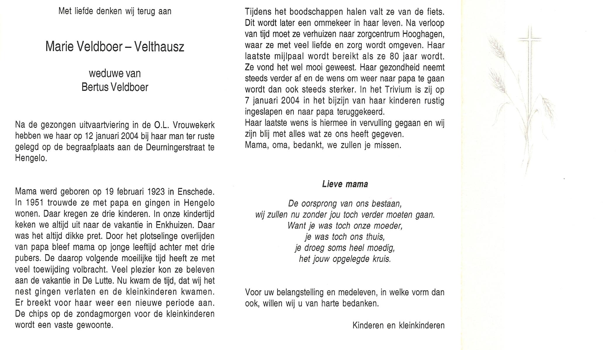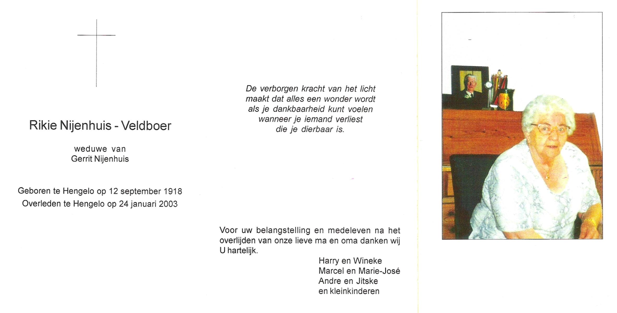 VELDBOER, Rikie, geboren op 12-9-1918 te Hengelo (O), overleden op 24-1-2003 te Hengelo (Ov.) op 84-jarige leeftijd.