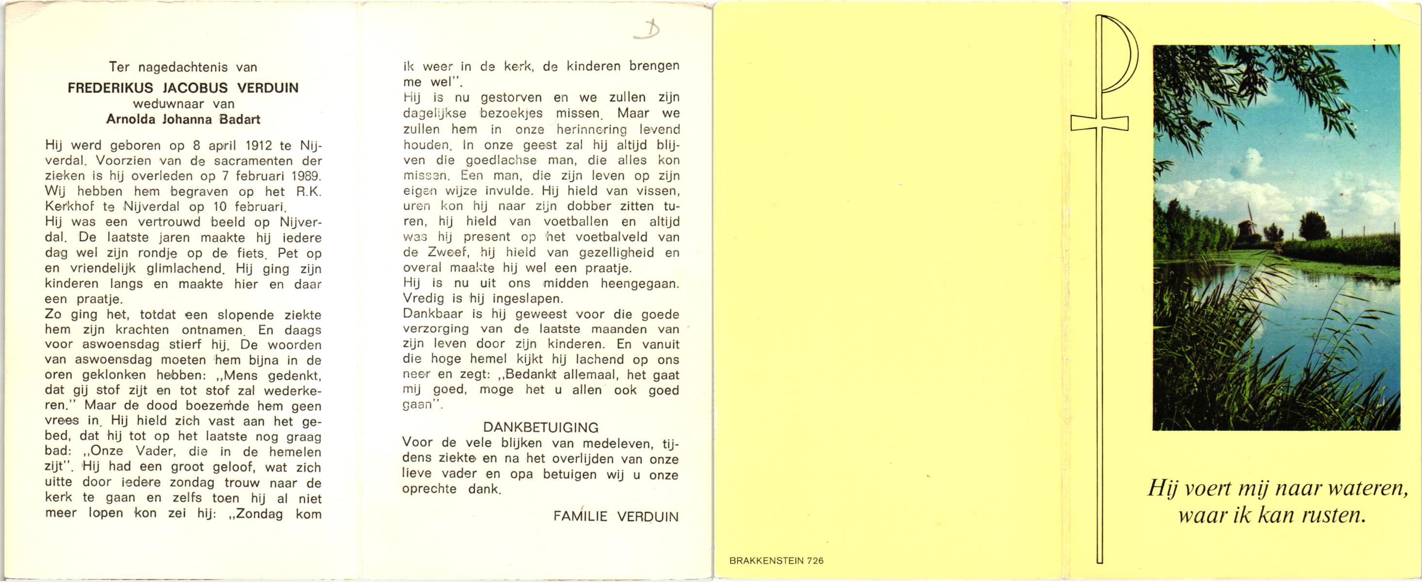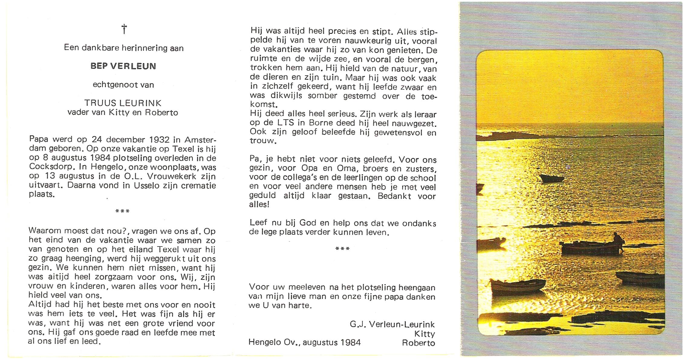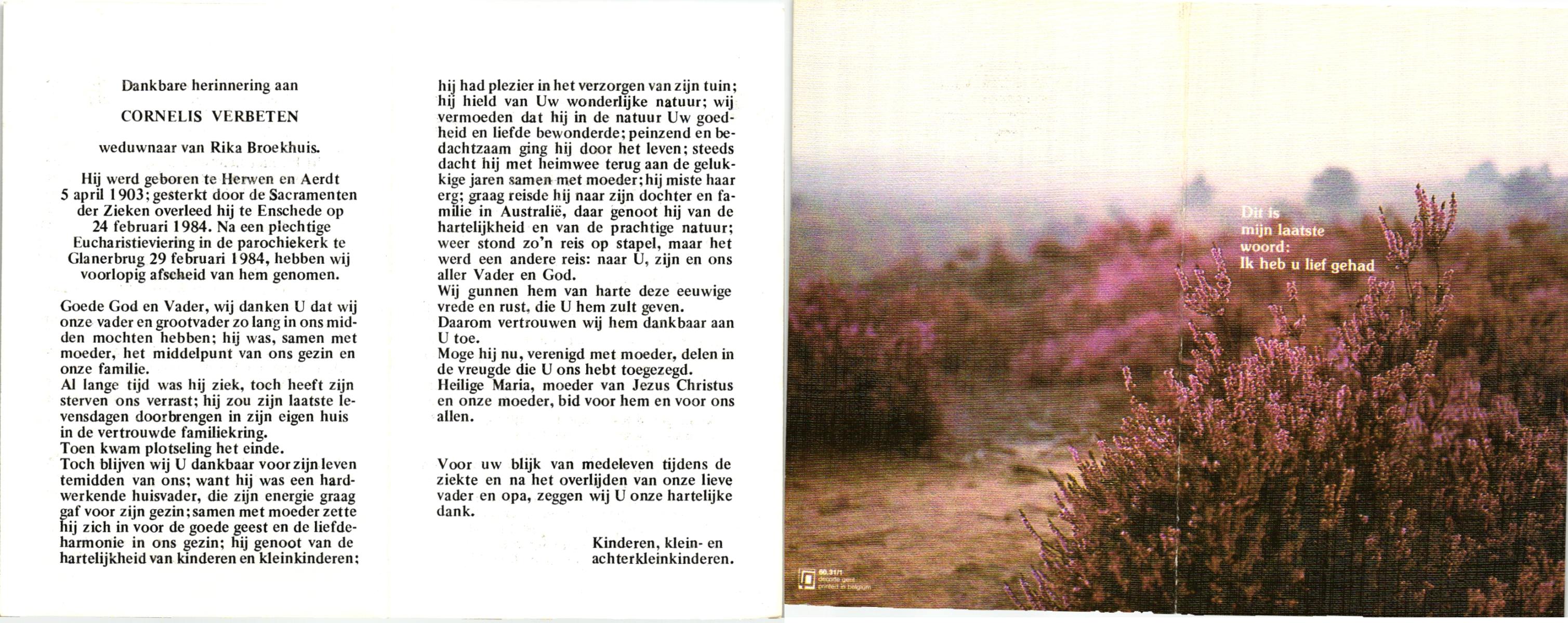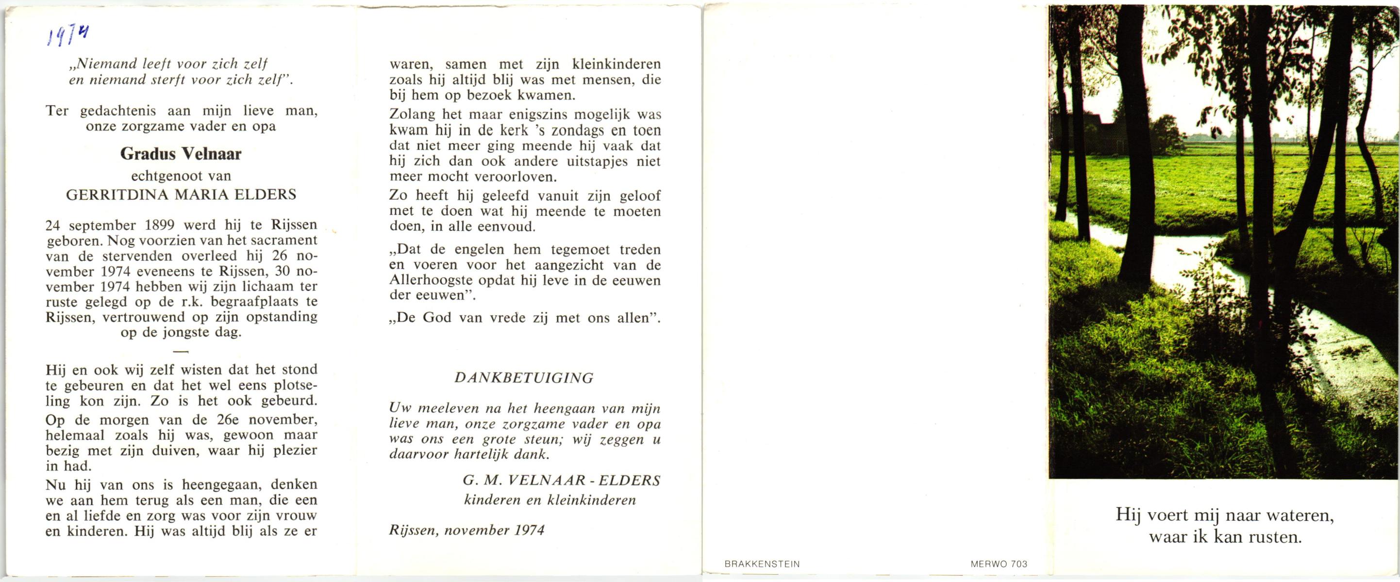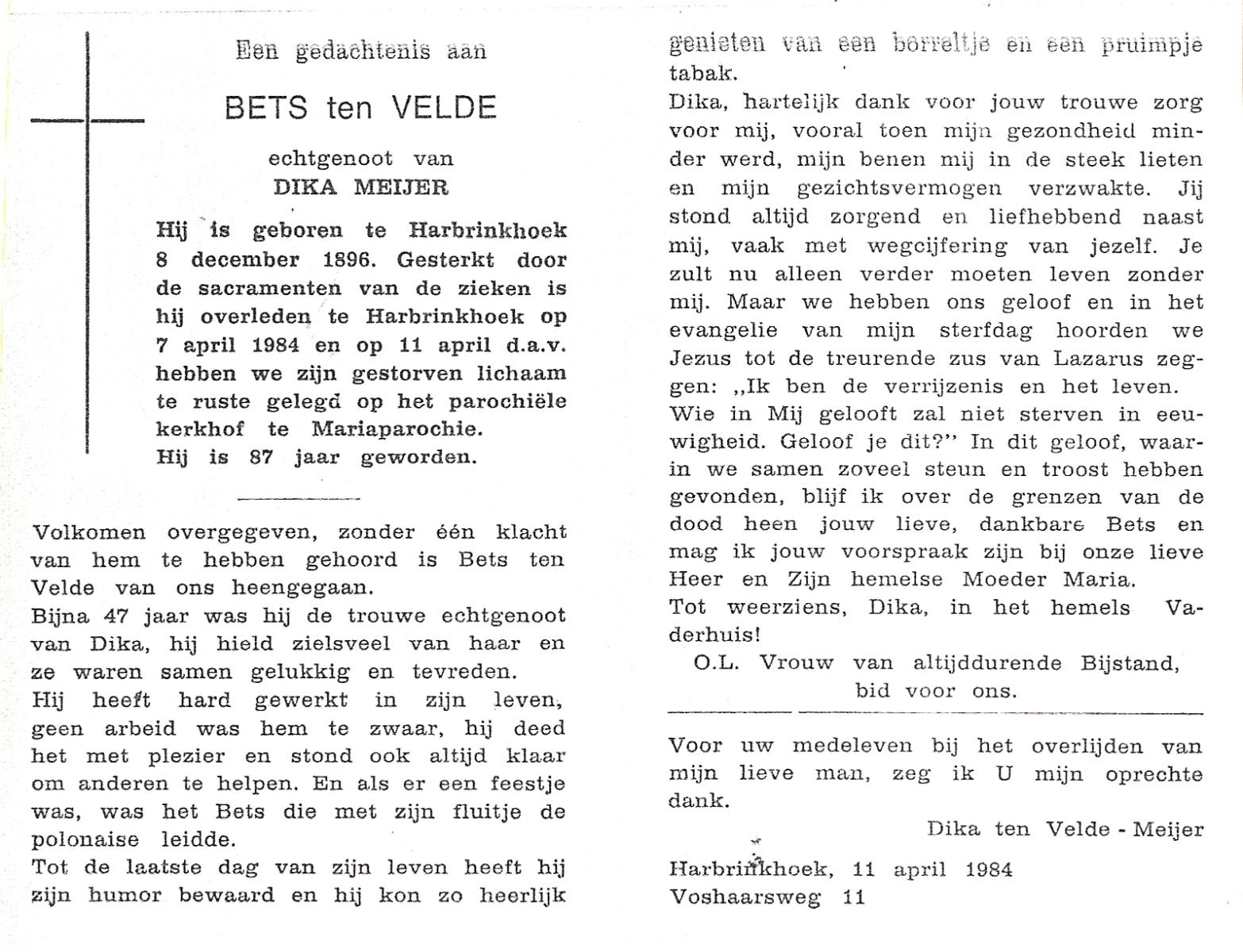 VELDE, ten, Bets, geboren op 08-12-1896 te Harbrinkhoek, overleden op 7-4-1984 te Harbrinkhoek op 87-jarige leeftijd, begraven op 11-4-1984 te Mariaparochie.