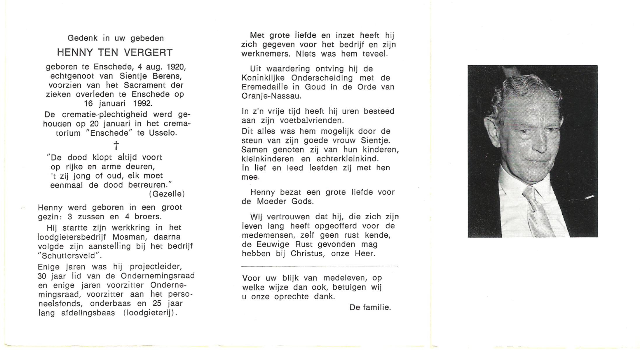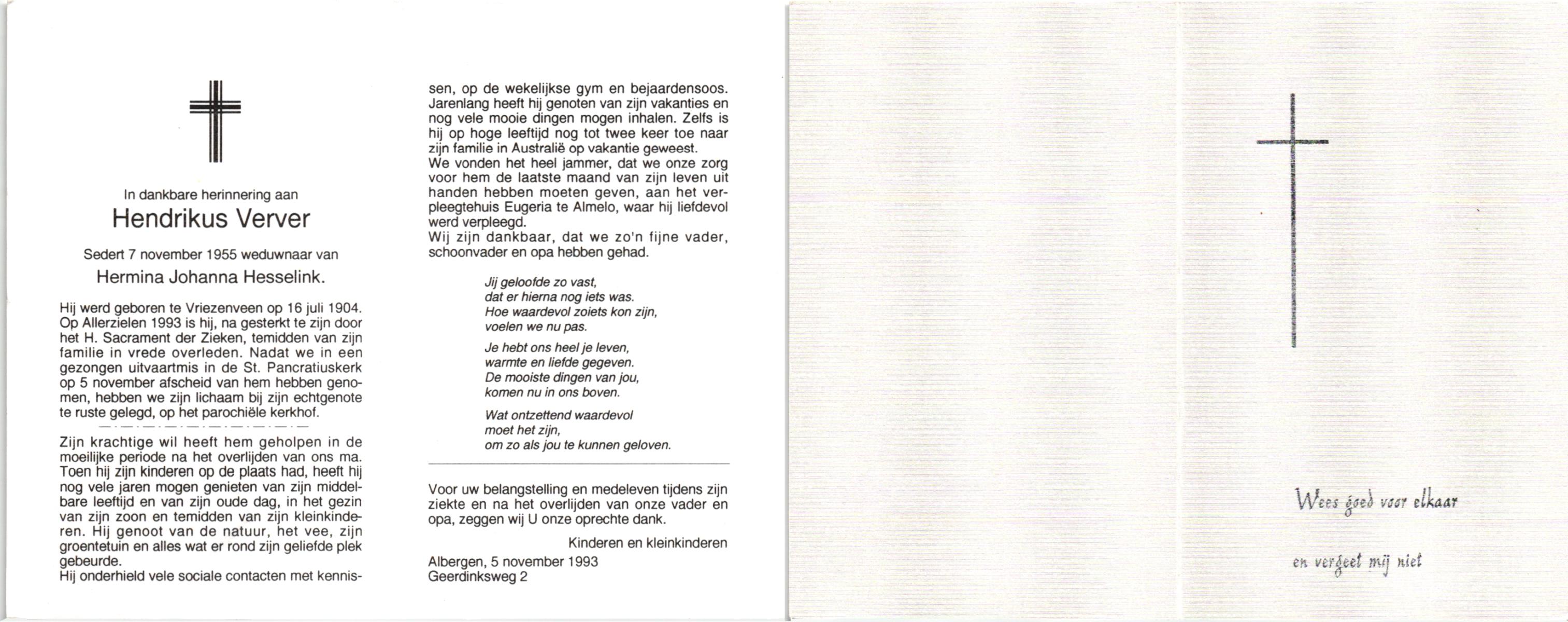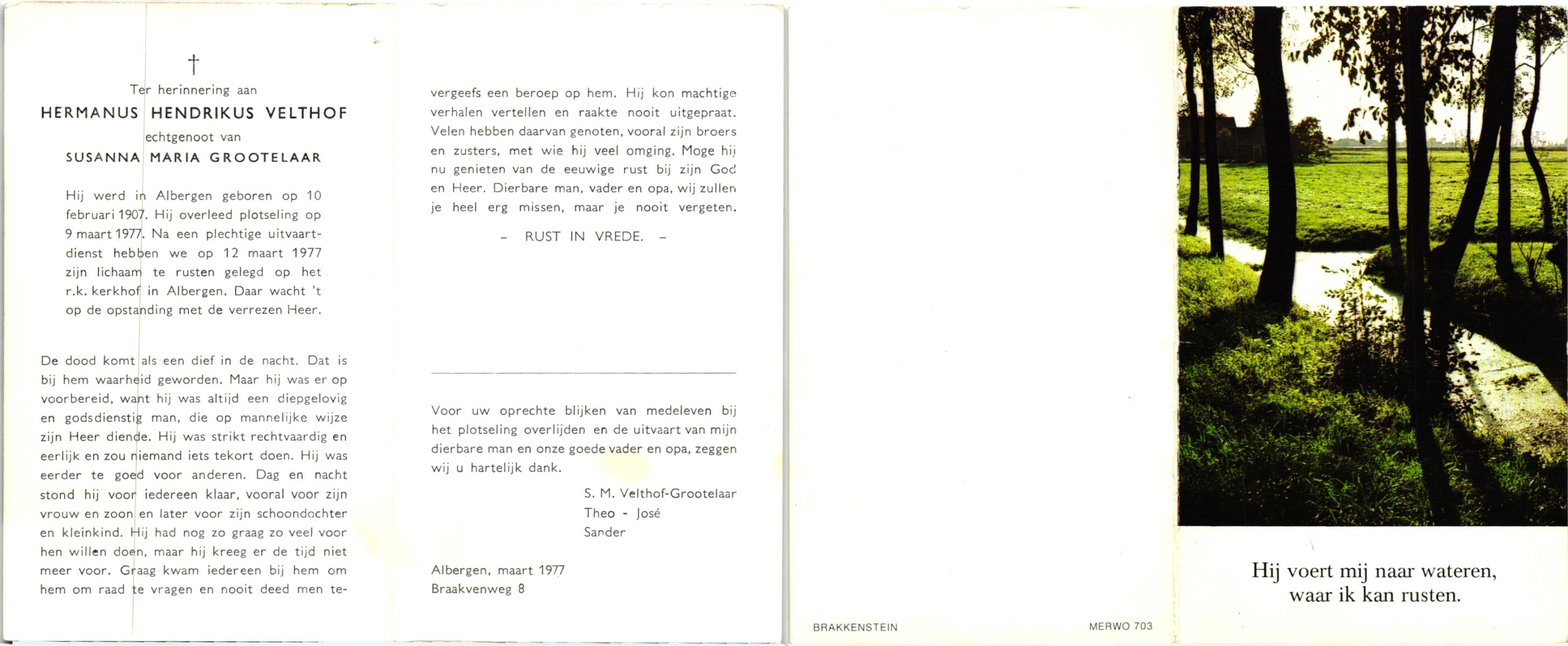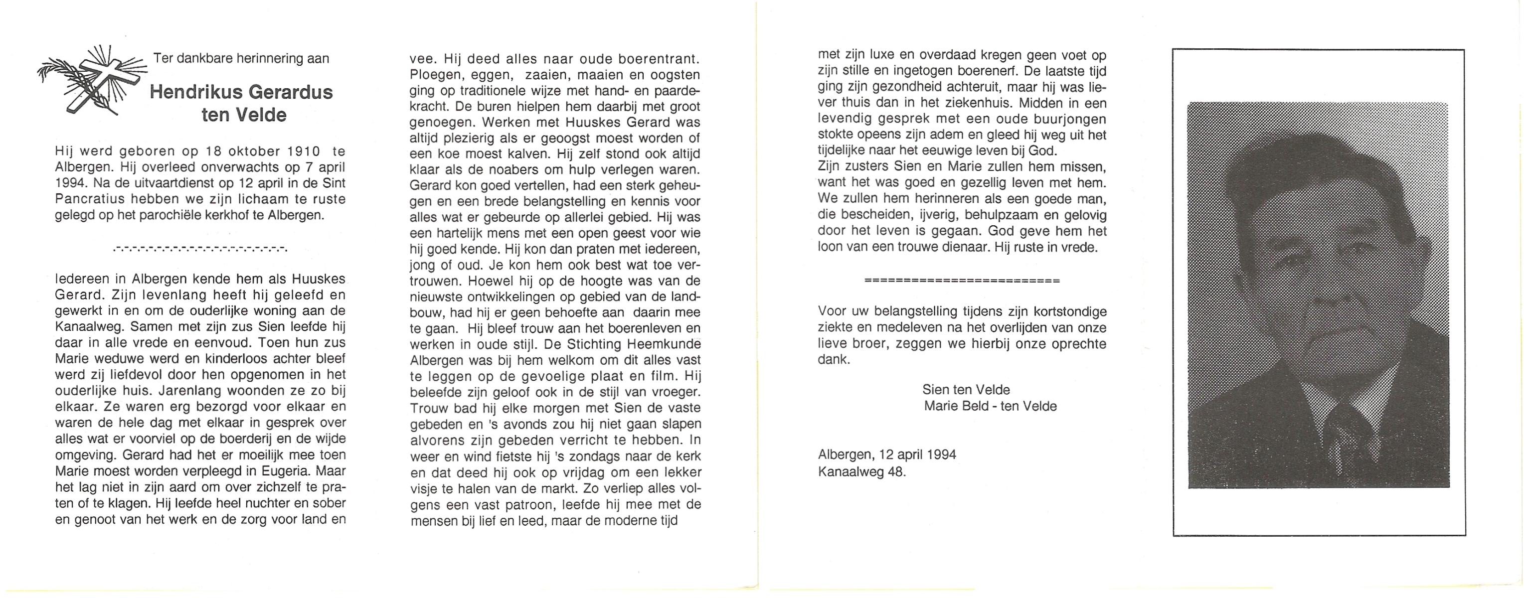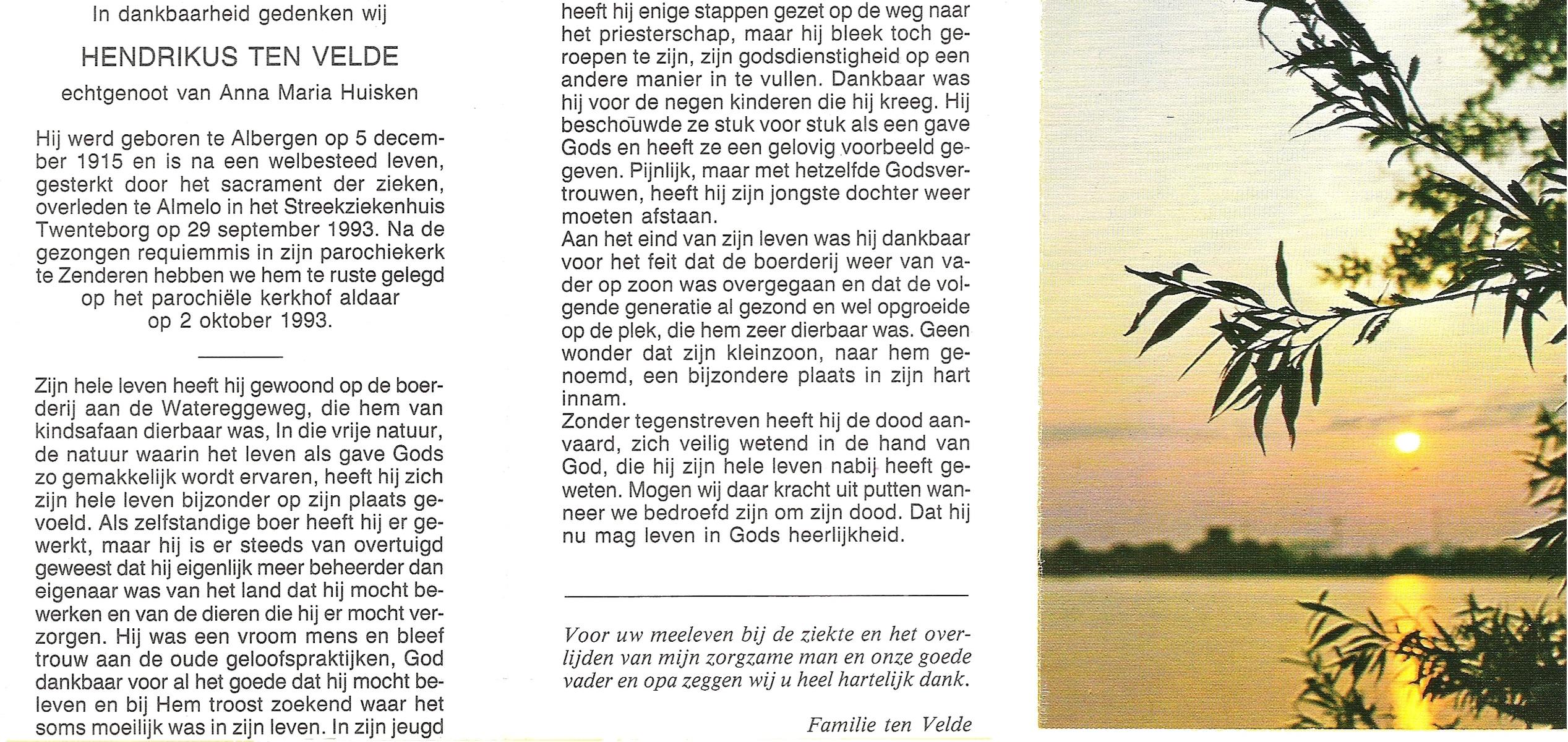 VELDE, ten, Hendrikus, geboren op 5-12-1915 te Albergen, overleden op 29-9-1993 te Almelo op 77-jarige leeftijd, begraven op 2-10-1993 te Zenderen.