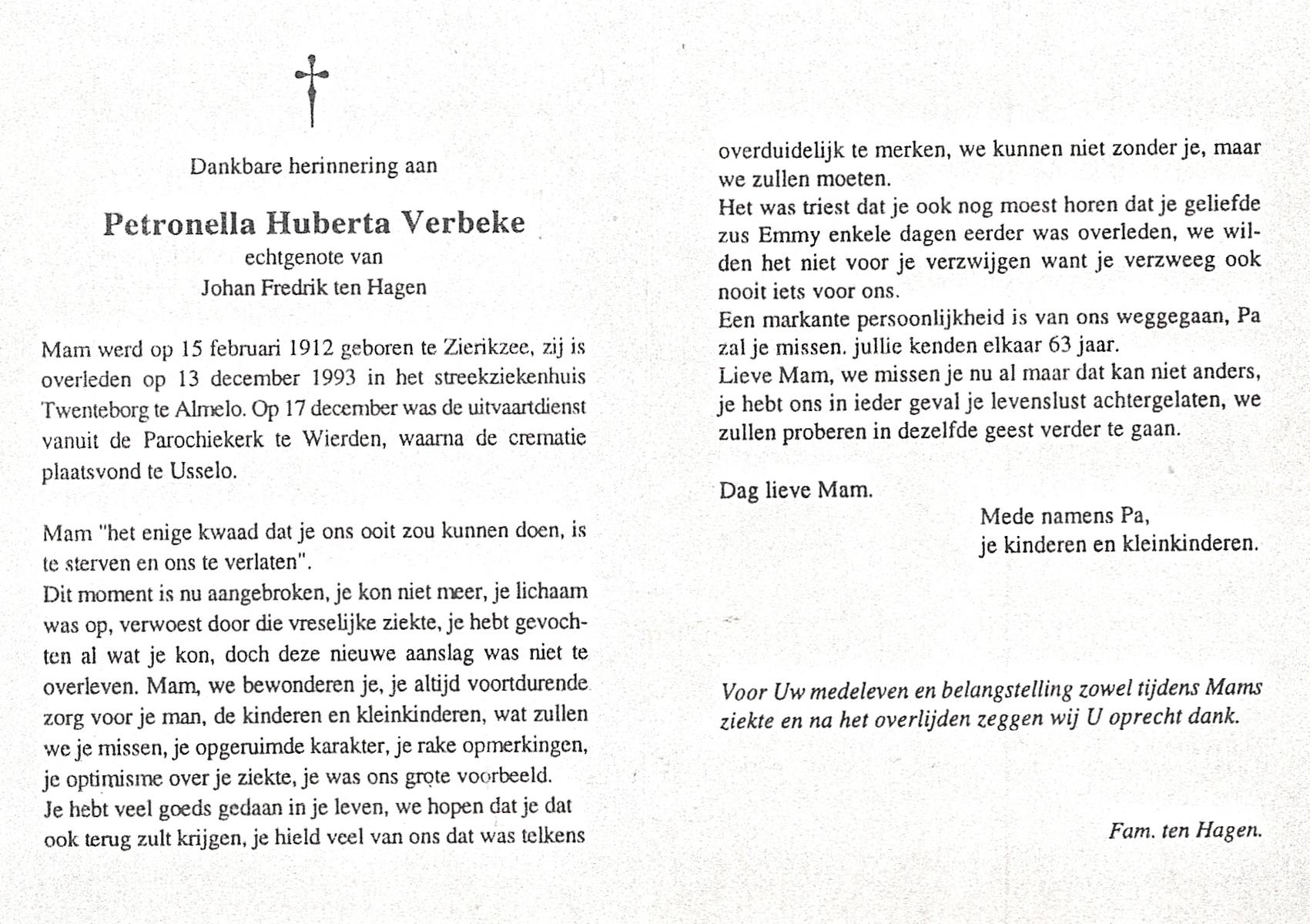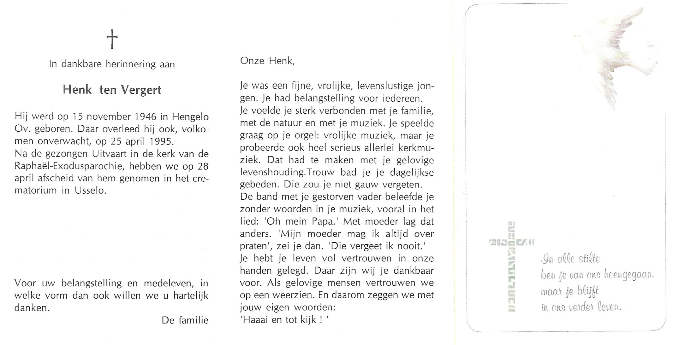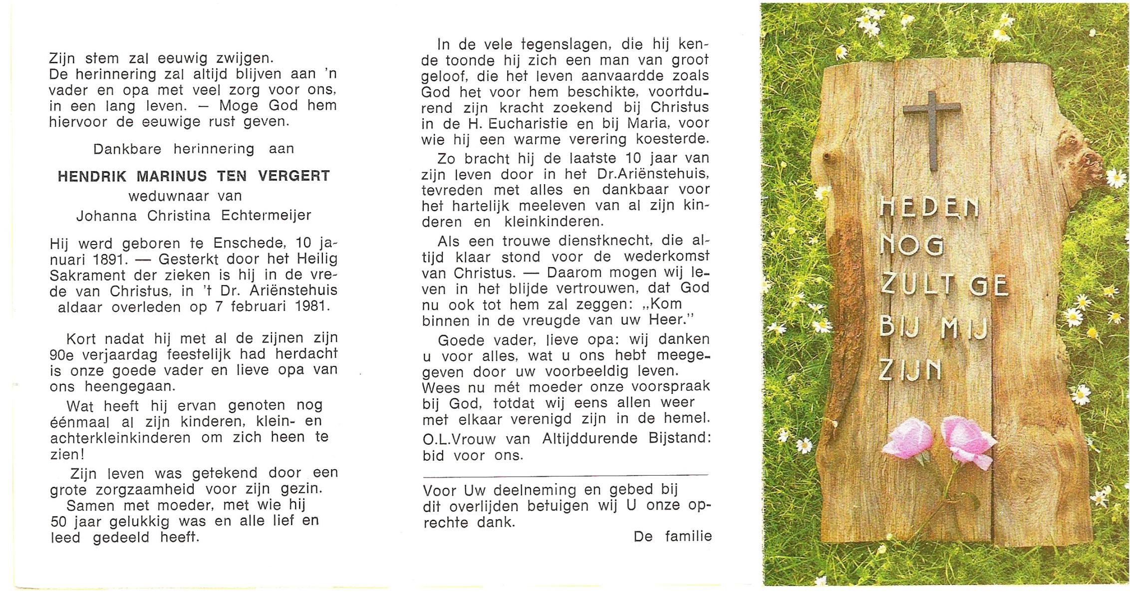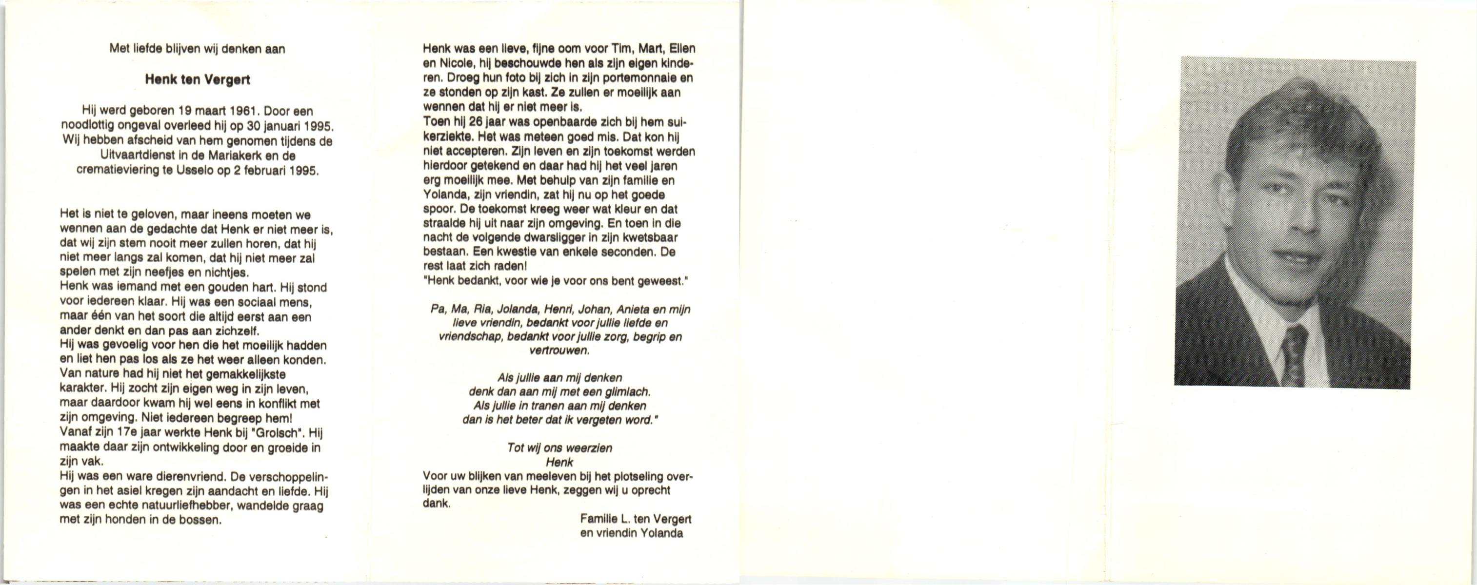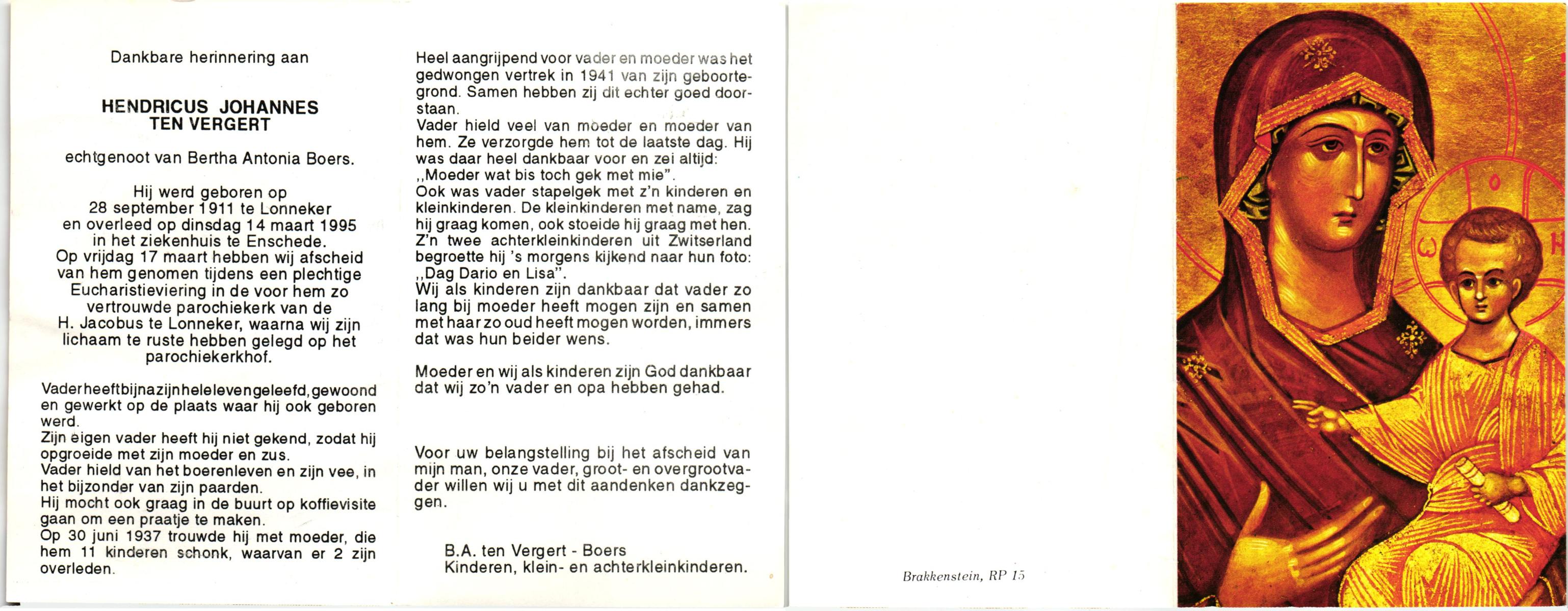 VELDE, ten, Hendrikus, geboren op 5-12-1915 te Albergen, overleden op 29-9-1993 te Almelo op 77-jarige leeftijd, begraven op 2-10-1993 te Zenderen.
